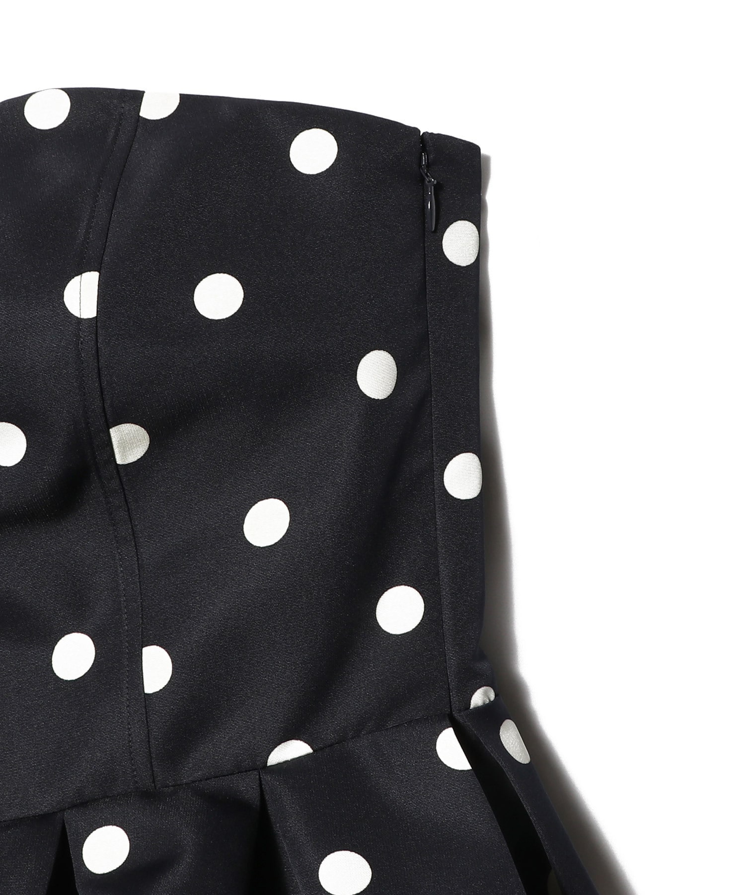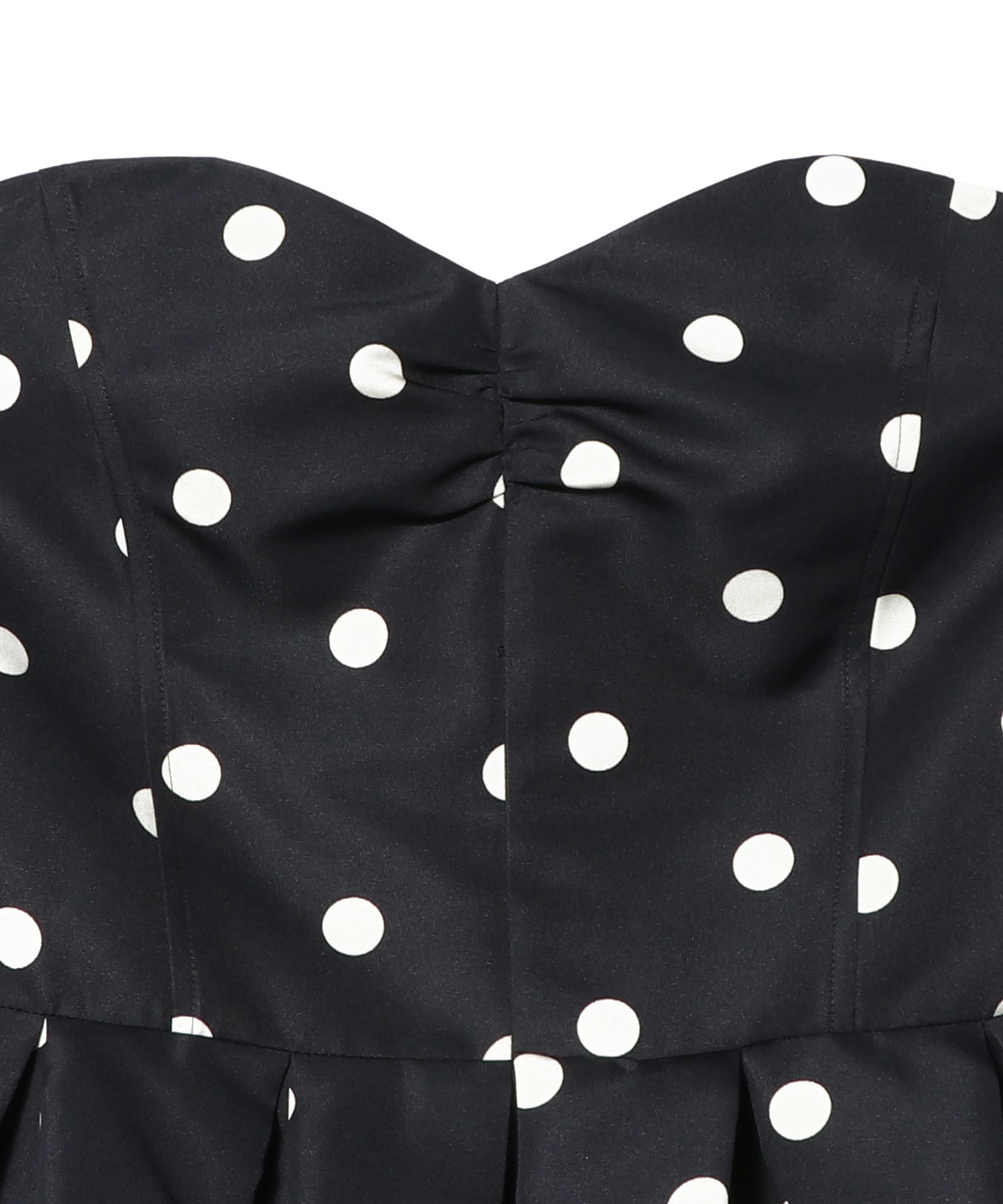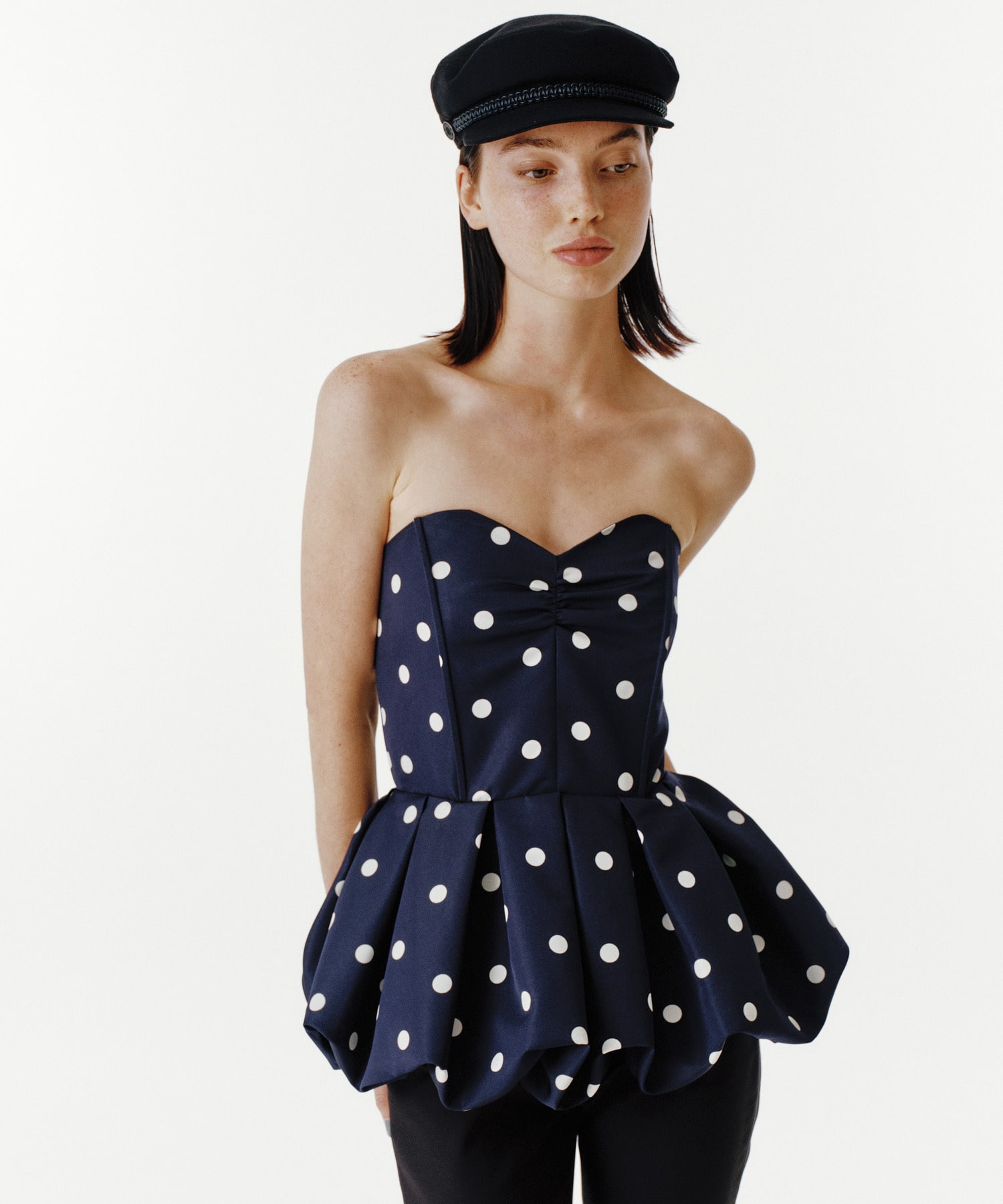 タイトなチューブトップにバルーンペプラムを組み合わせ、メリハリのあるシルエットに。