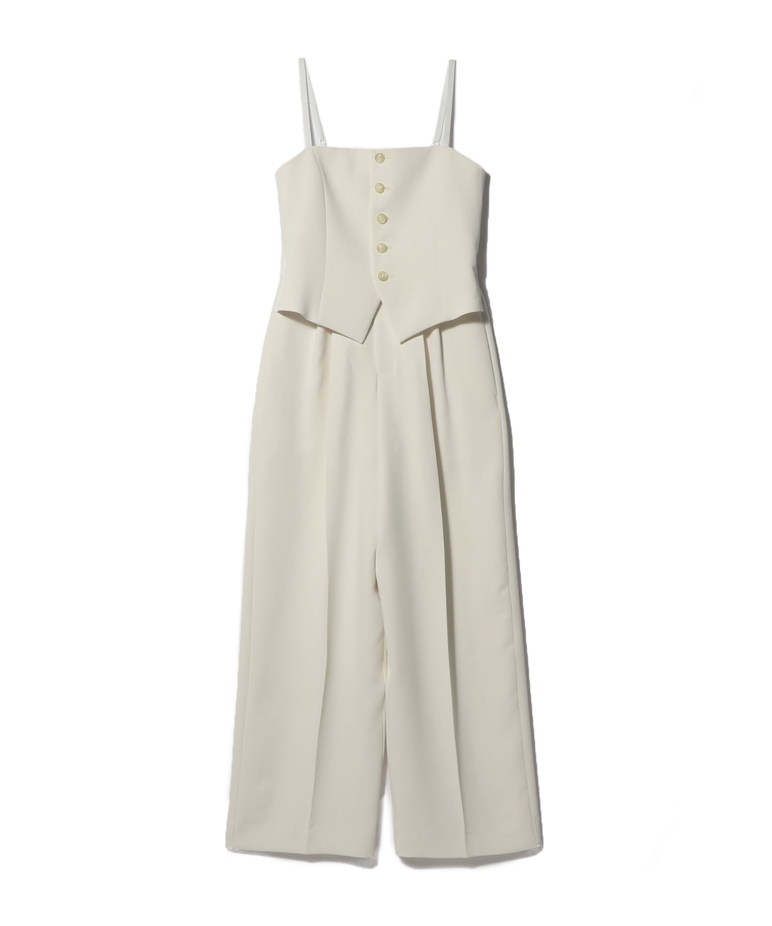 ジレとトラウザーをセットアップで着ているような、セパレート風デザインのジャンプスーツ。
