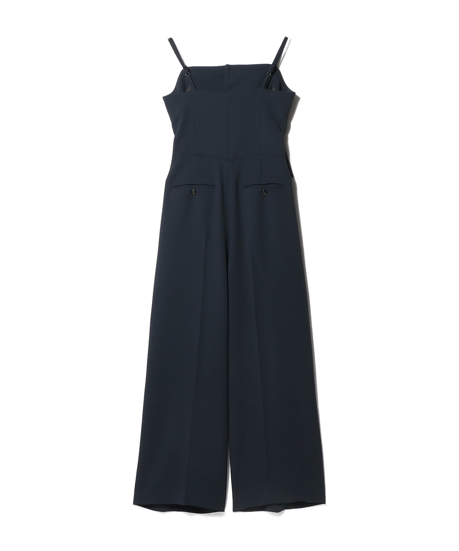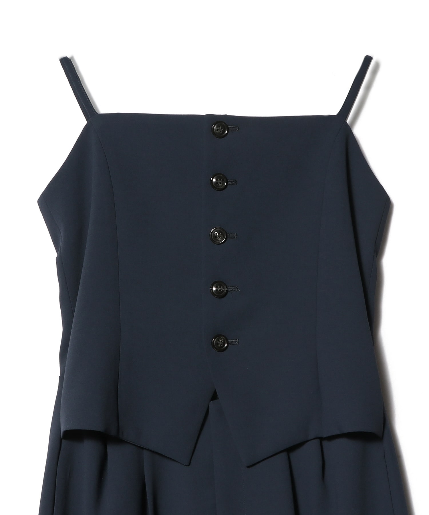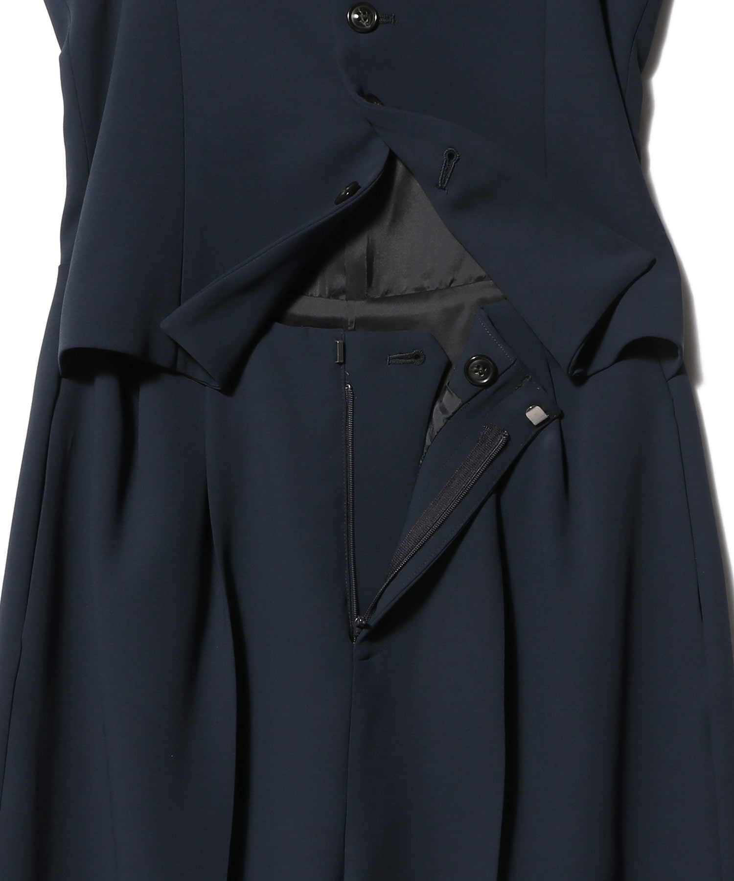 ジレとトラウザーをセットアップで着ているような、セパレート風デザインのジャンプスーツ。