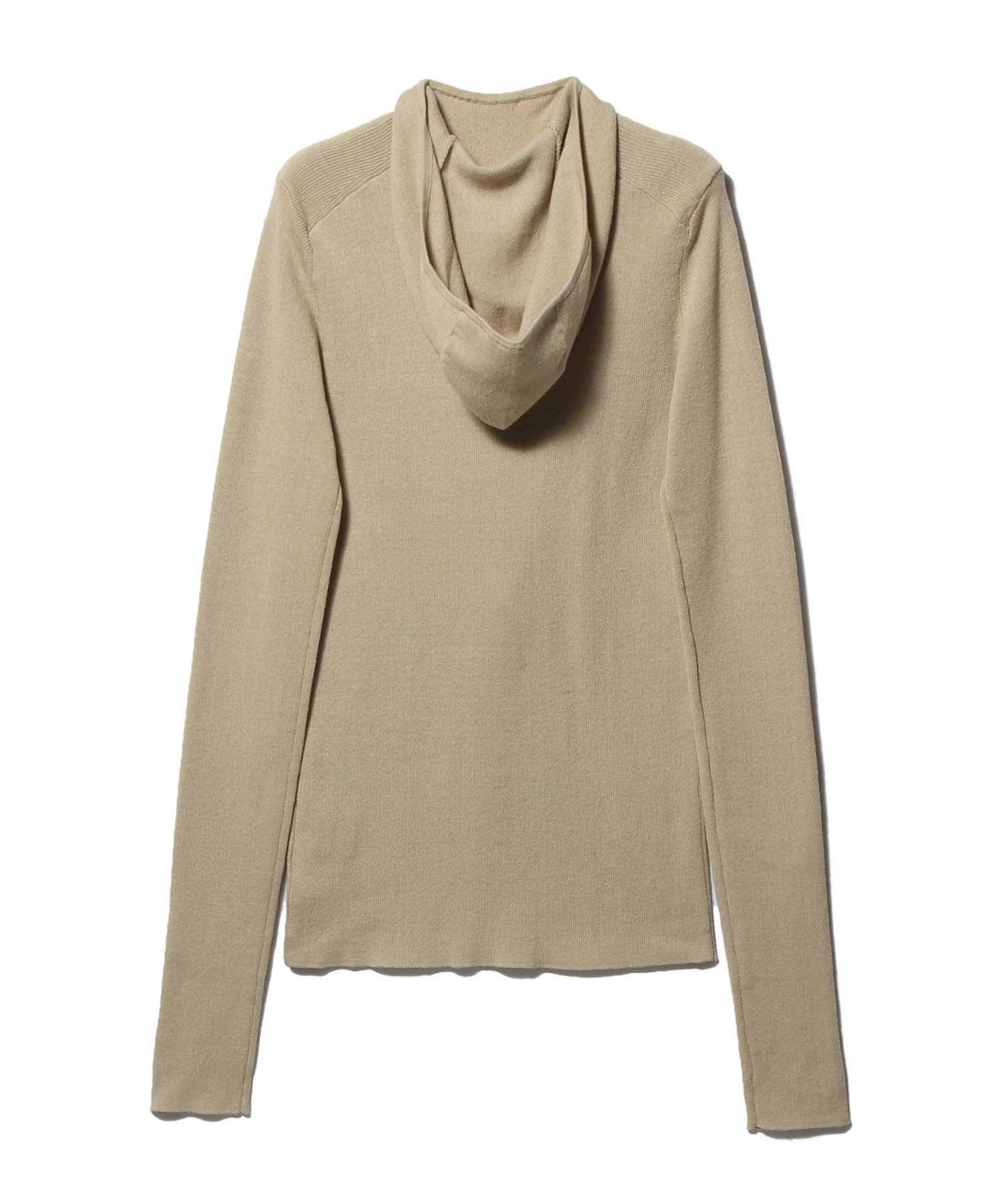 顔に沿うようなタイトフードと、高めに設定されたハイネックデザインが印象的な一枚。