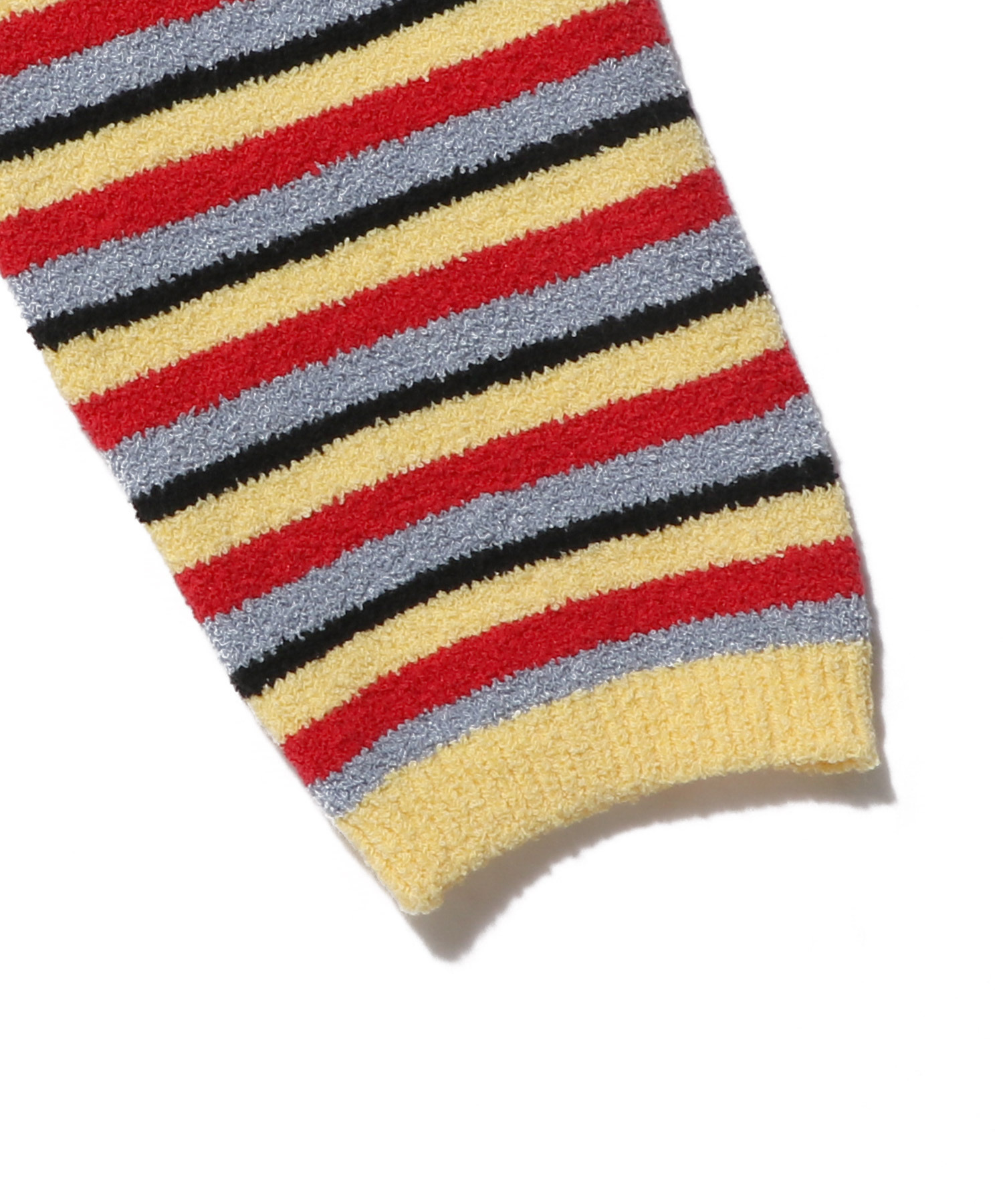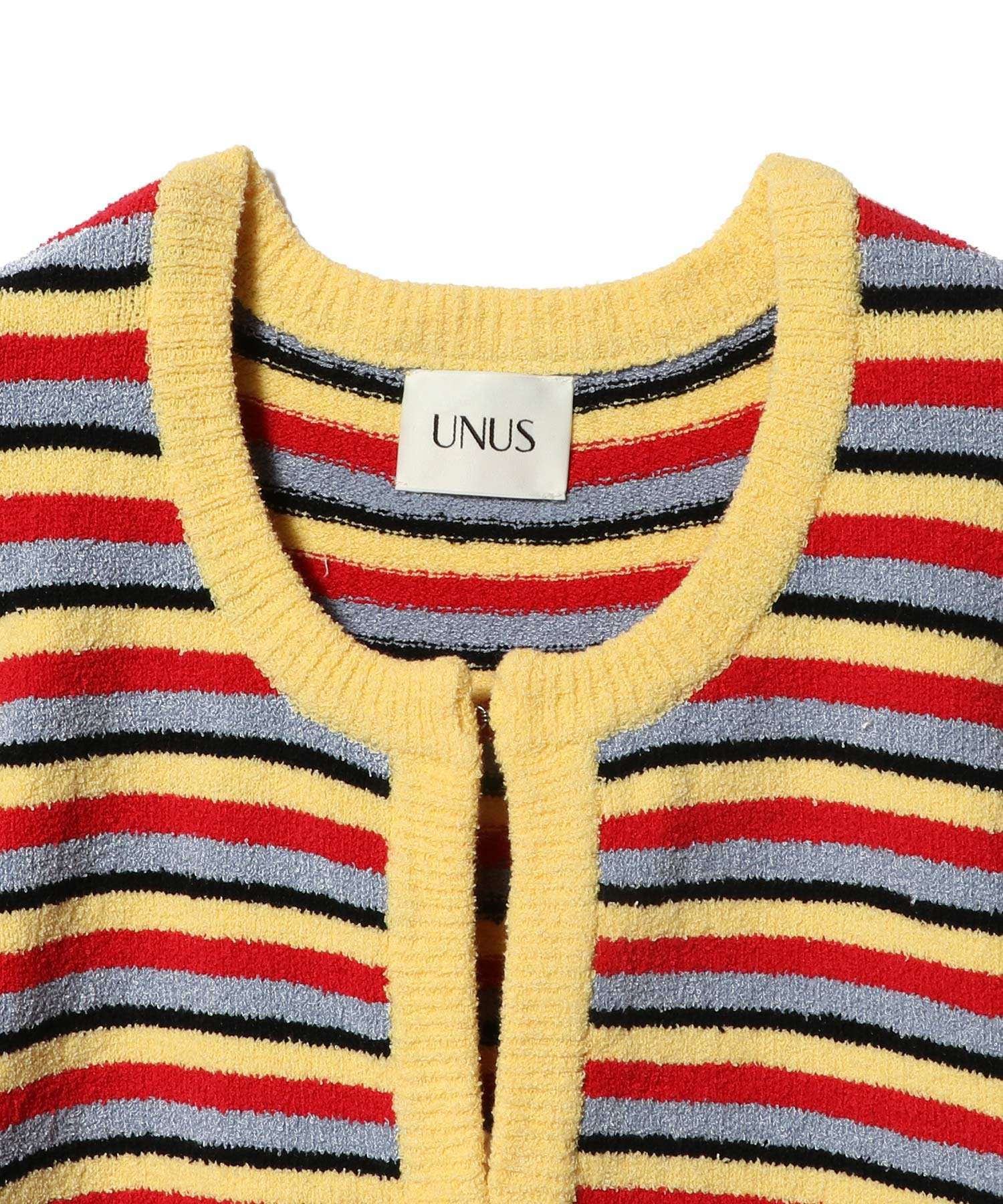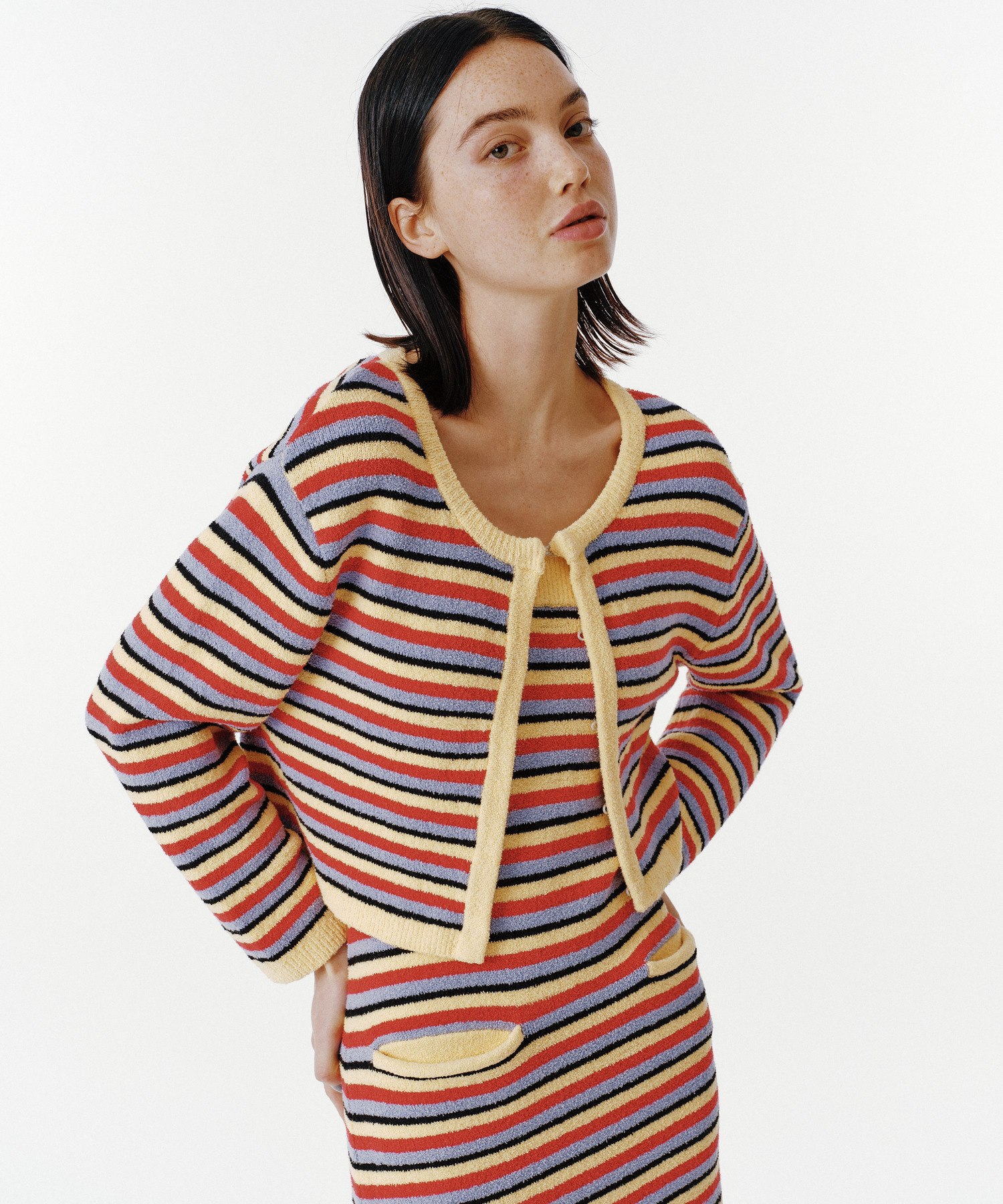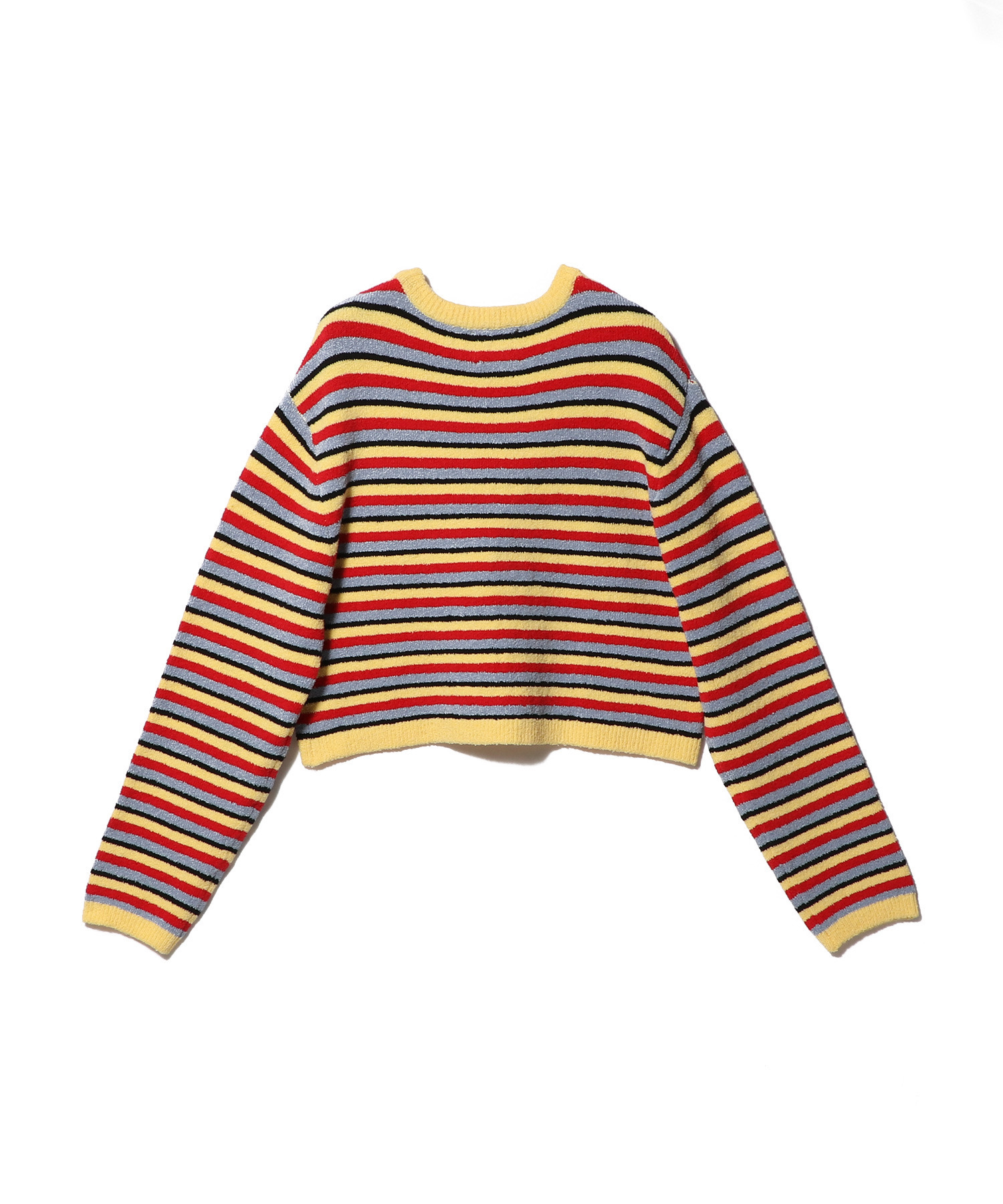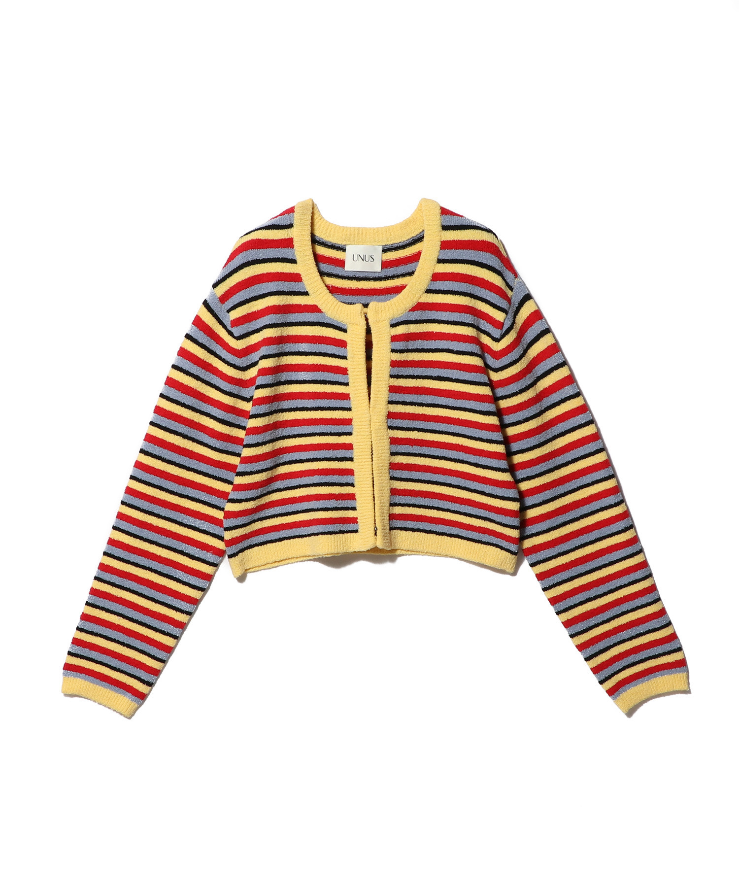 マルチボーダーが目を惹く、クロップド丈のニットボレロ。