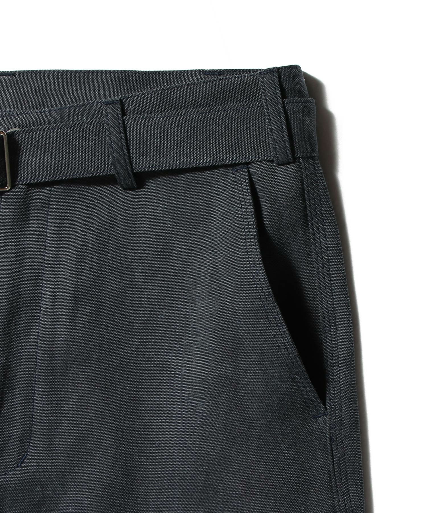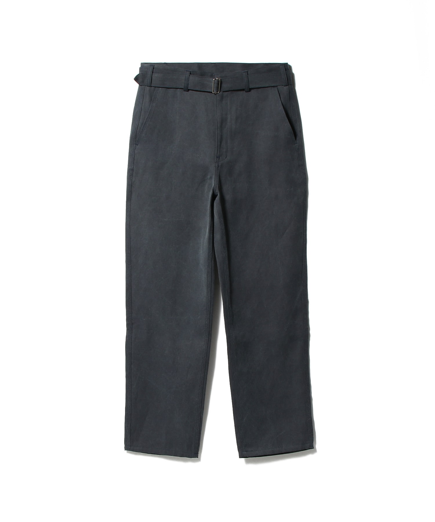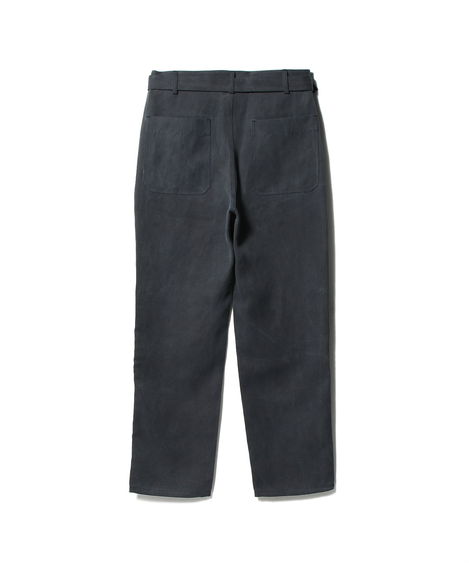 トラベルブルーのストレートレッグパンツ。共布のベルト、サイドポケット、バックパッチポケット付き。