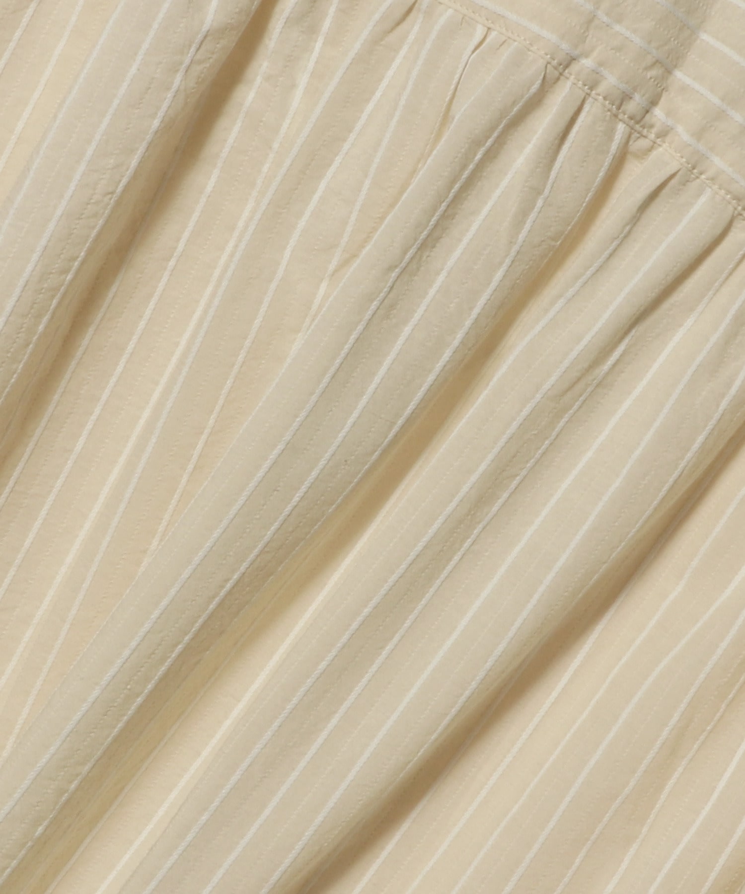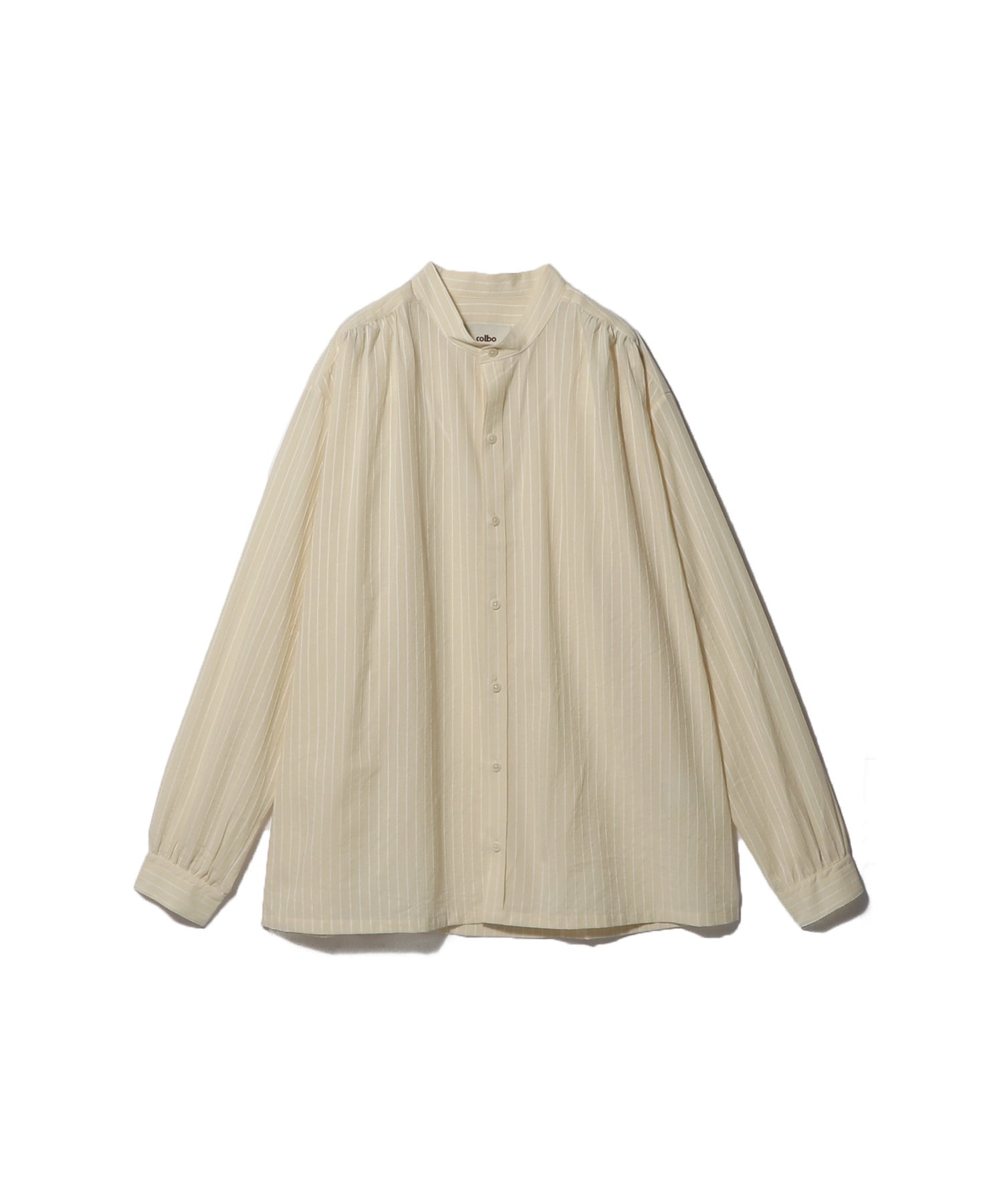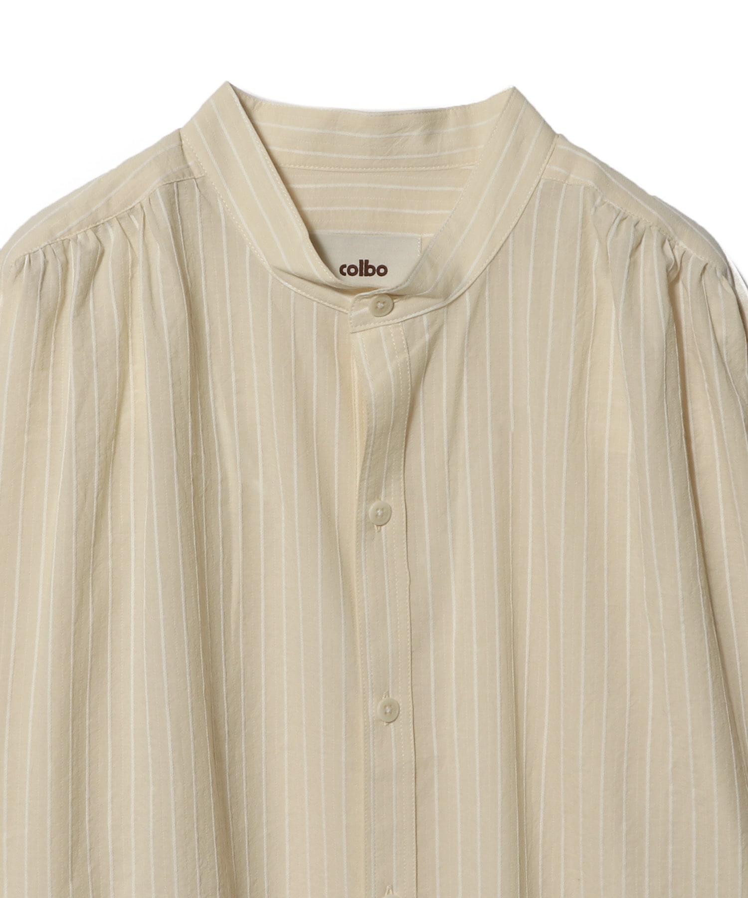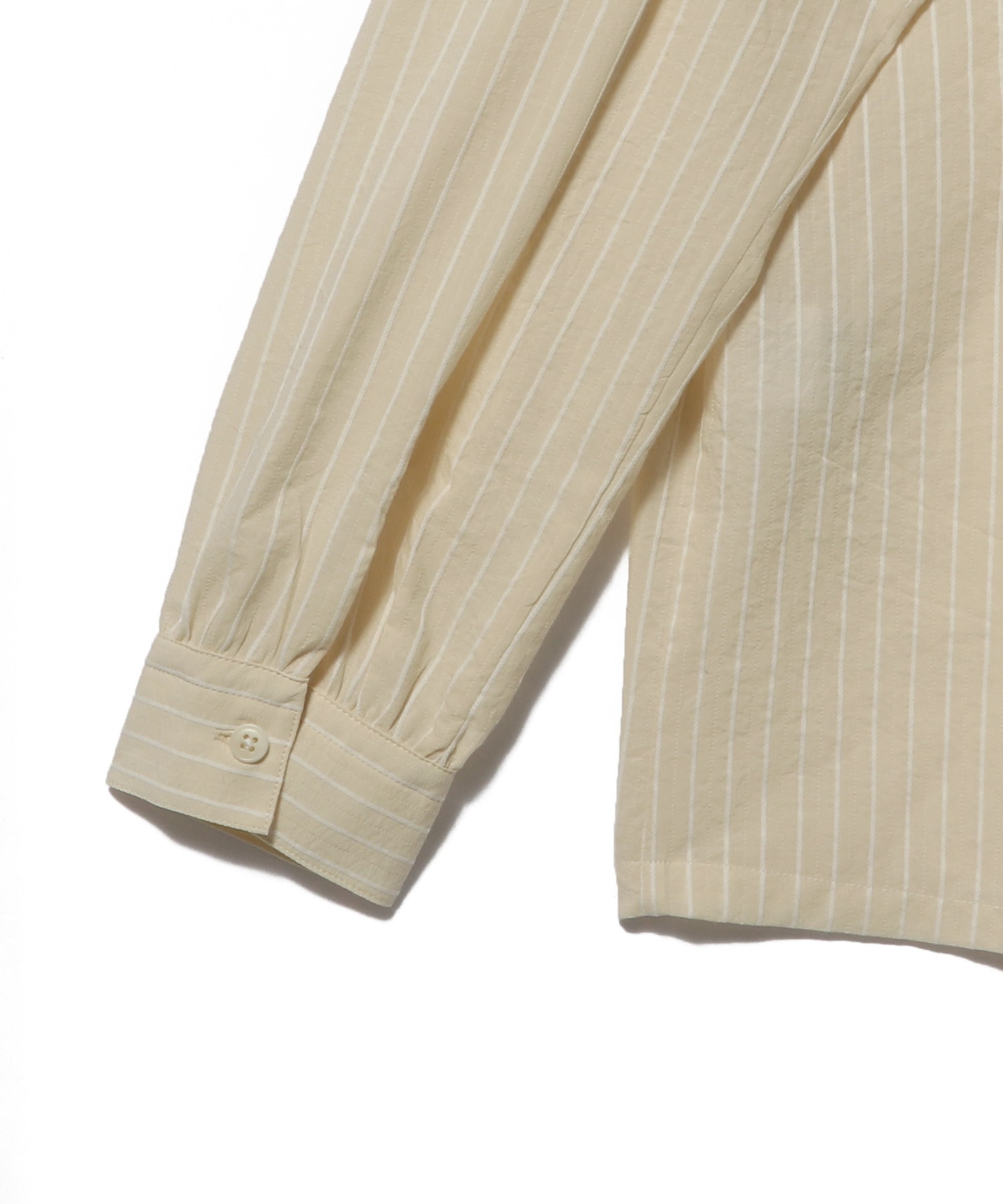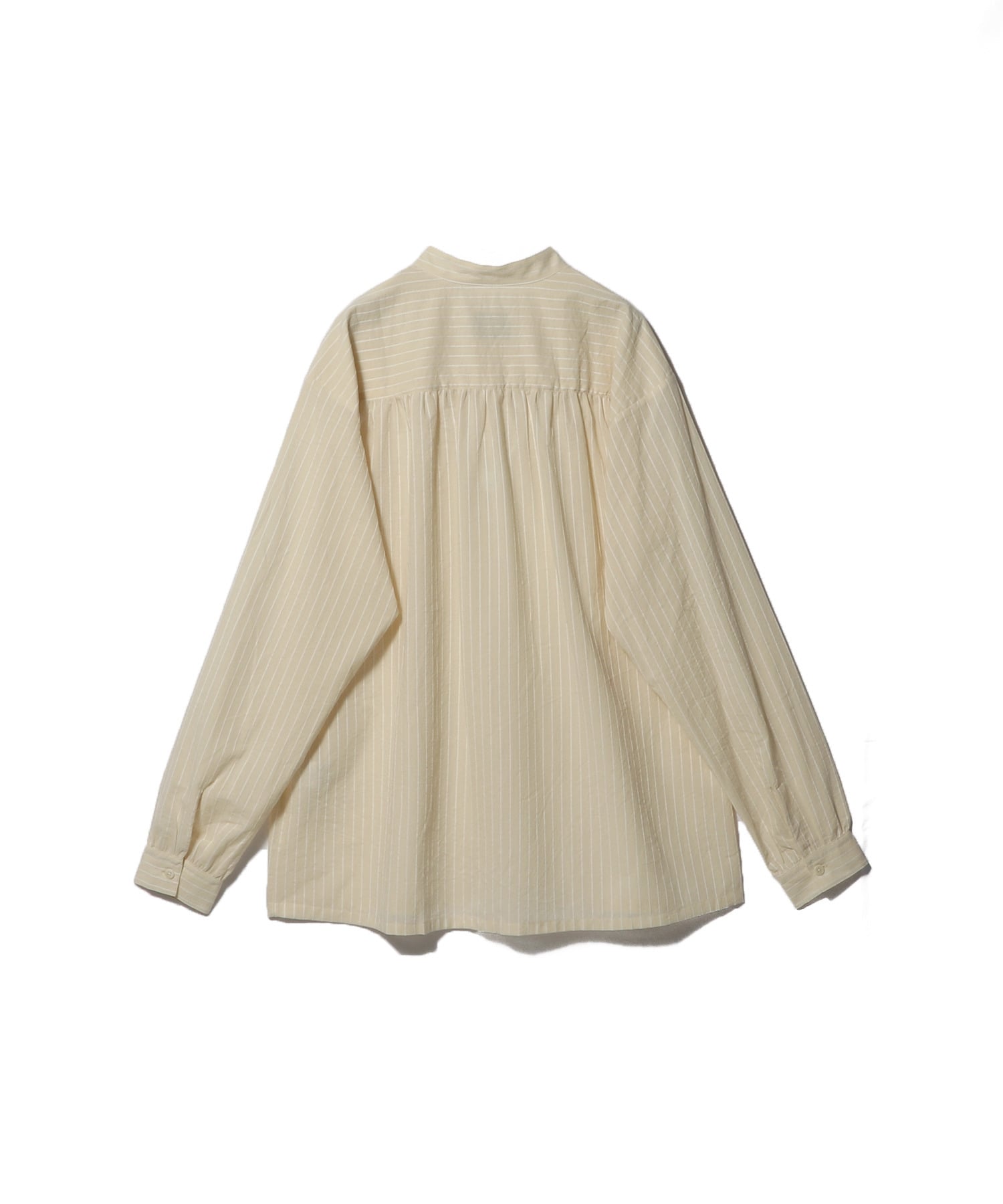 ストライプ柄コットン素材を使用したバンドカラーのロングスリーブシャツ。背中と袖口には繊細なタックがあしらわれています。