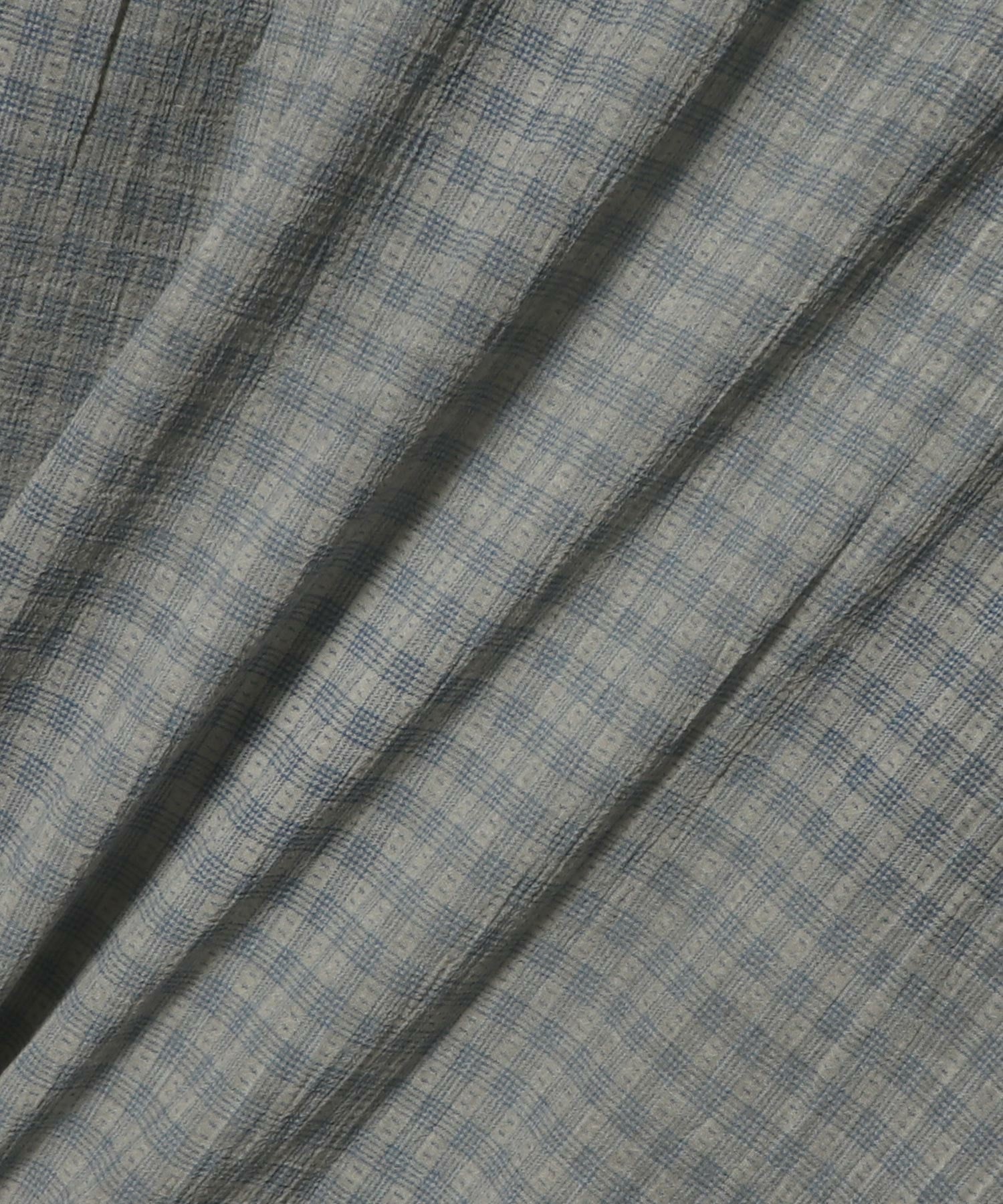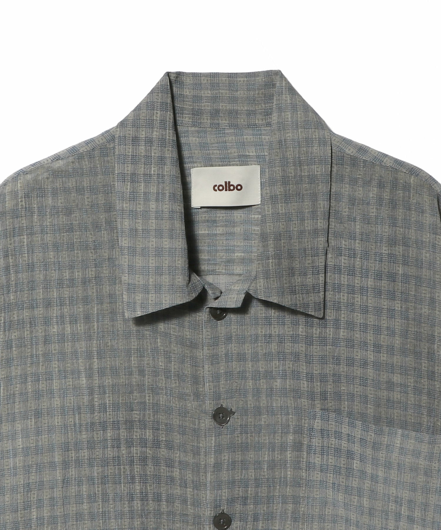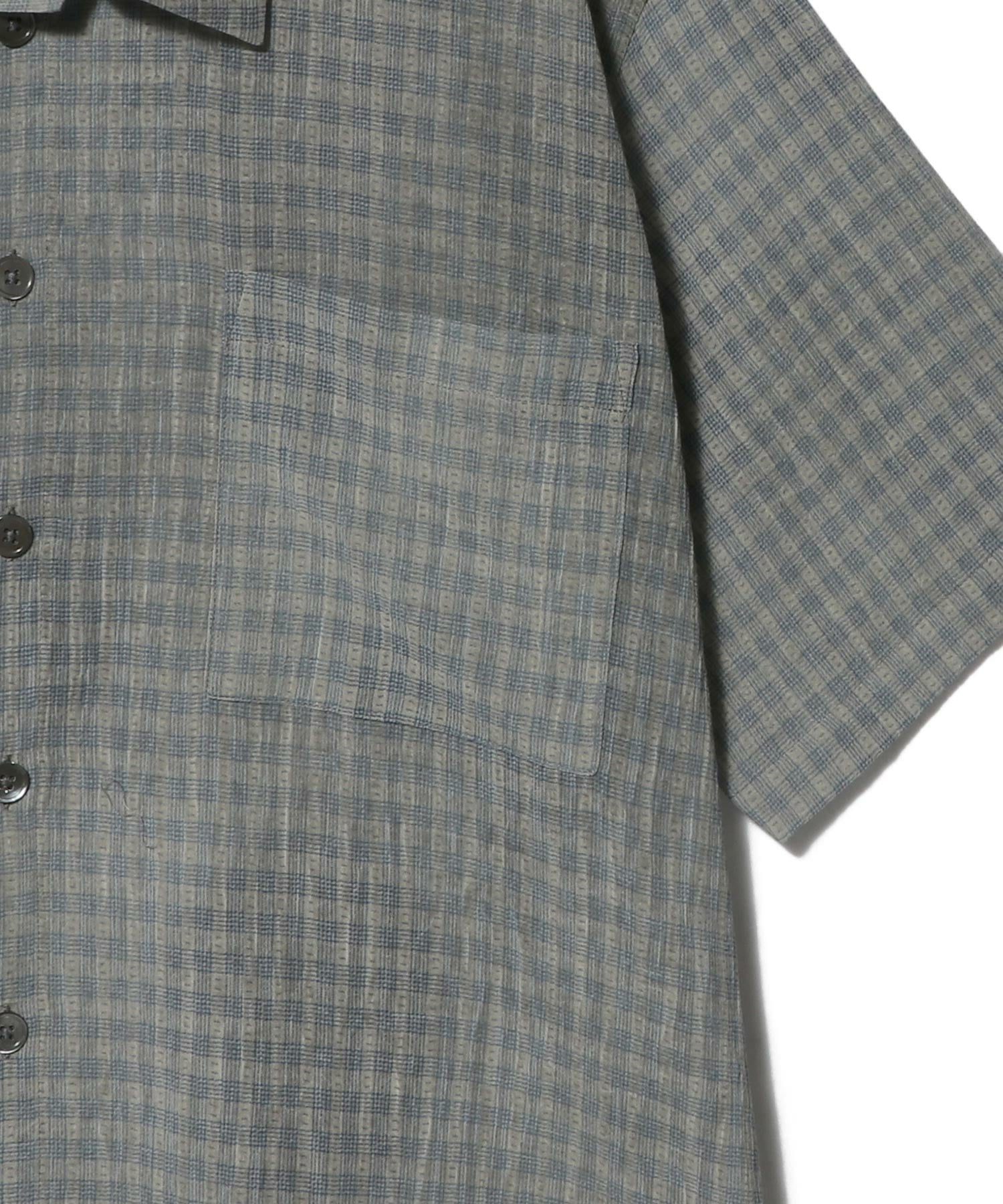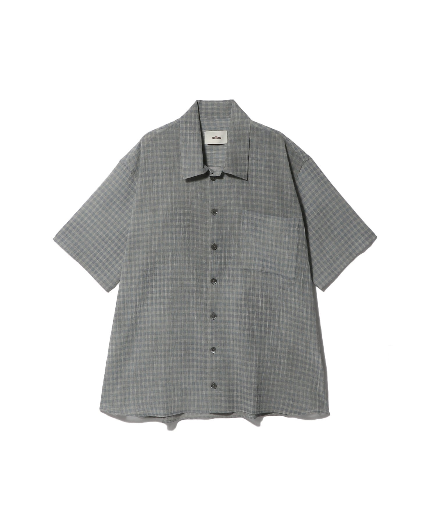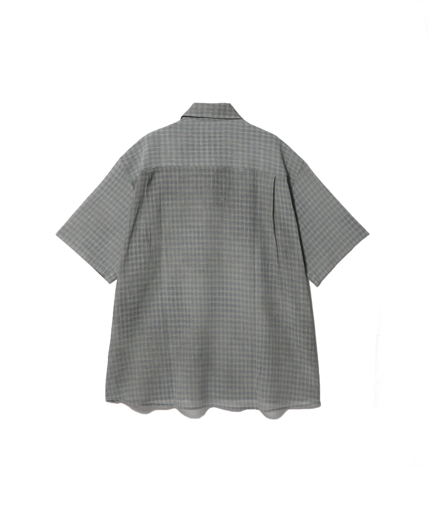 ダメージ加工を施したブルーの、ゆったりとしたドレープ感のある半袖ボタンシャツ。背面に2つのプリーツ、スプレッドカラーが特徴です。