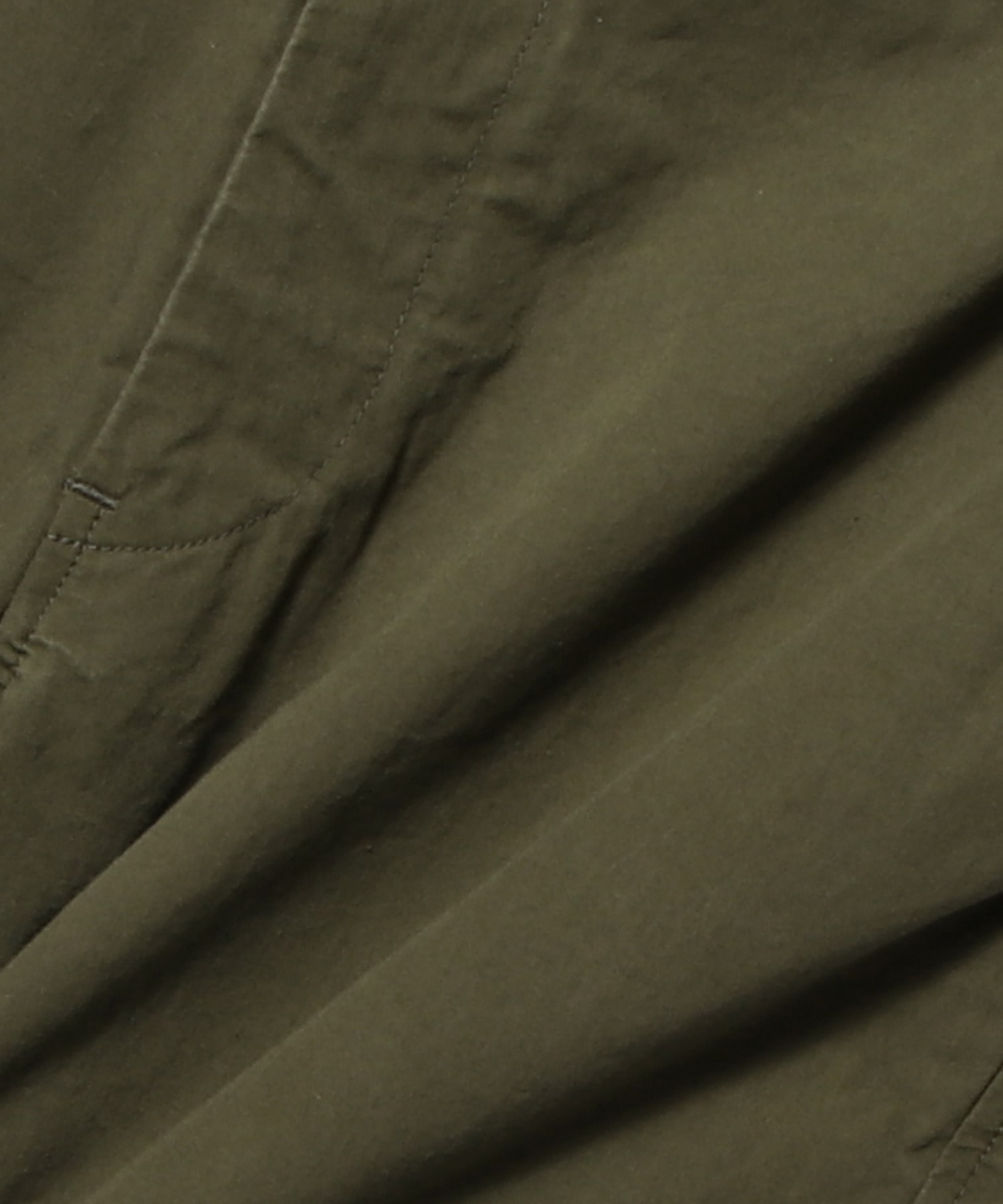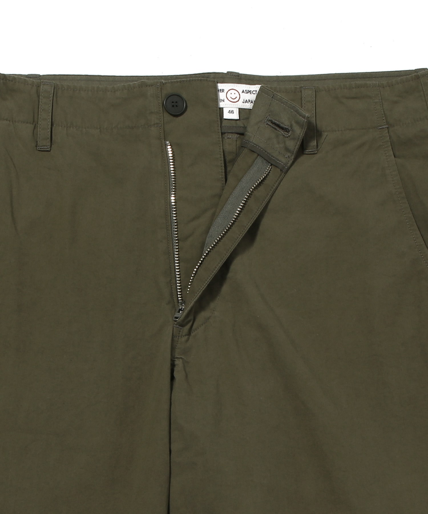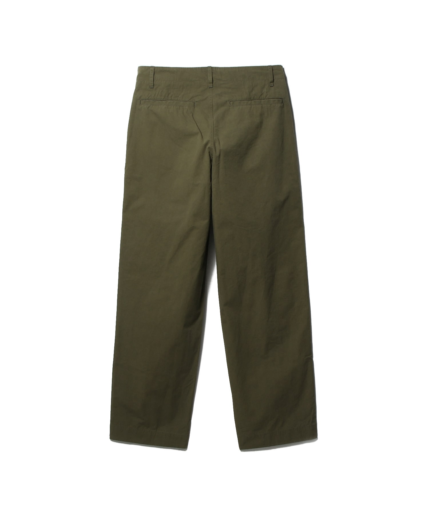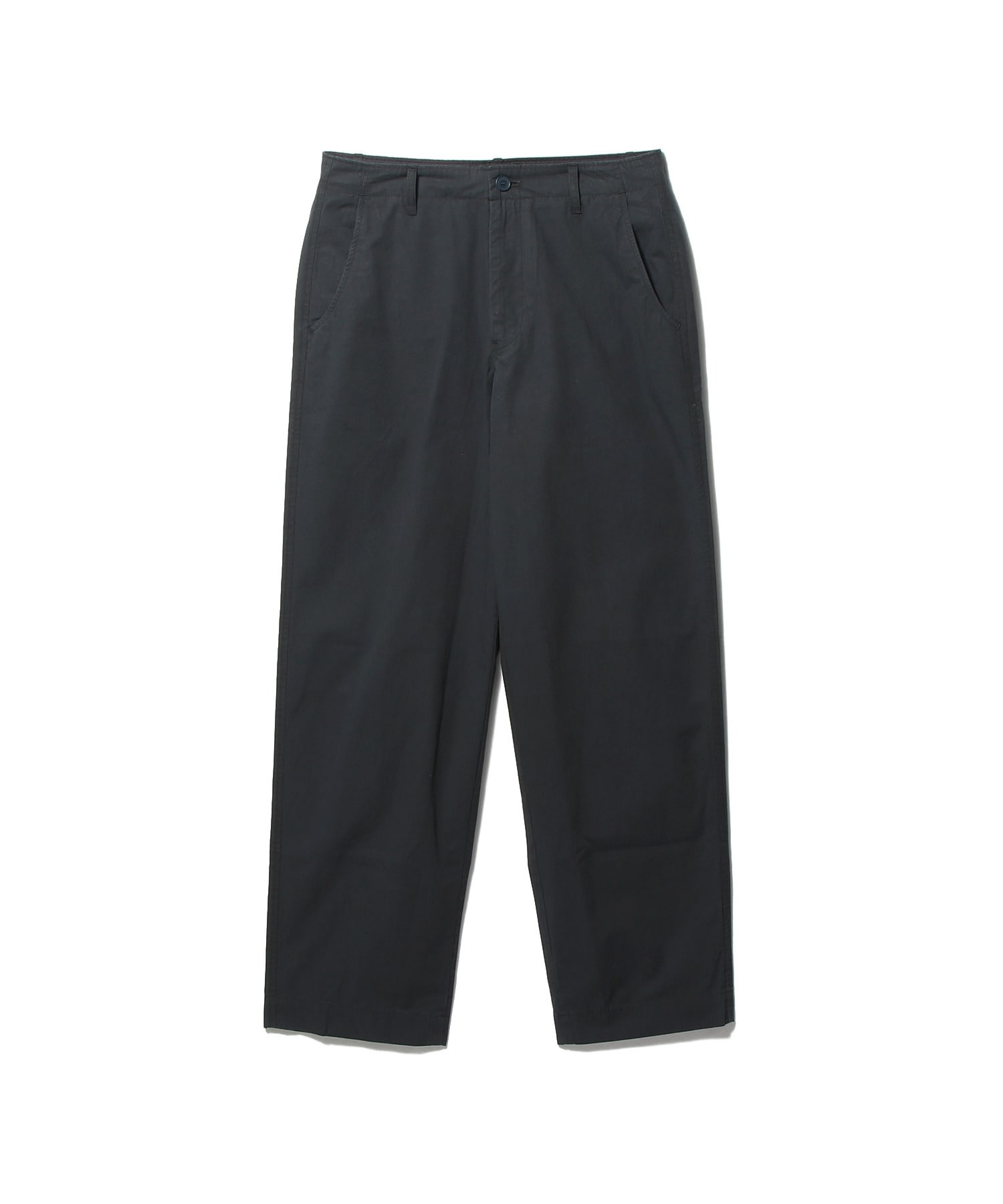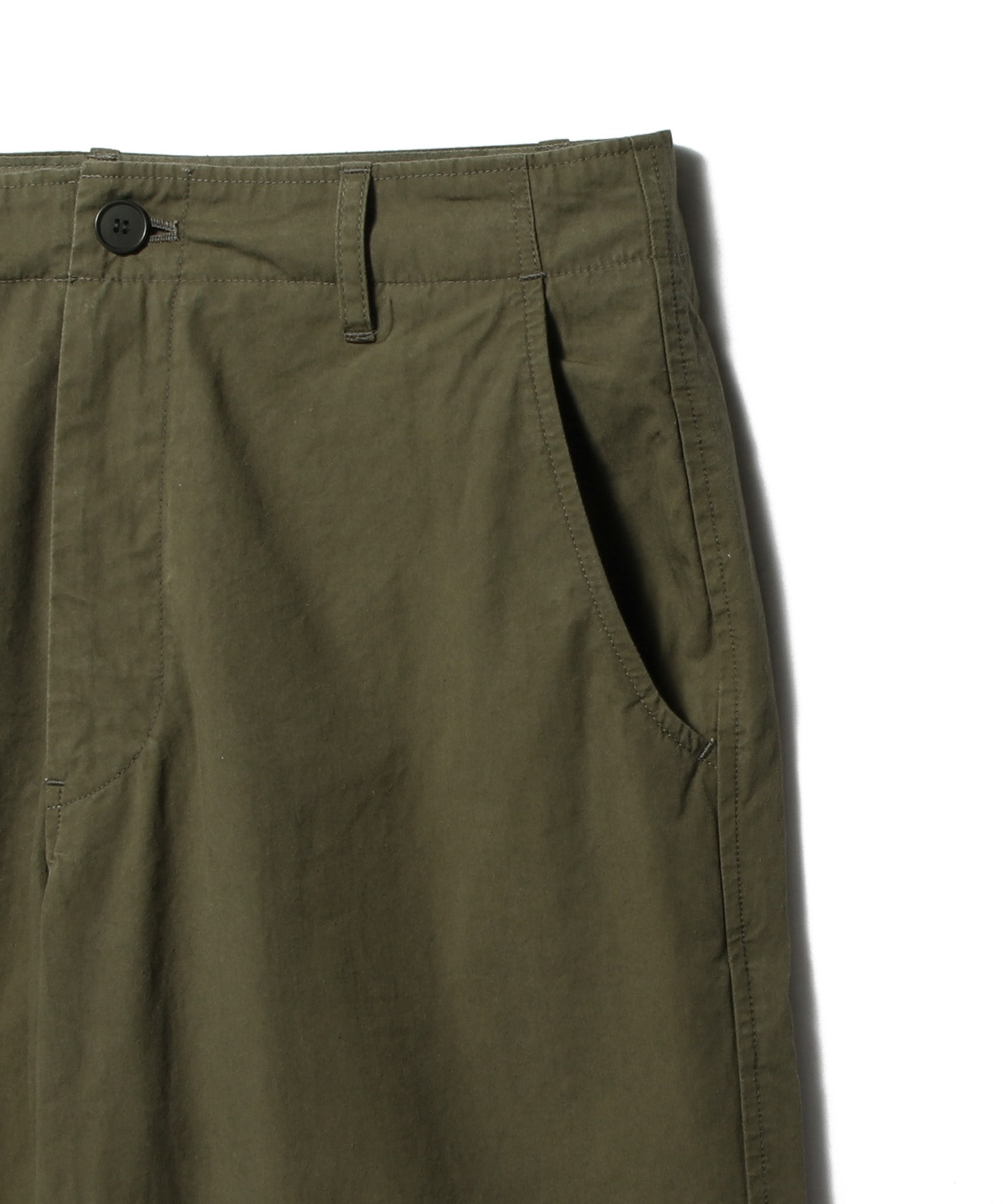 日本製。100%コットンを地元で織り上げ、梳毛加工を施した生地を使用。洗練されたパリッとした手触りが特徴です。ウエストバンドは自布で延長され、シンプルなフロントボタンとファスナーで留める仕様。フロントには斜めポケット、バックにはウェルトポケットを配しました。リラックスしたややストレートシルエットで、日常の着心地を追求しています。