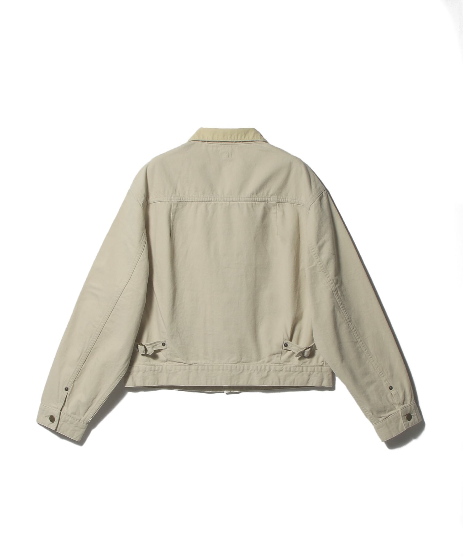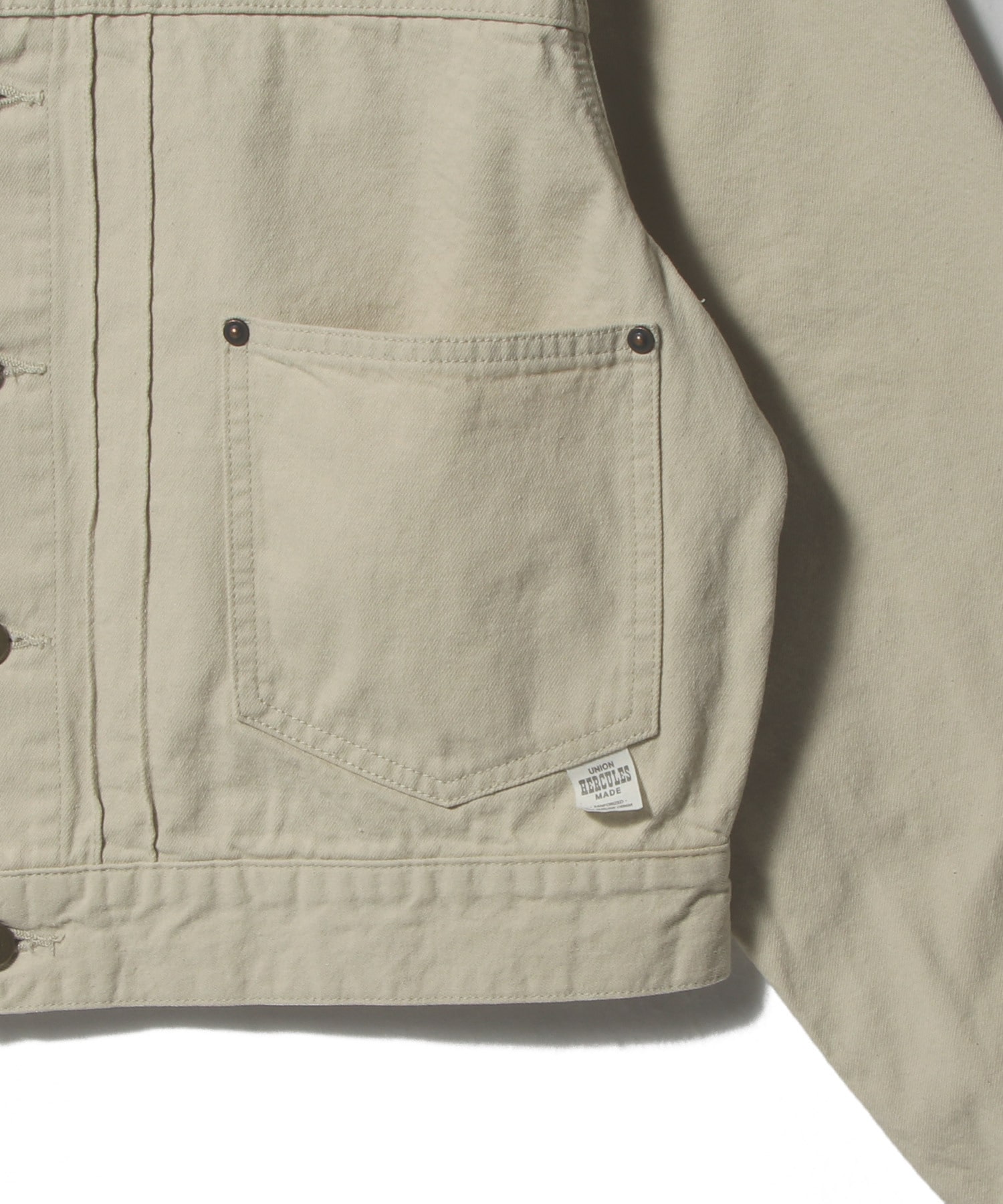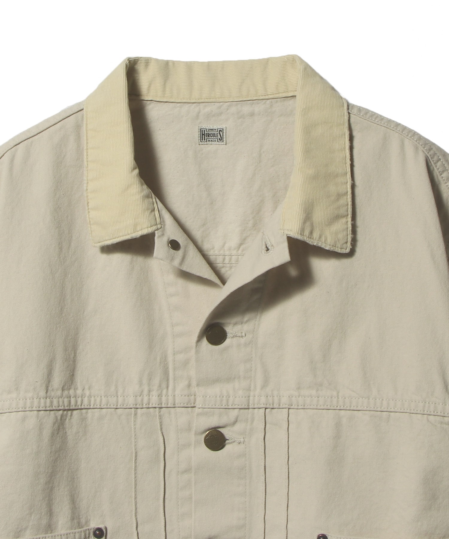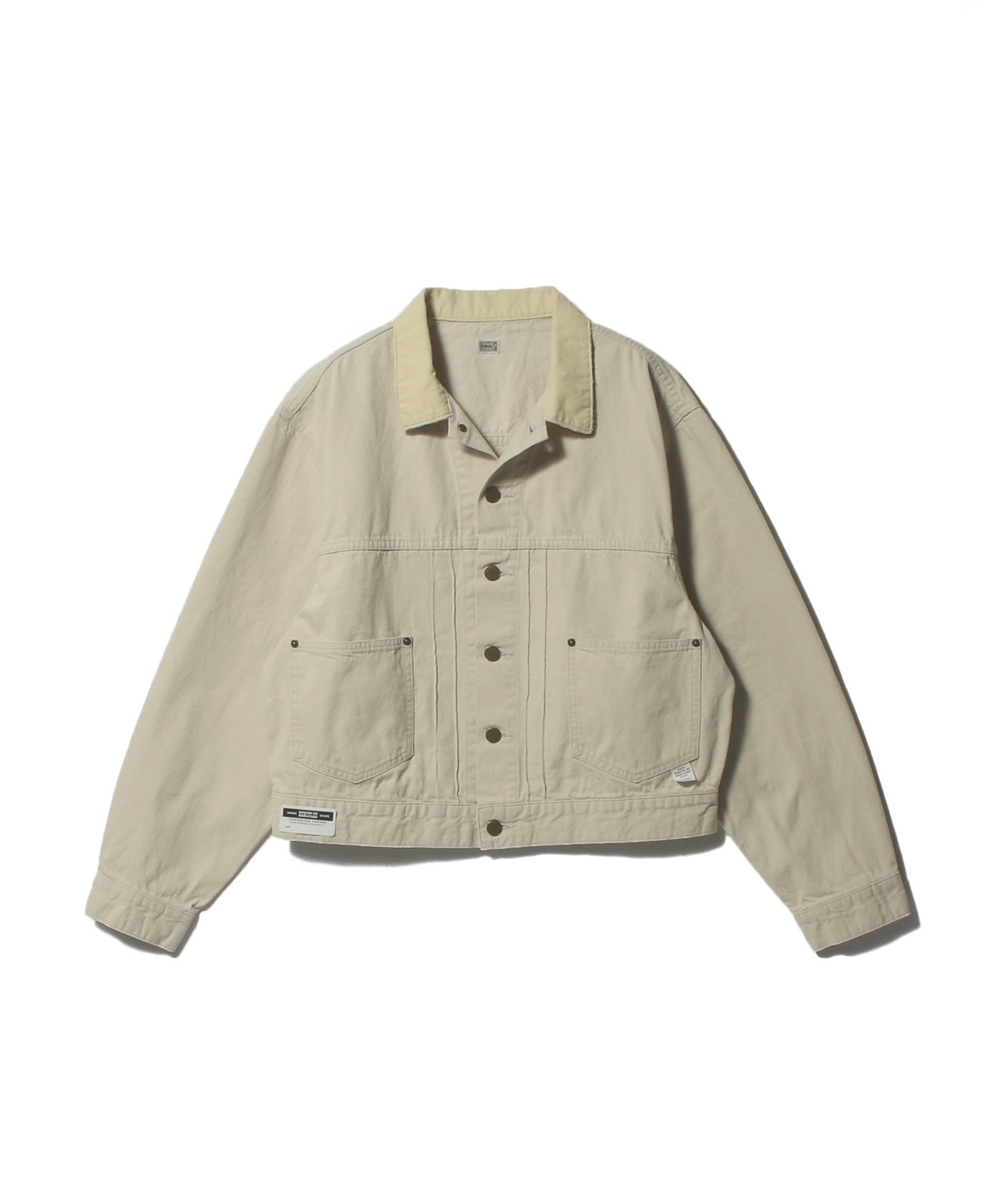 当時流行していたデニムジャケットをベースにバランスよくディティールを削ぎ落し、ワークウェアのアイテムによく見られるようなイメージで衿にコーデュロイを使用しています。