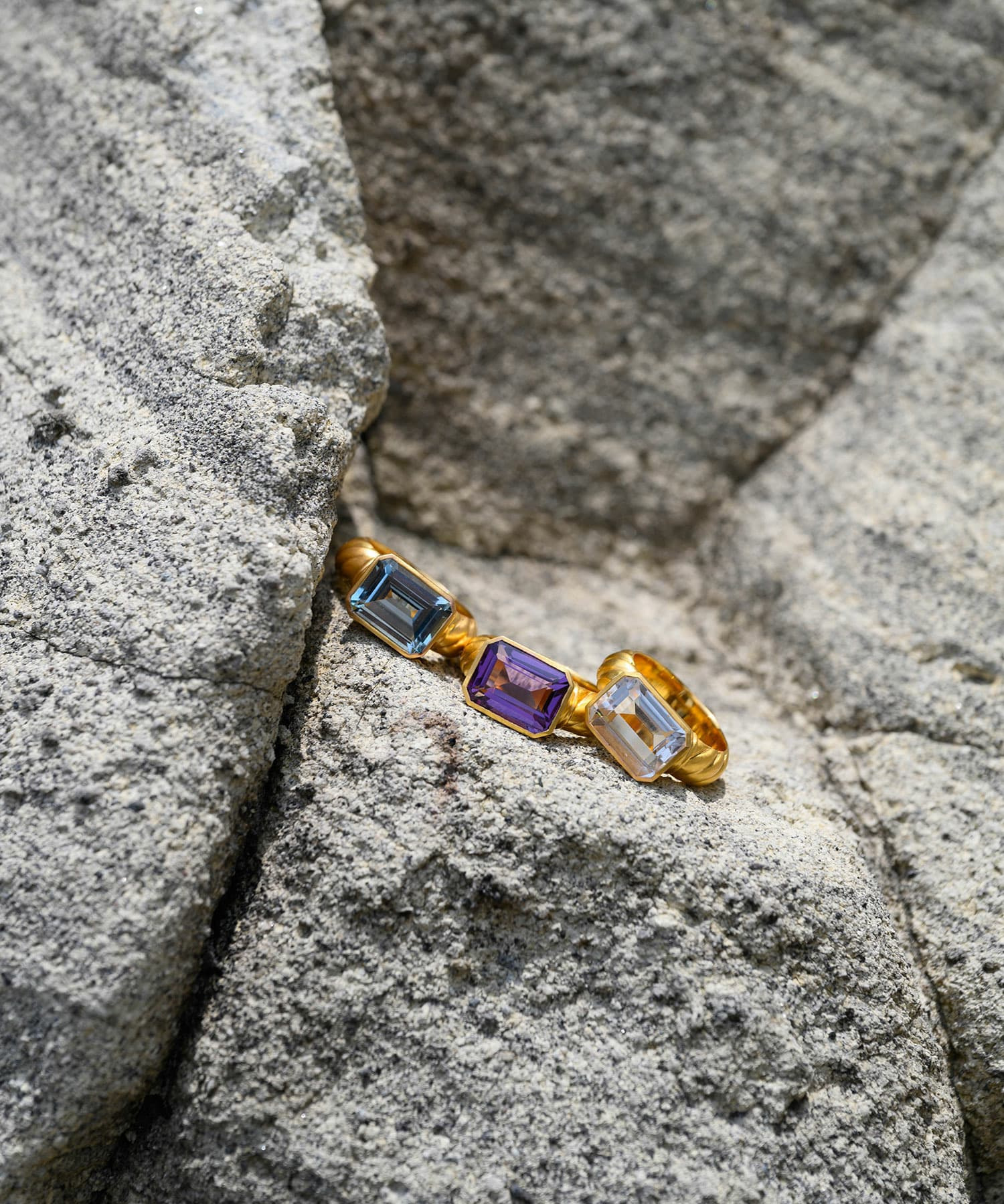 マルチカラーにはクリアクォーツ、ライトブルーにはブルートパーズ、ライラックにはアメジストの天然石を使用。