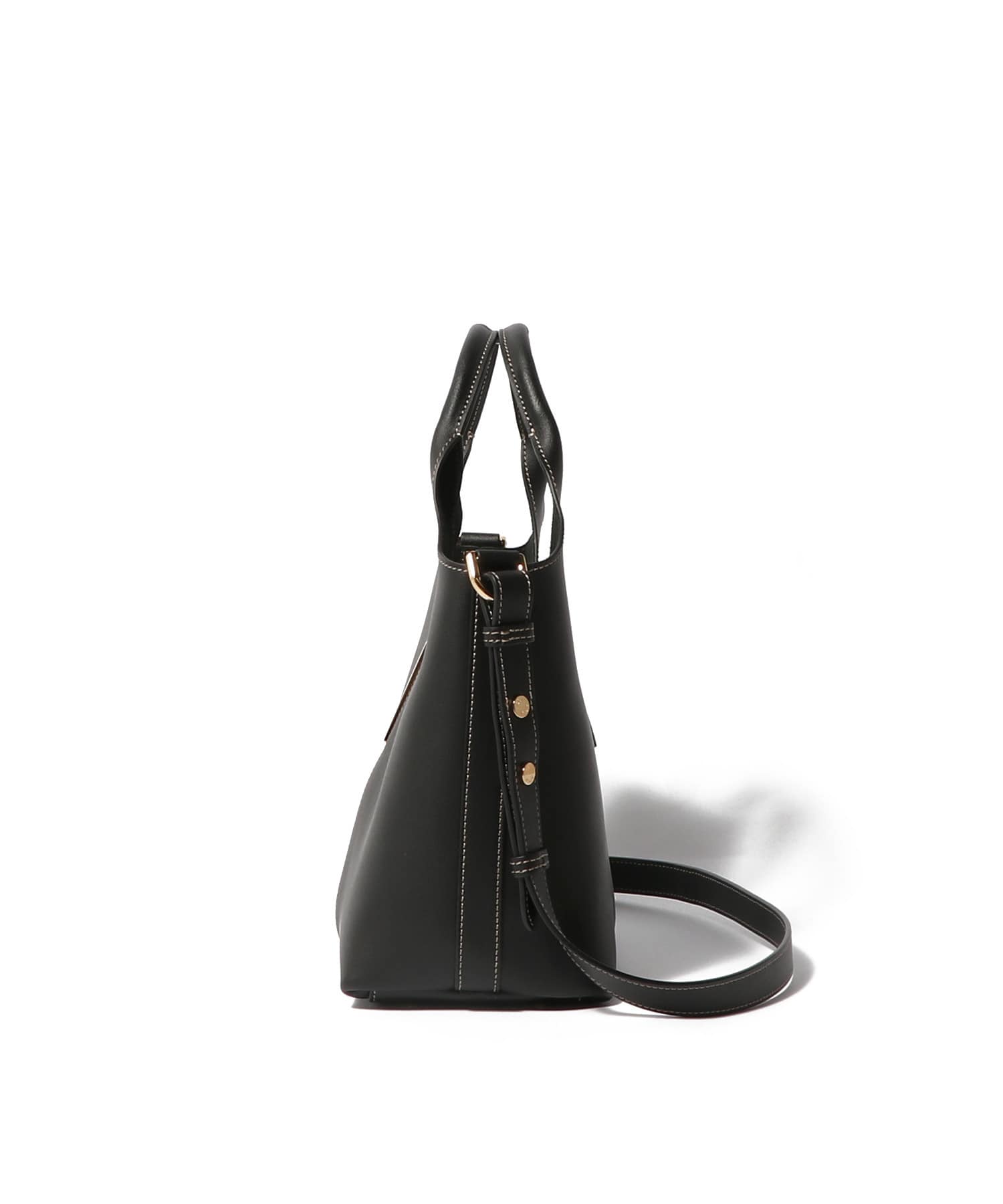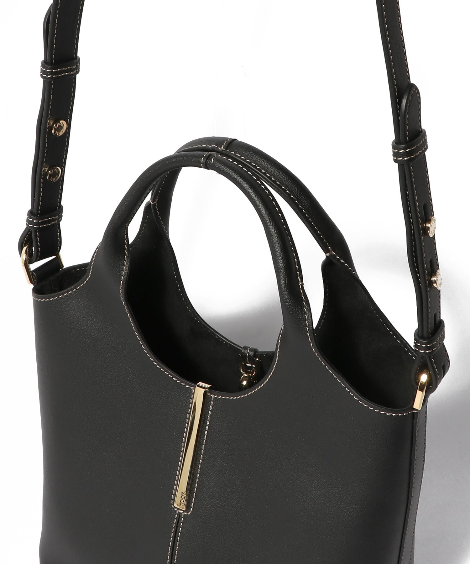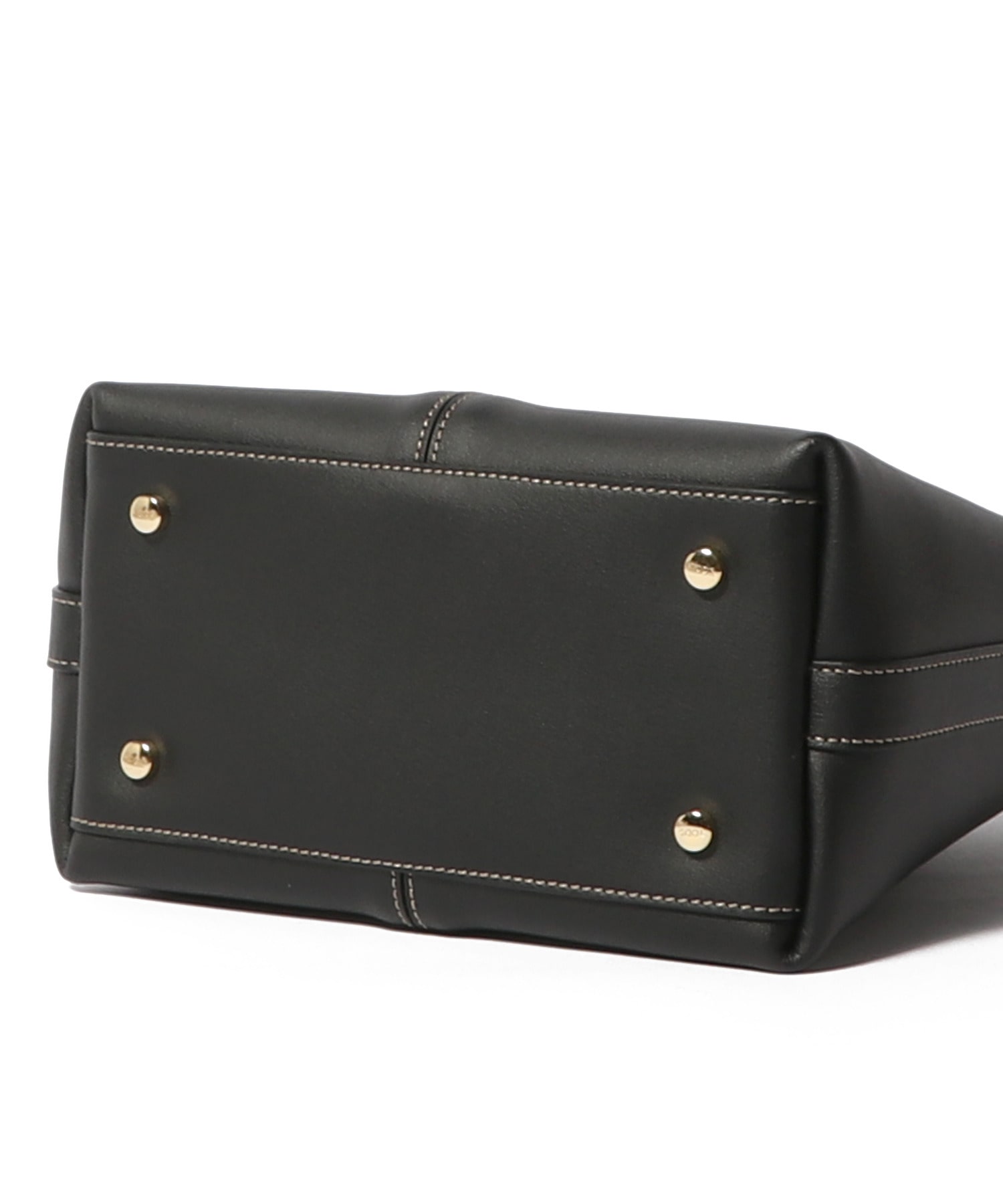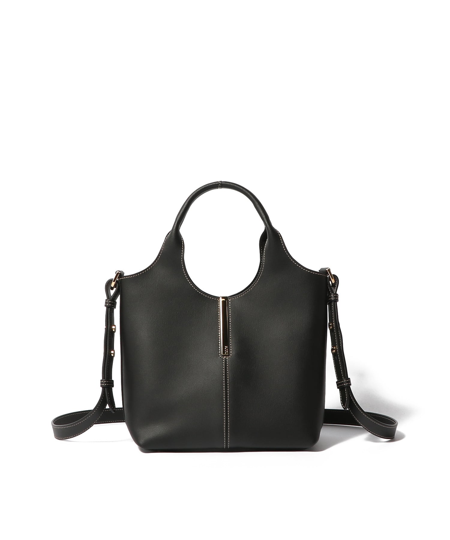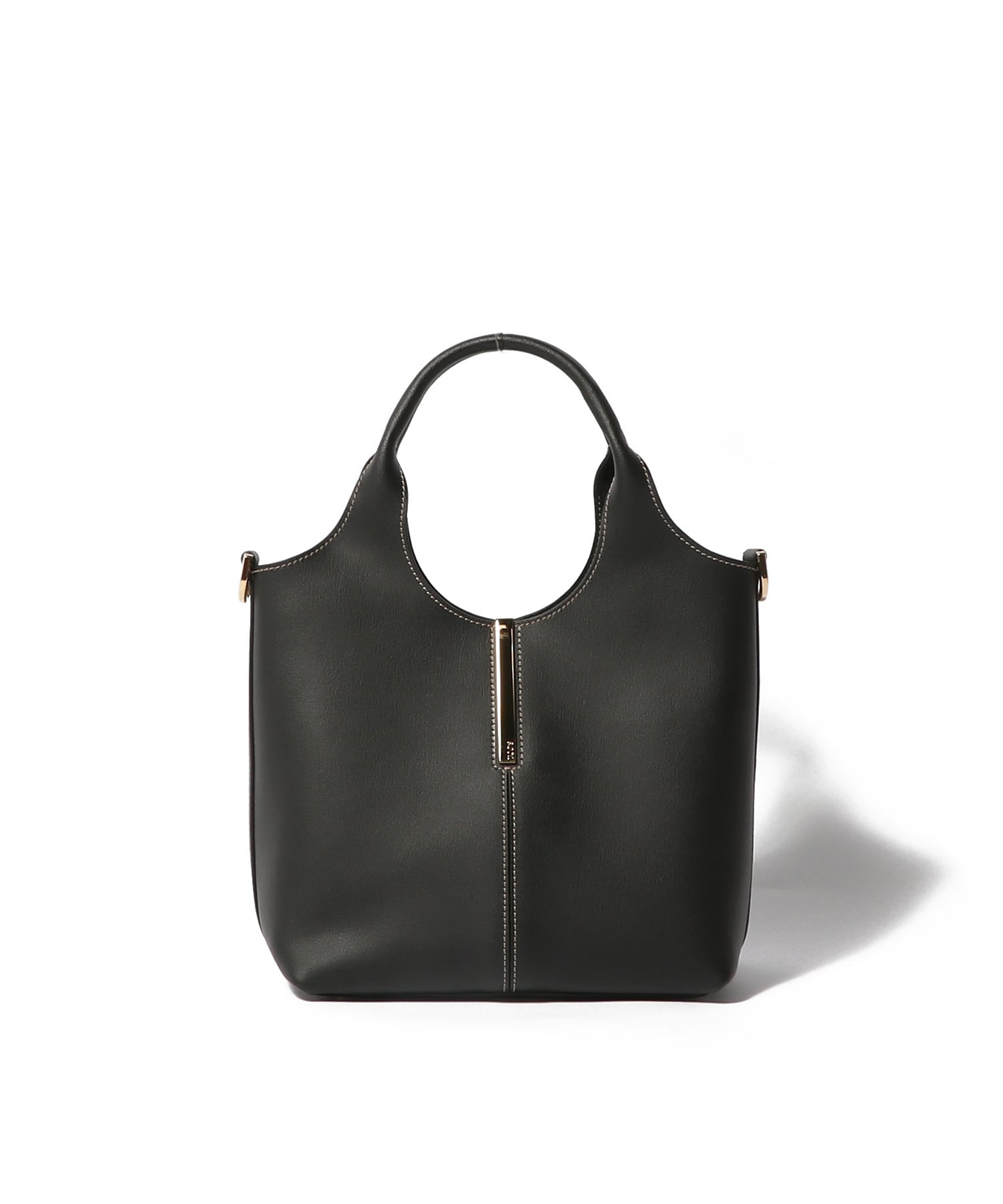 フロントにロゴ入りのメタルバーアクセサリー、フッククロージャー、取り外し可能なショルダー ストラップを合わせ、都会的なデイリールックにぴったりのトートバッグです。
