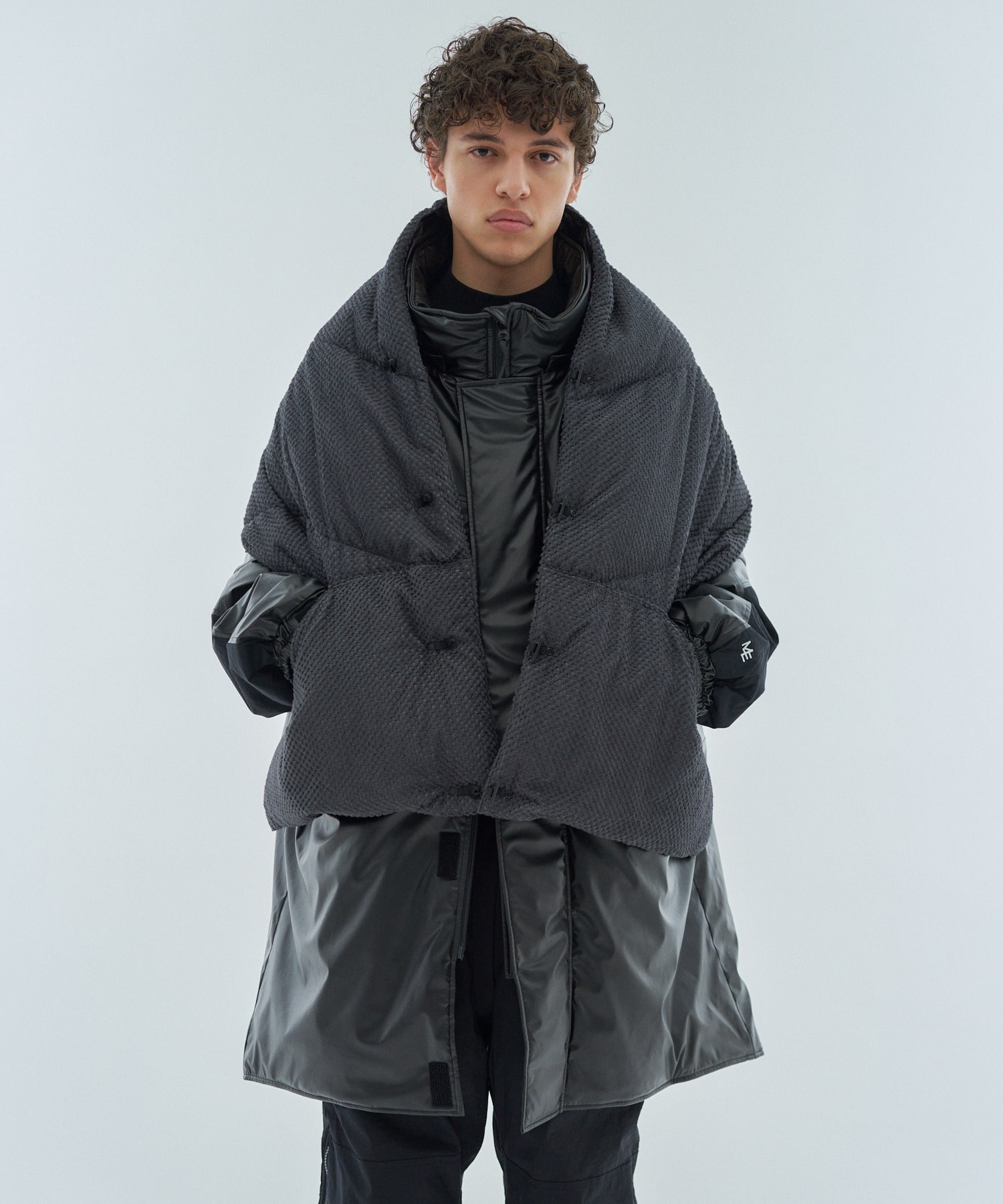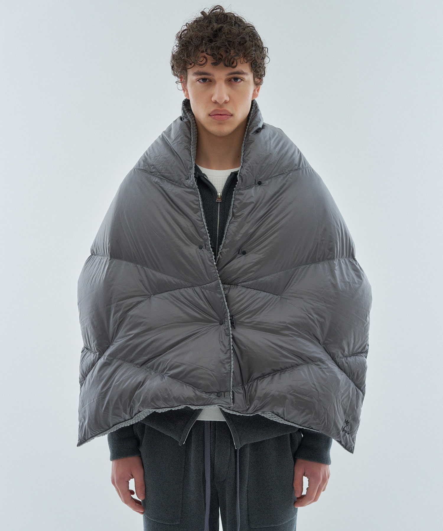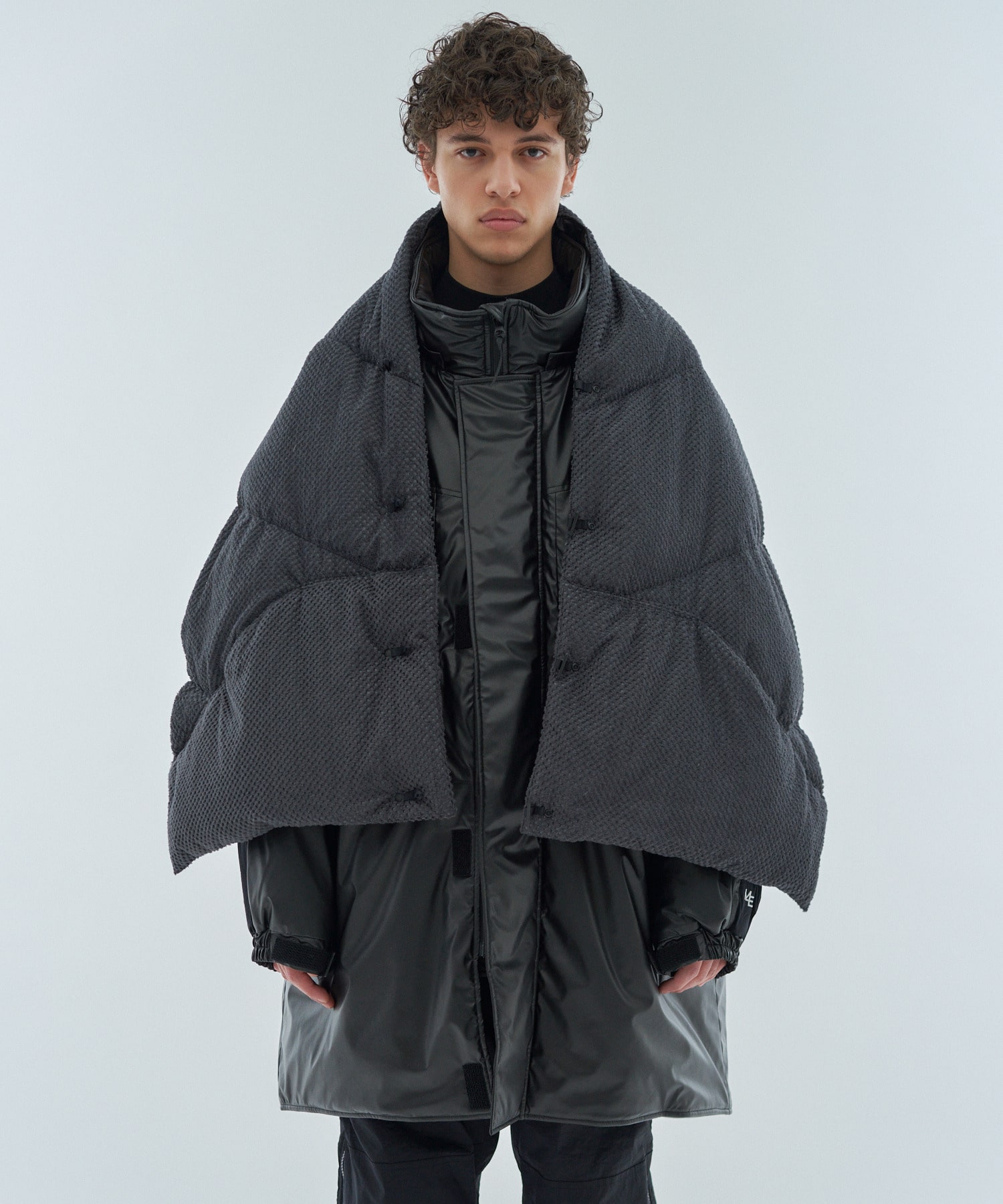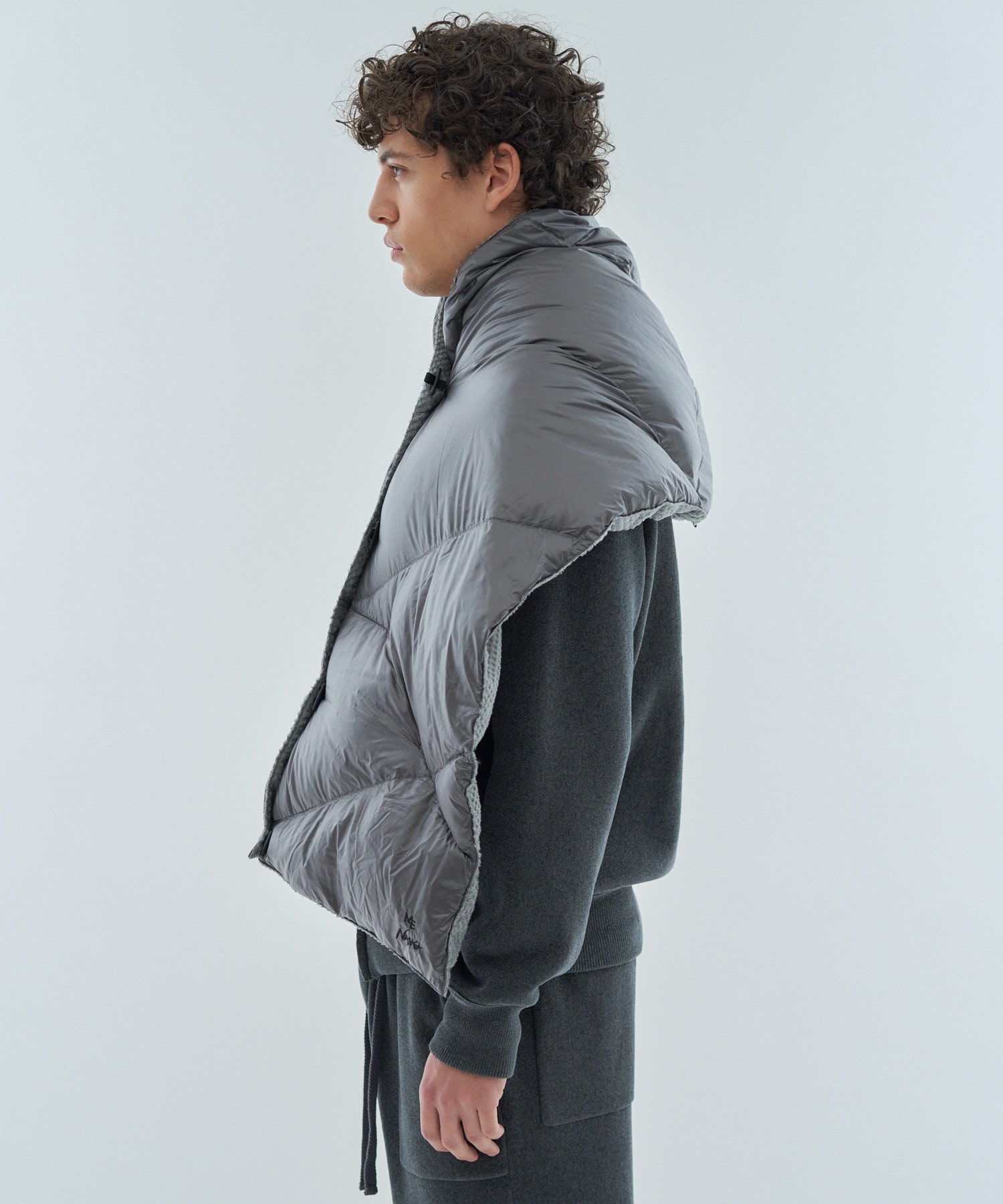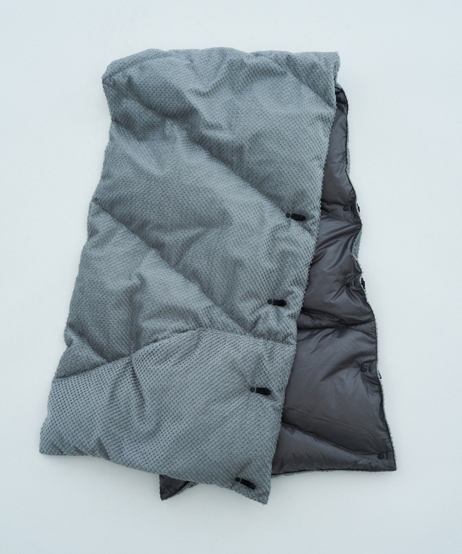 NANGA × MINOTAUR INST. for ESTNATION コラボレーションによる大判サイズのダウンポンチョマフラー。