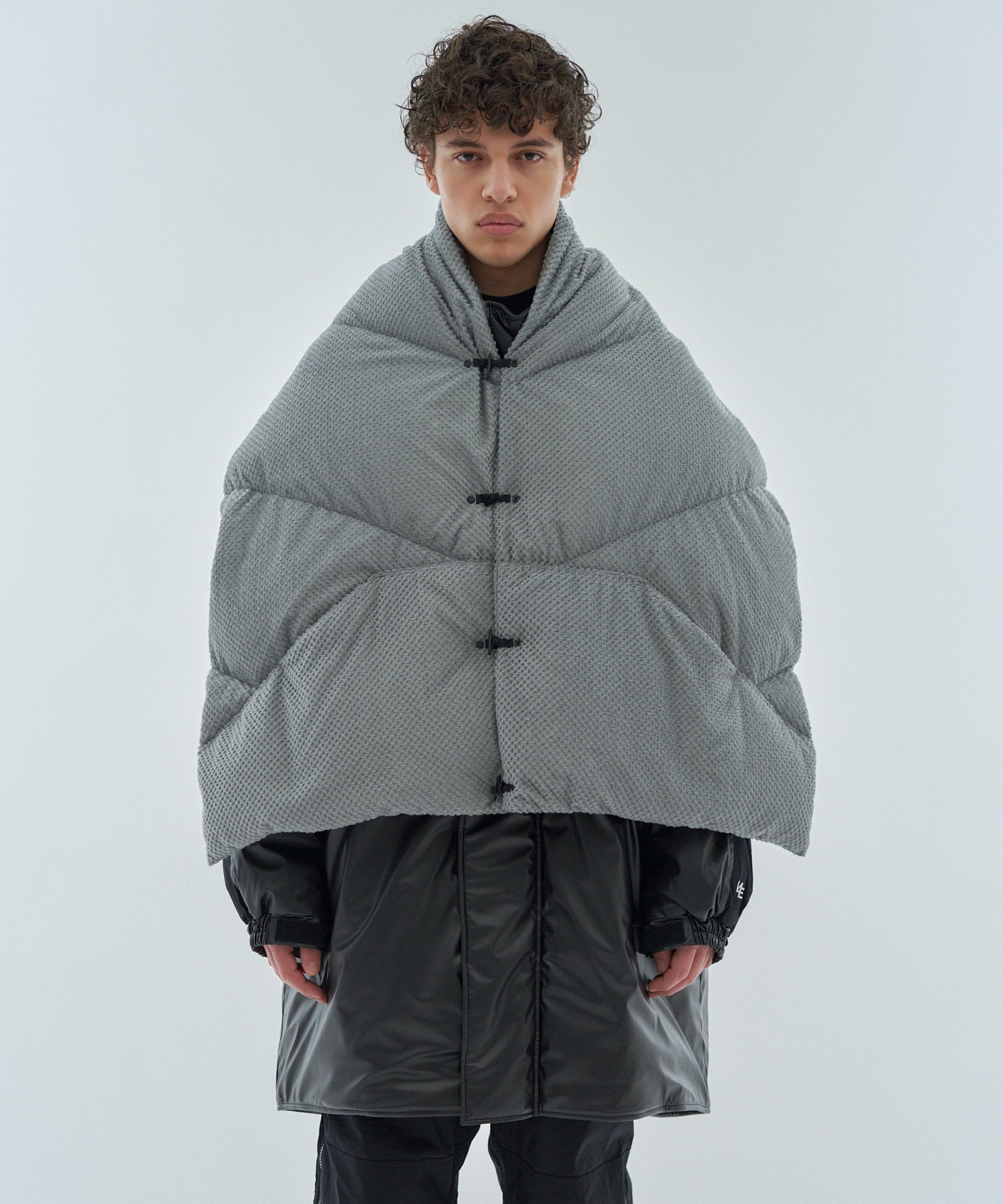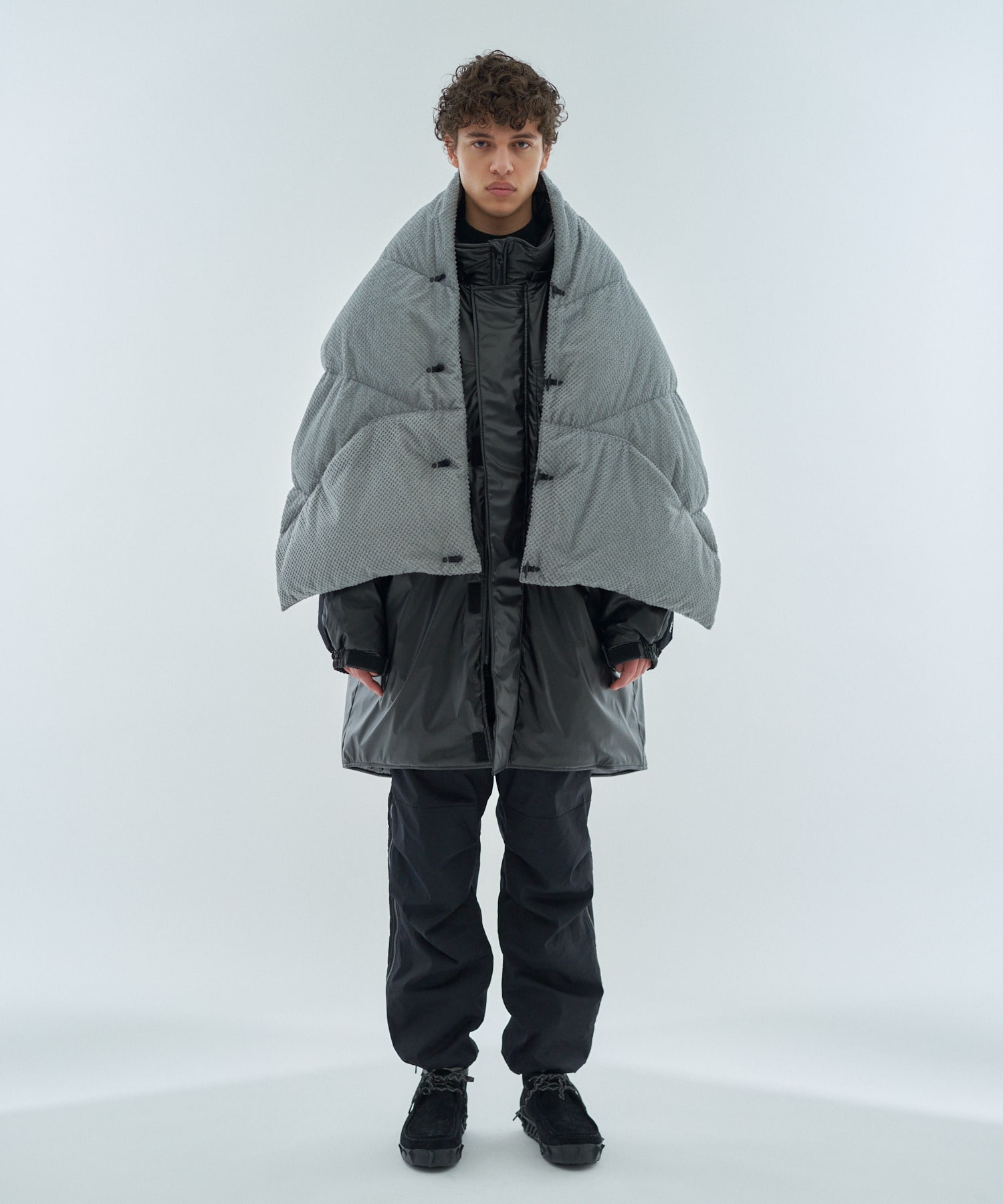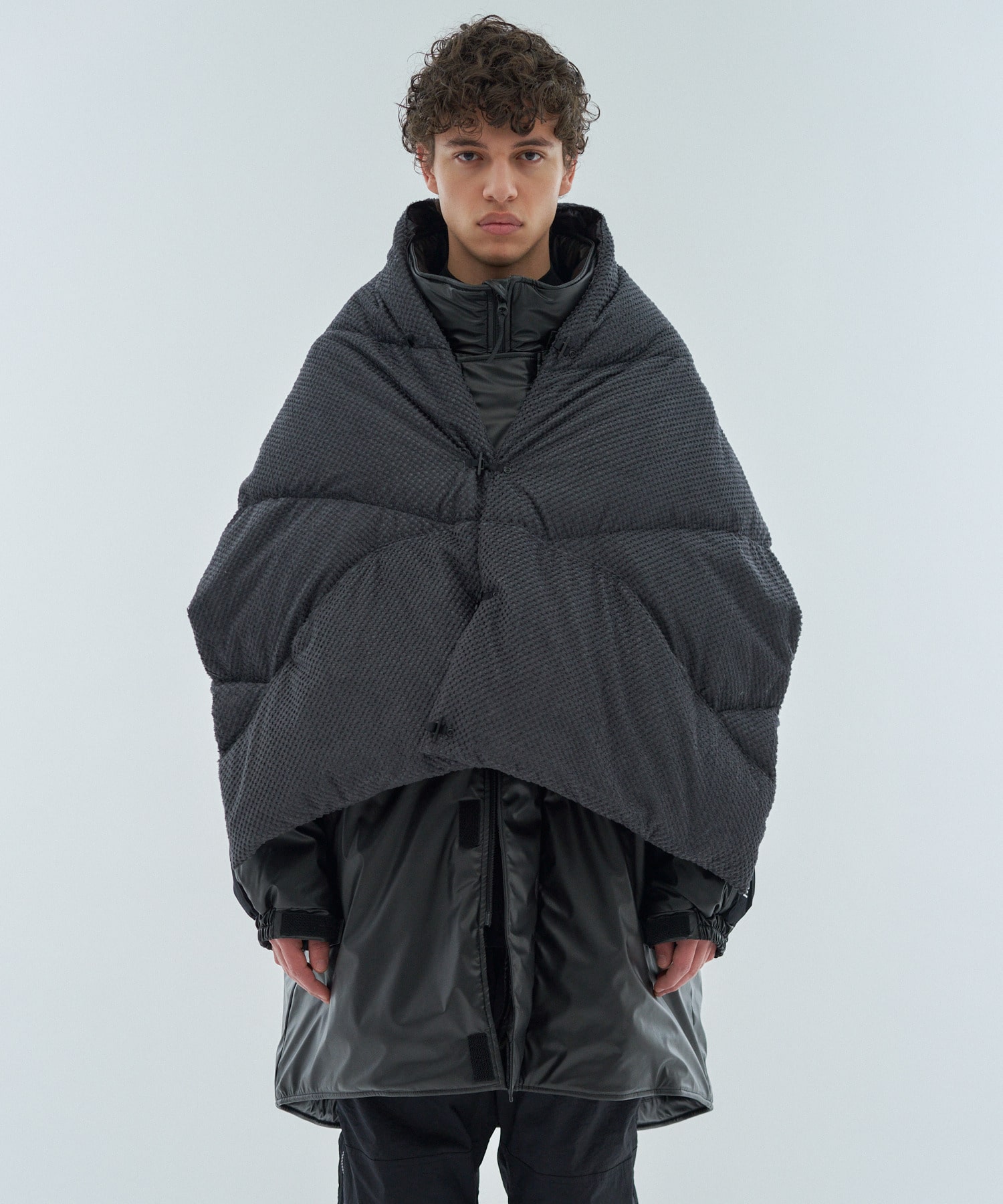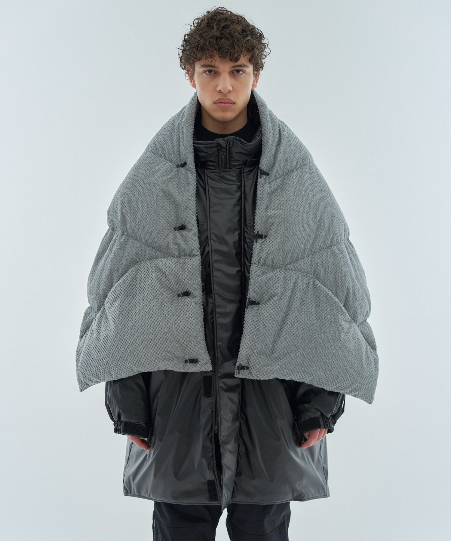 NANGA × MINOTAUR INST. for ESTNATION コラボレーションによる大判サイズのダウンポンチョマフラー。
