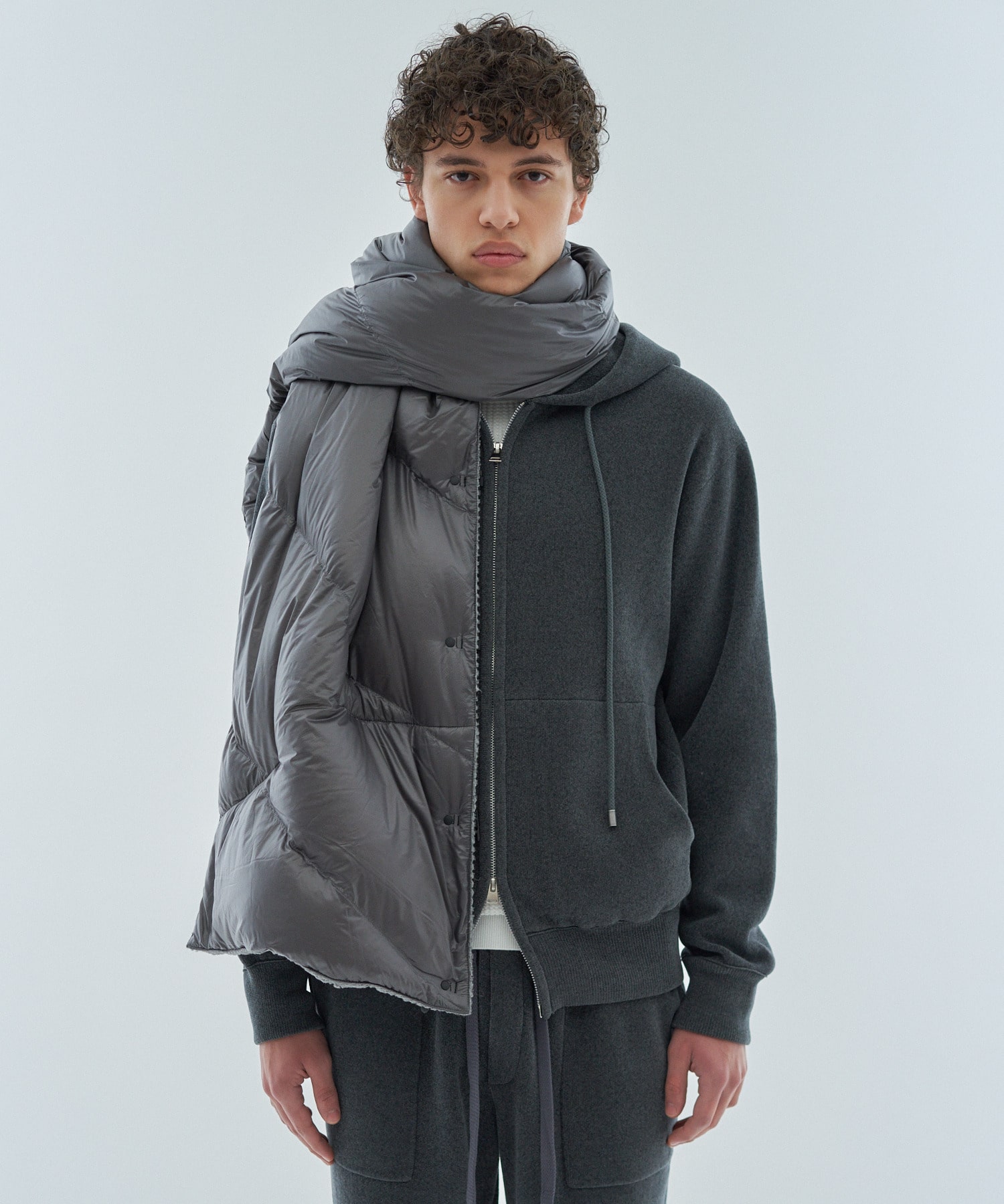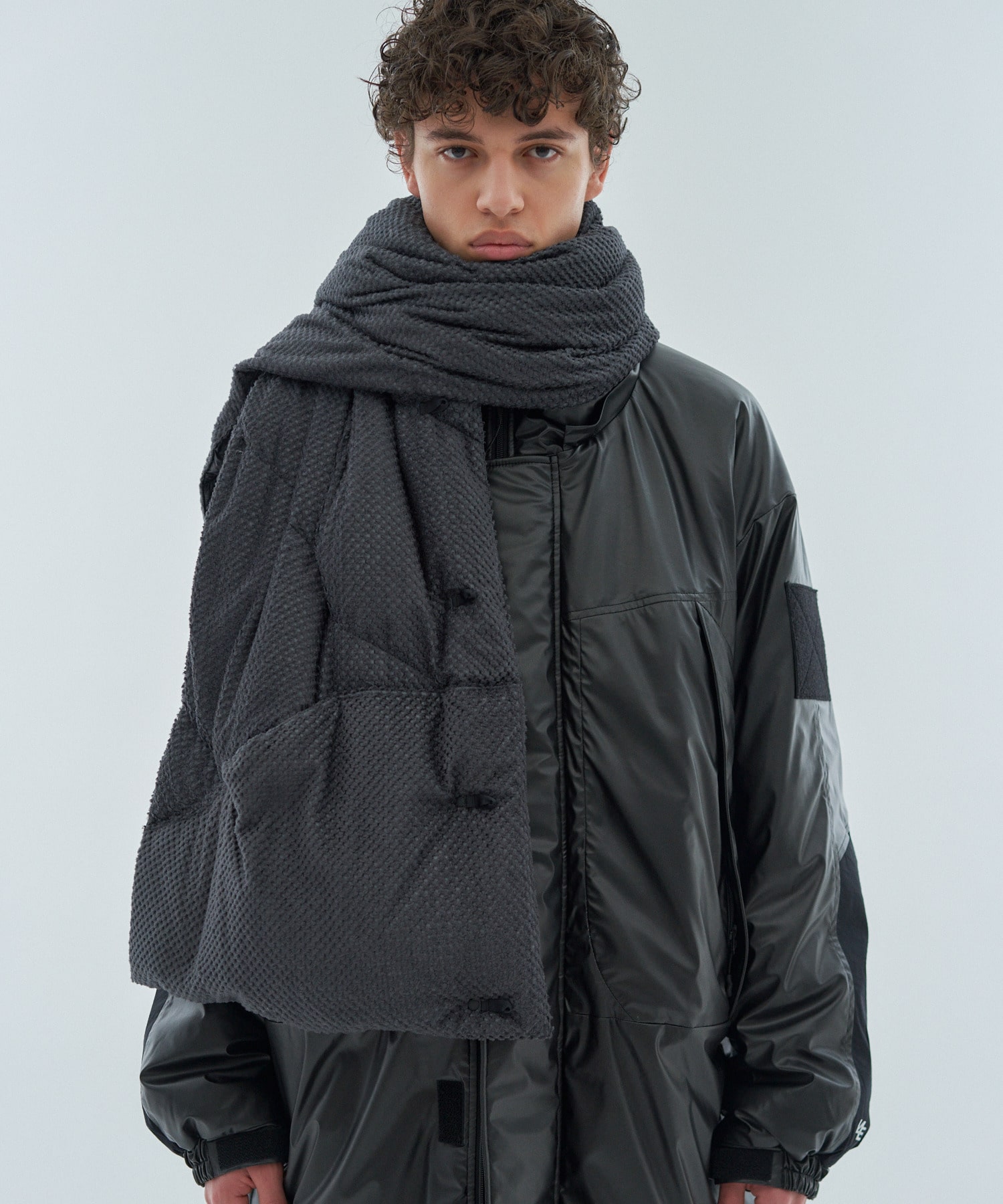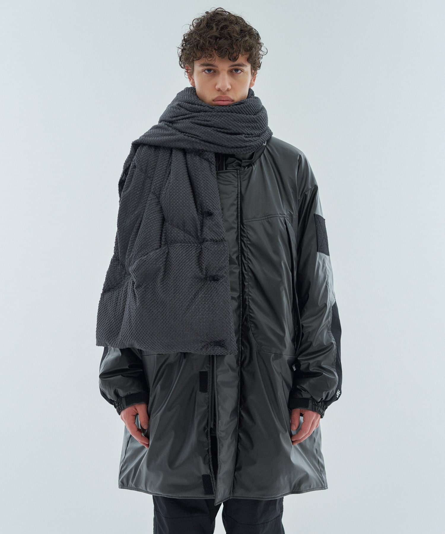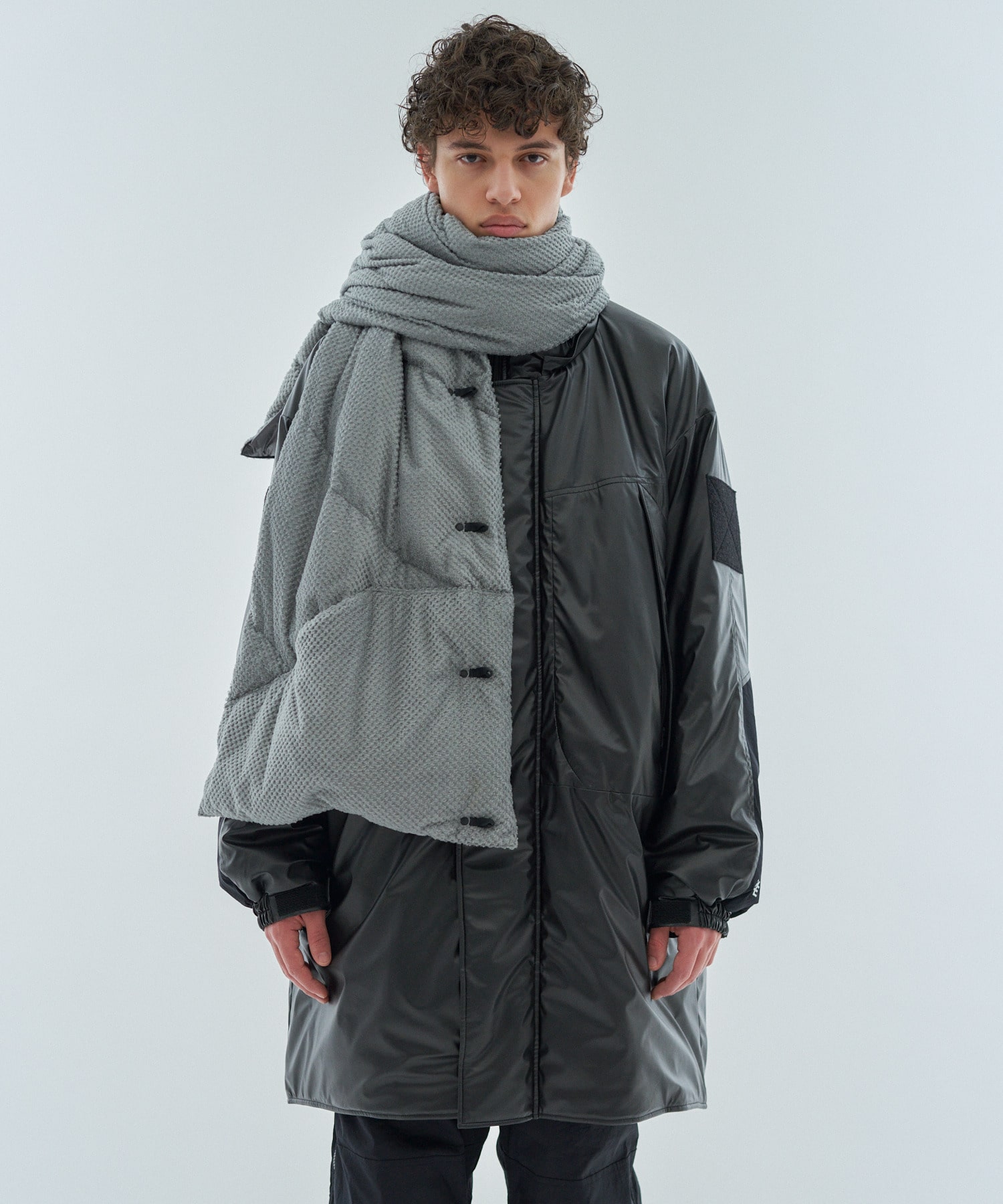 「Octa」面のフロントにはトグルボタンを配し、大容量のハンドウォーマーポケットを搭載。両肩掛けや首元に巻き付けることで、トップスに程よいボリュームを与え、スタイリングのアクセントとしても活躍します。