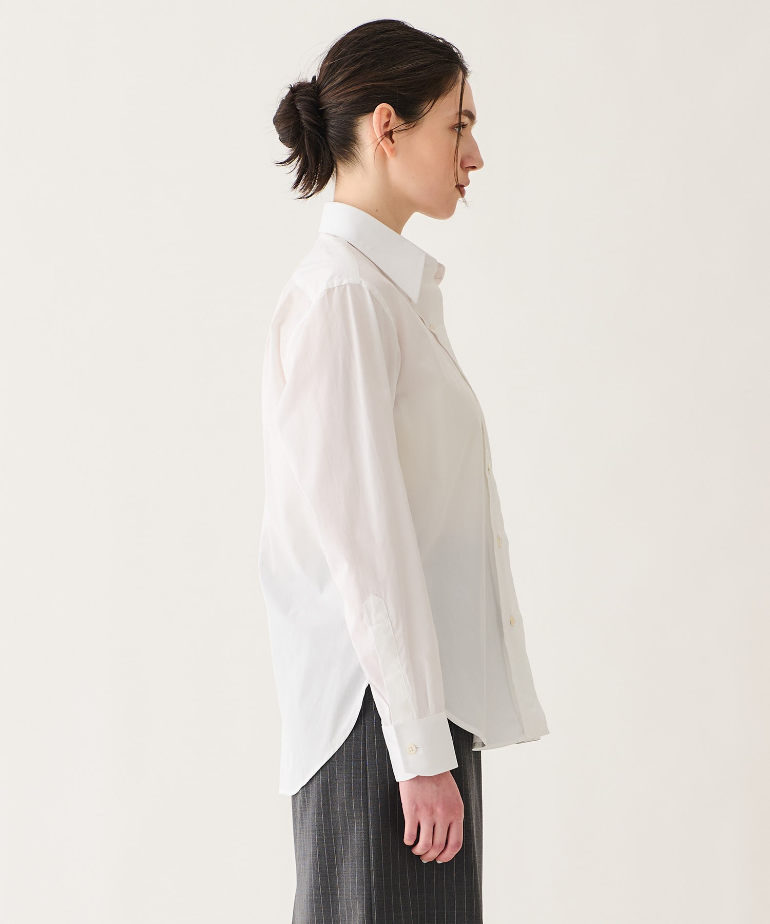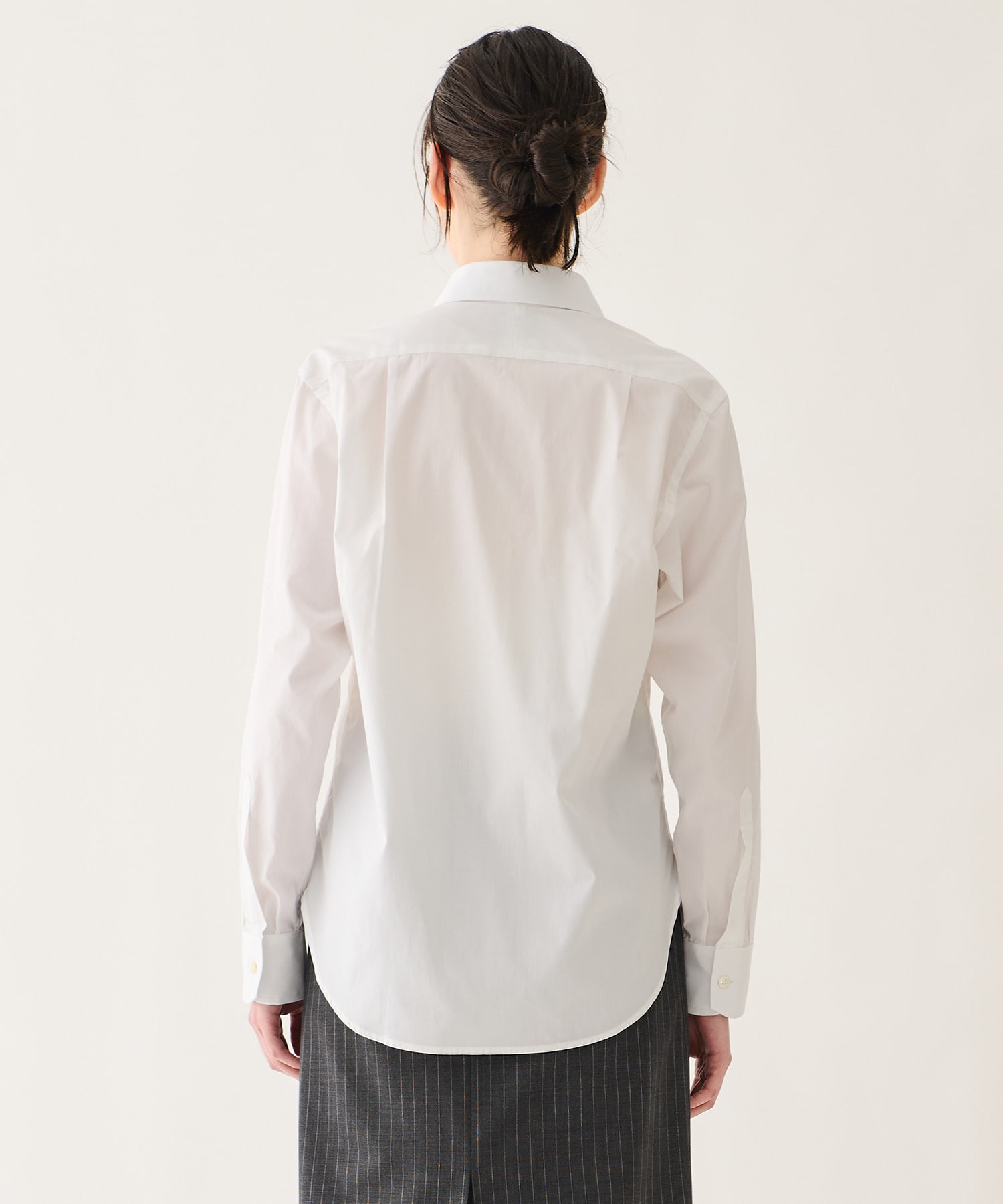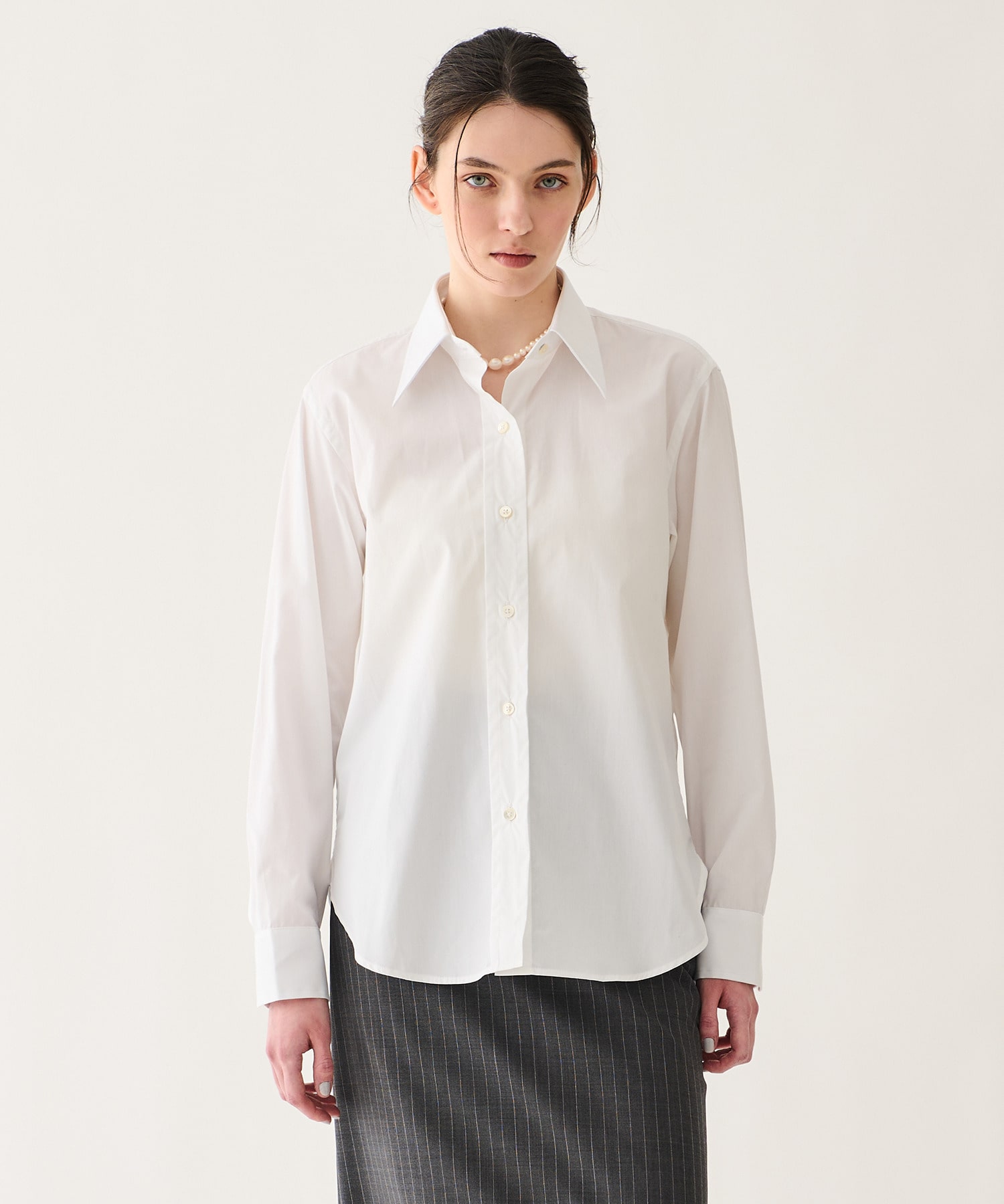 元々メンズ仕立てのインラインのシャツをベースに、丈感や袖の長さ、身幅等細かくサイズ感を調整。女性がジャストサイズで着用できる美しいシルエットに変更しました。少し大きめの襟はあえてインラインのままにし、マスキュリンな印象に。パンツやニットとの重ね着もお勧めです。