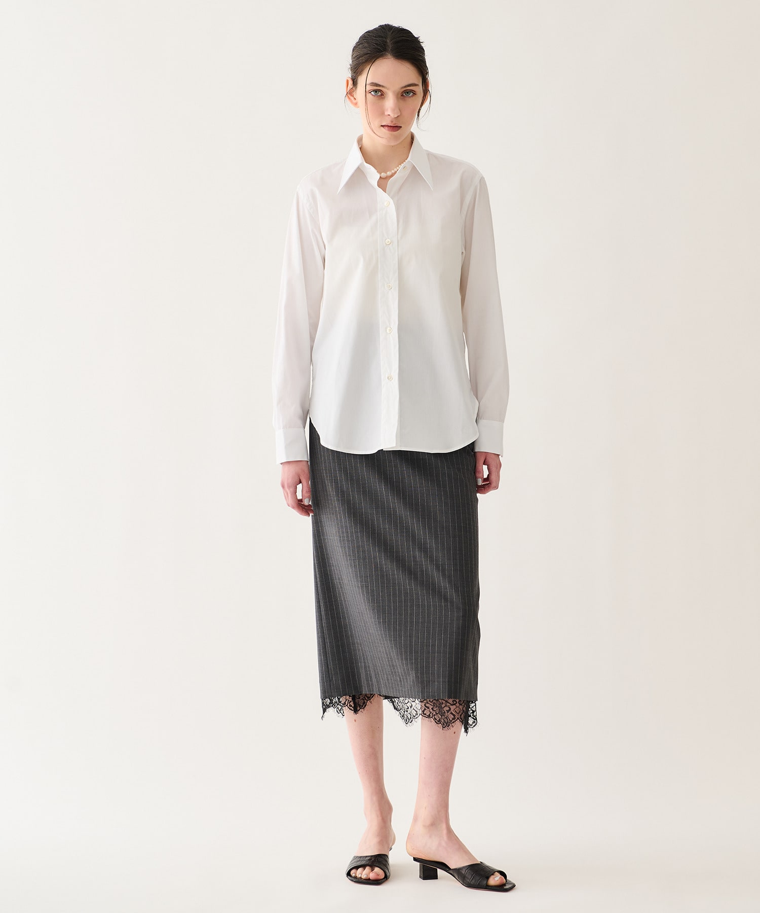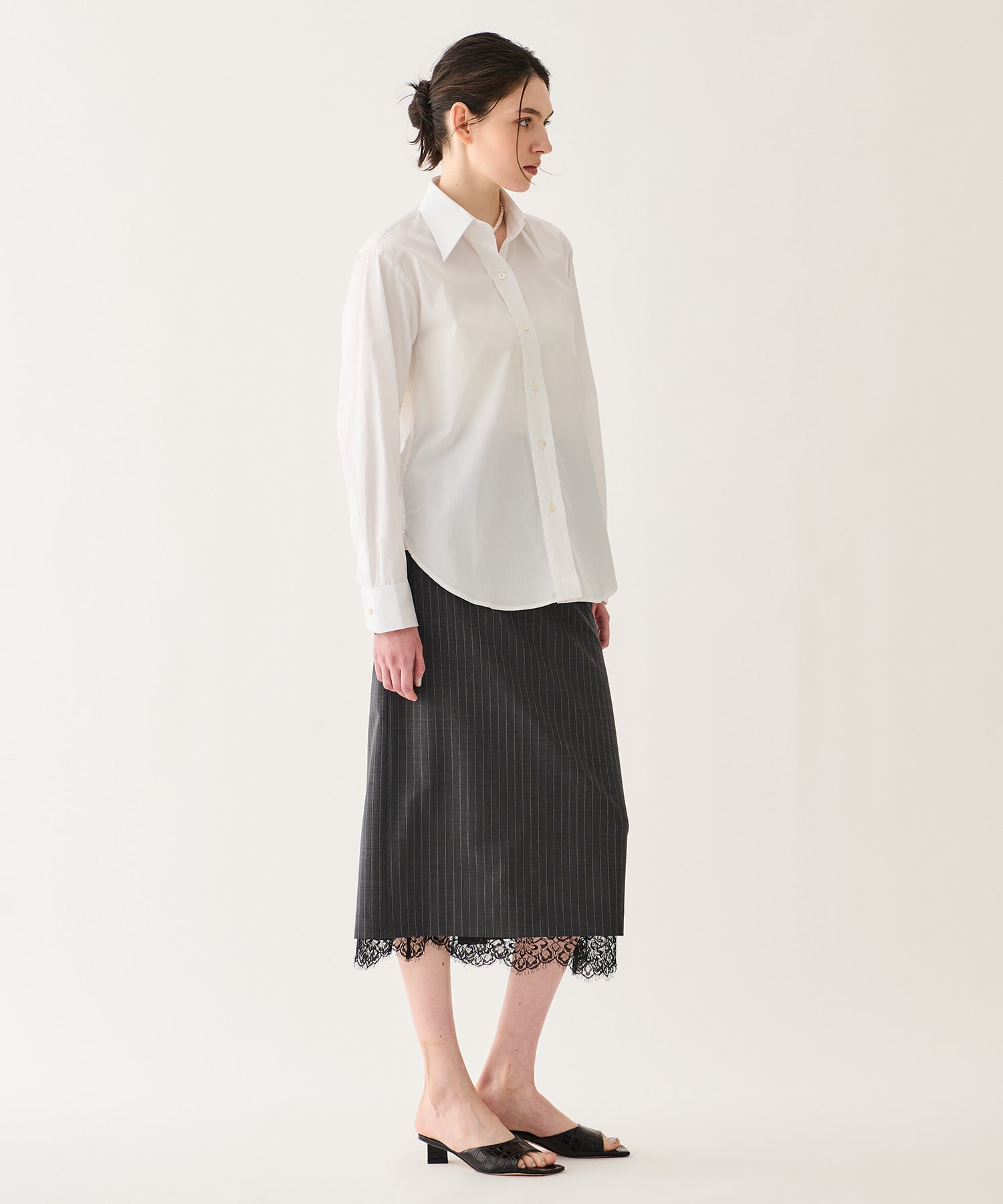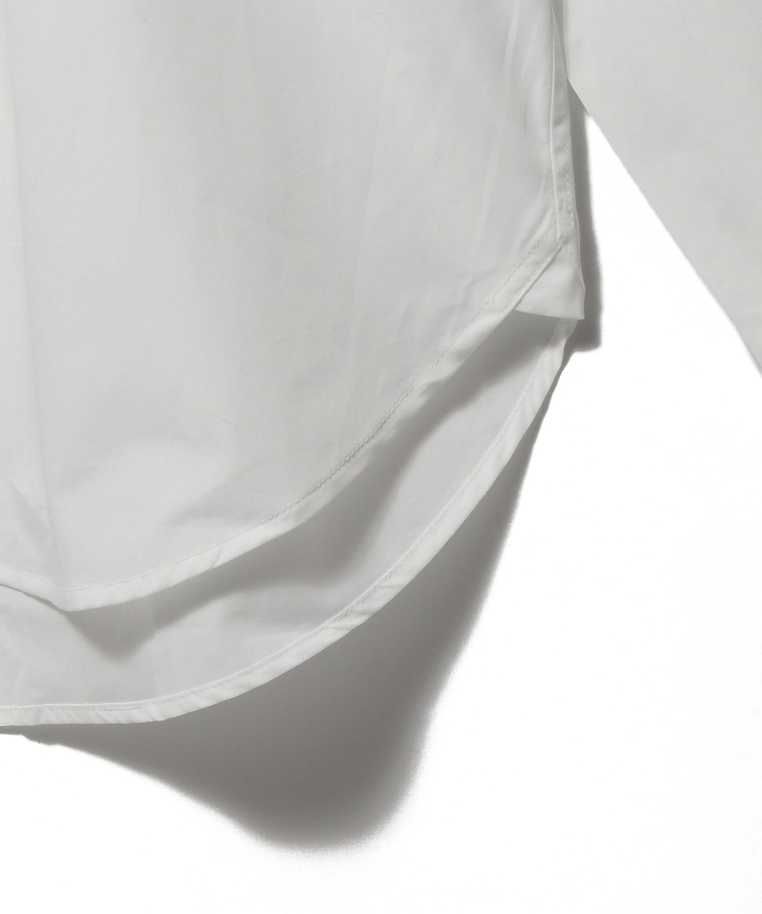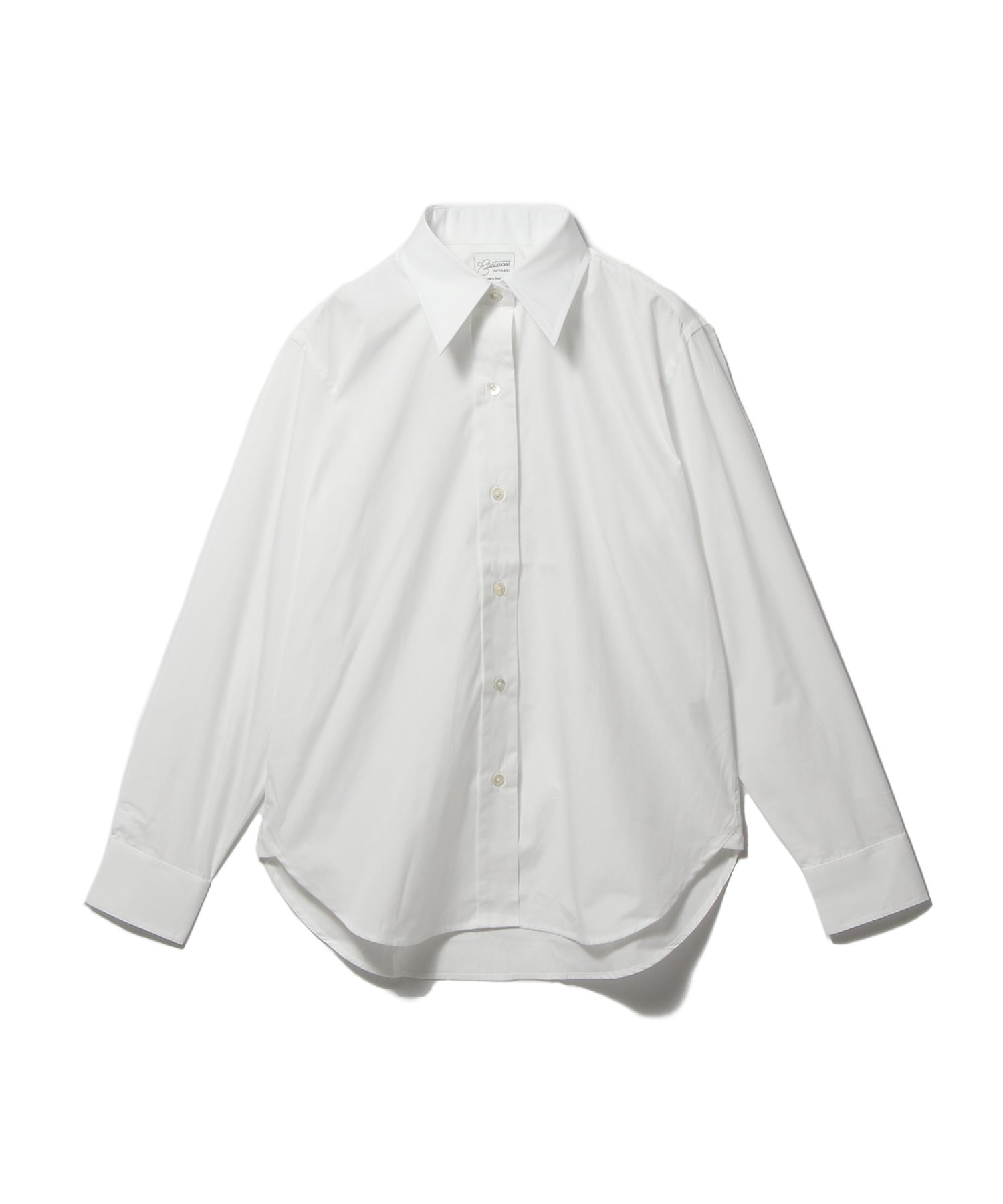 元々メンズ仕立てのインラインのシャツをベースに、丈感や袖の長さ、身幅等細かくサイズ感を調整。女性がジャストサイズで着用できる美しいシルエットに変更しました。少し大きめの襟はあえてインラインのままにし、マスキュリンな印象に。パンツやニットとの重ね着もお勧めです。