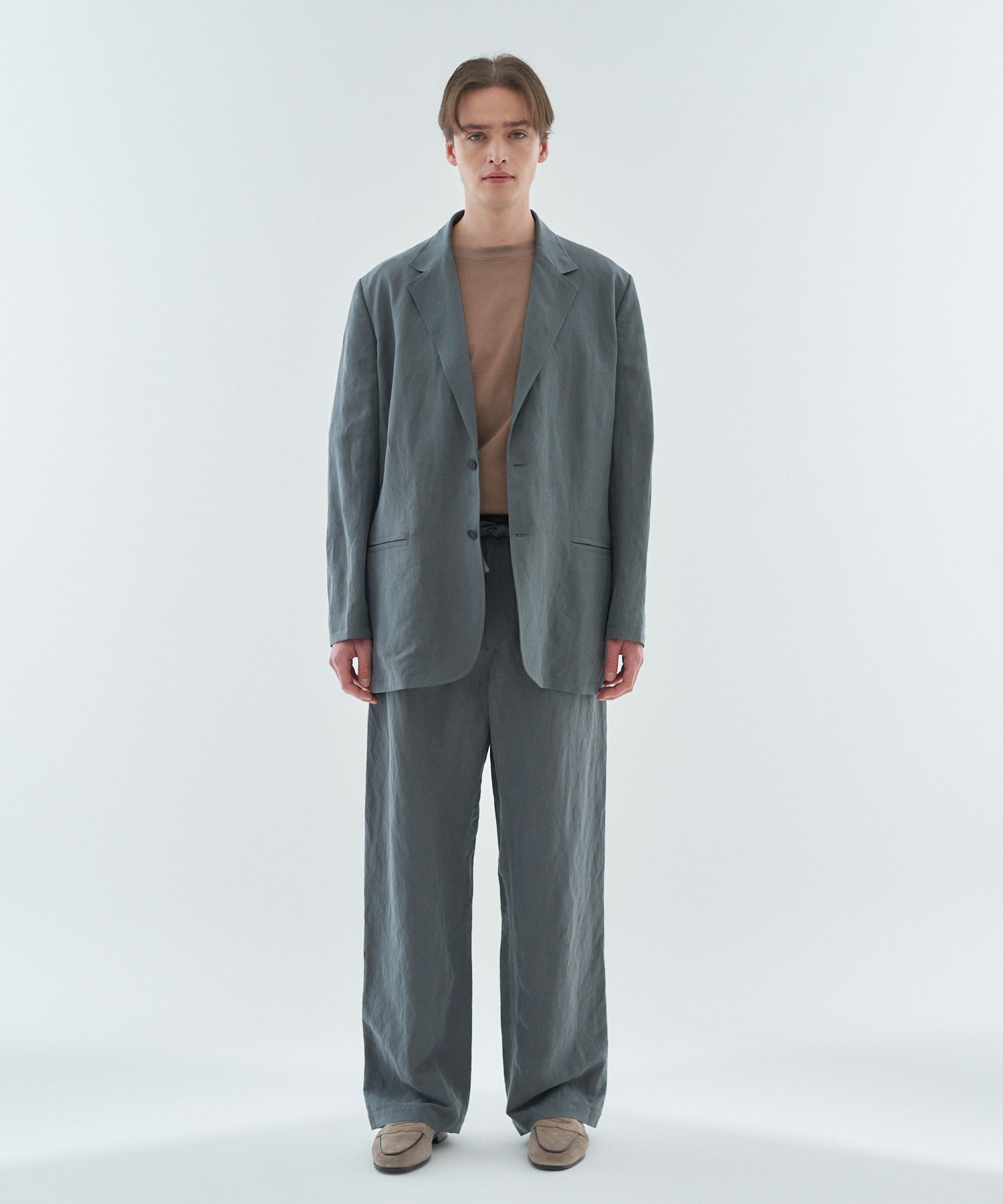 素材には、シルクとリネンを交織したツイル生地を採用。サンドウォッシュ加工によってシルク特有のフィブリル化を引き出し、部分的な白化が奥行きのある表情を生み出しています。さらに柔軟加工を施すことで、ハリ感としなやかなドレープ性を兼ね備えた風合いに仕上げています。