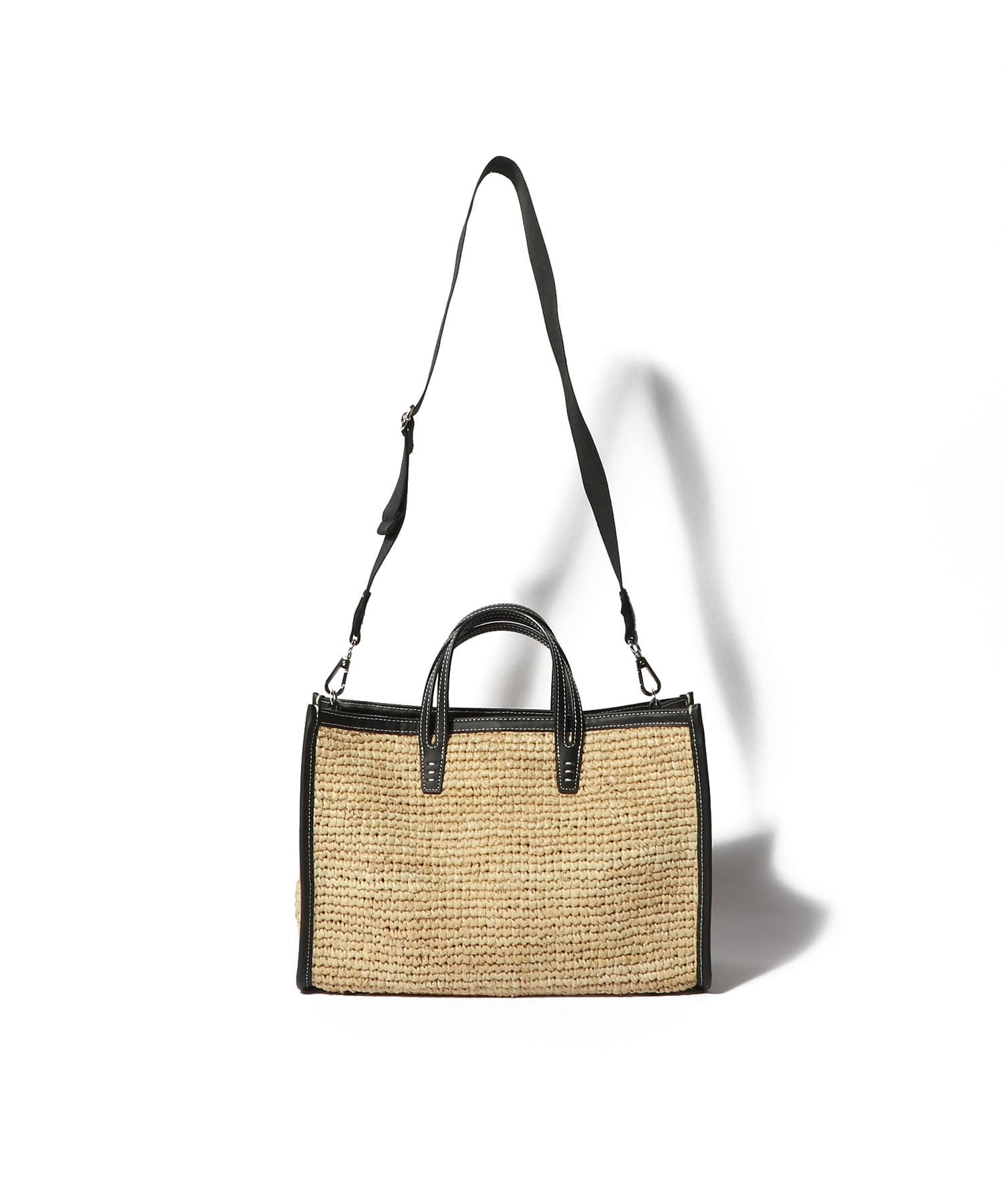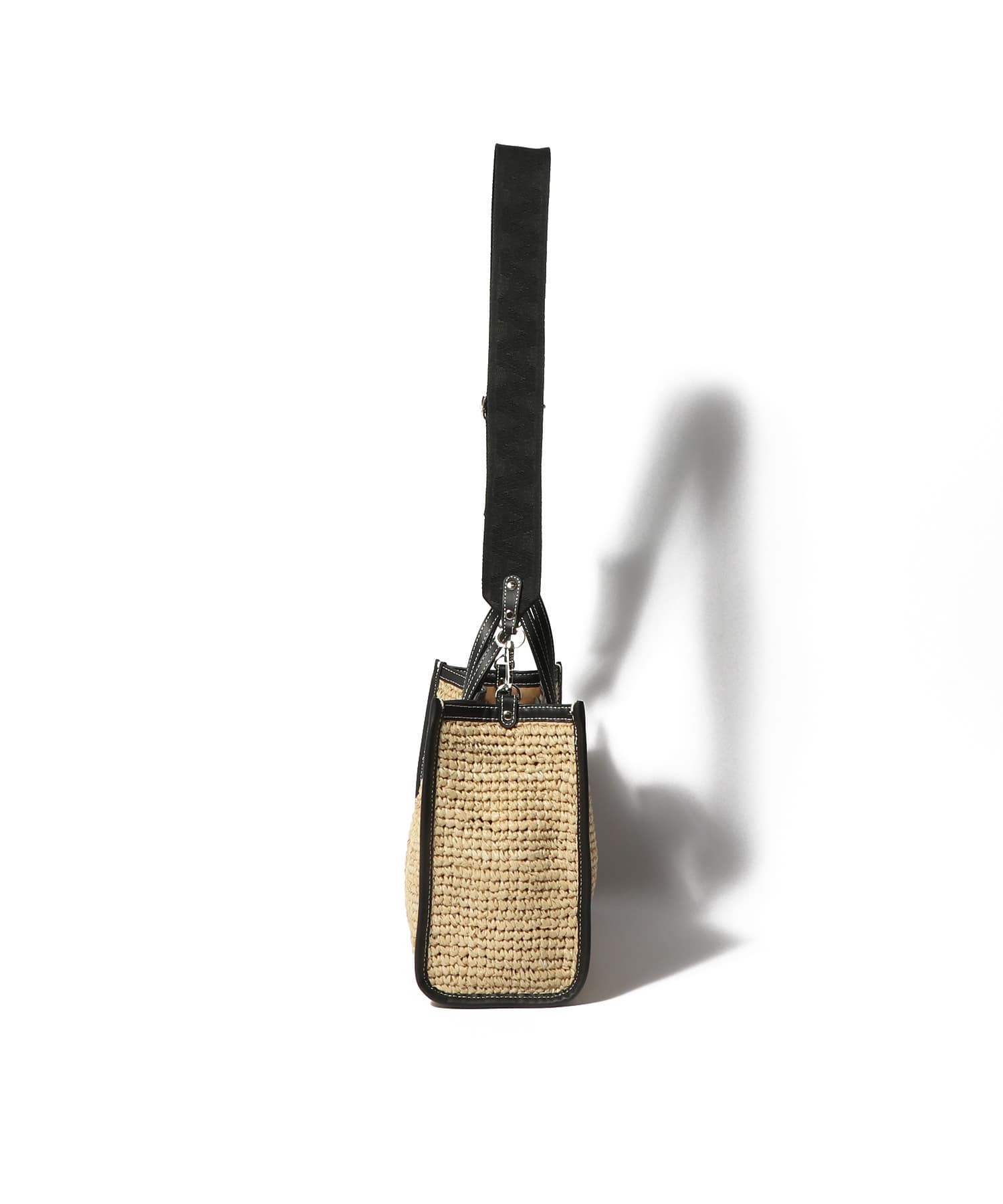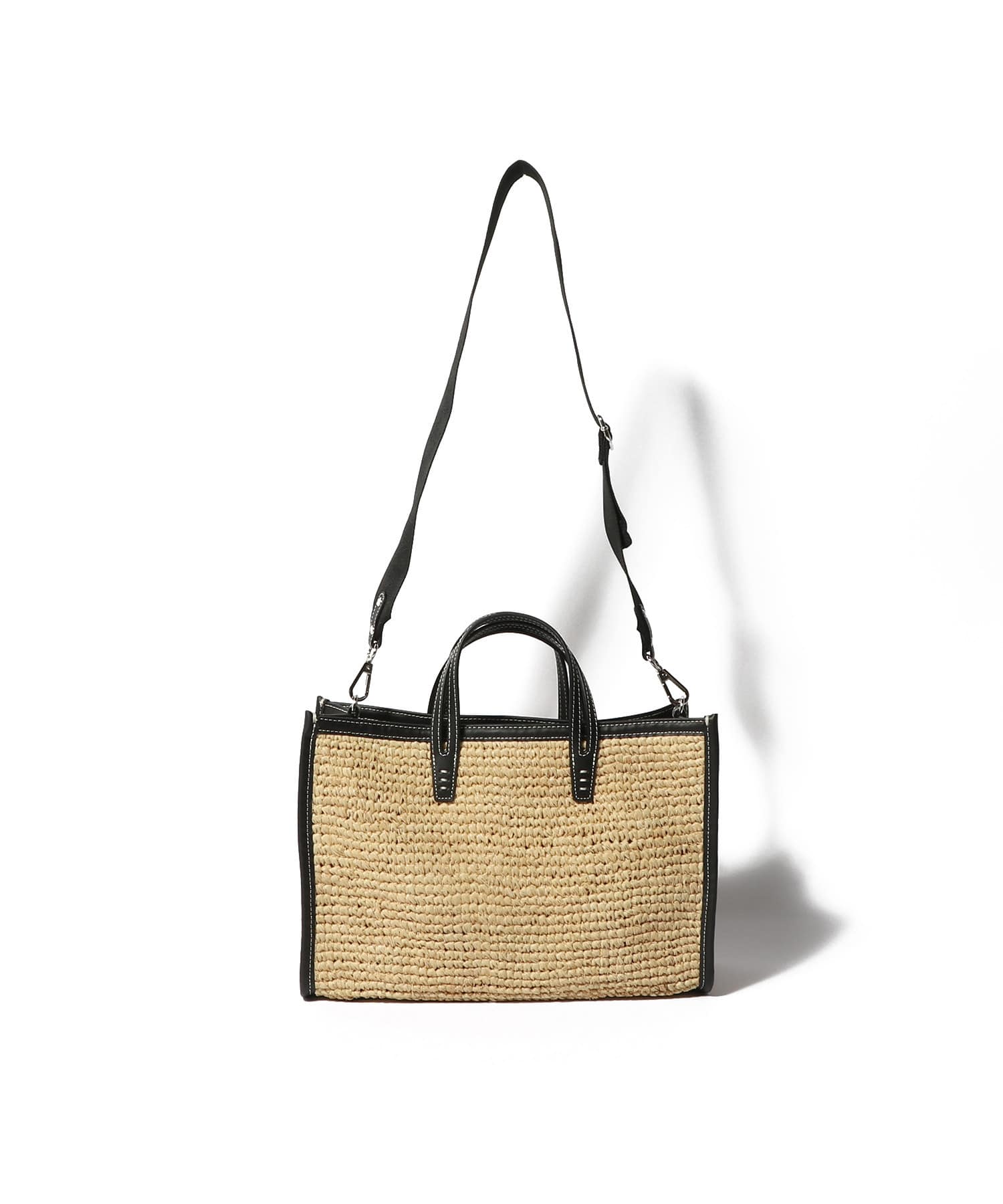 ラフィア素材とレザーのバイカラーデザインがモダンなバッグ。