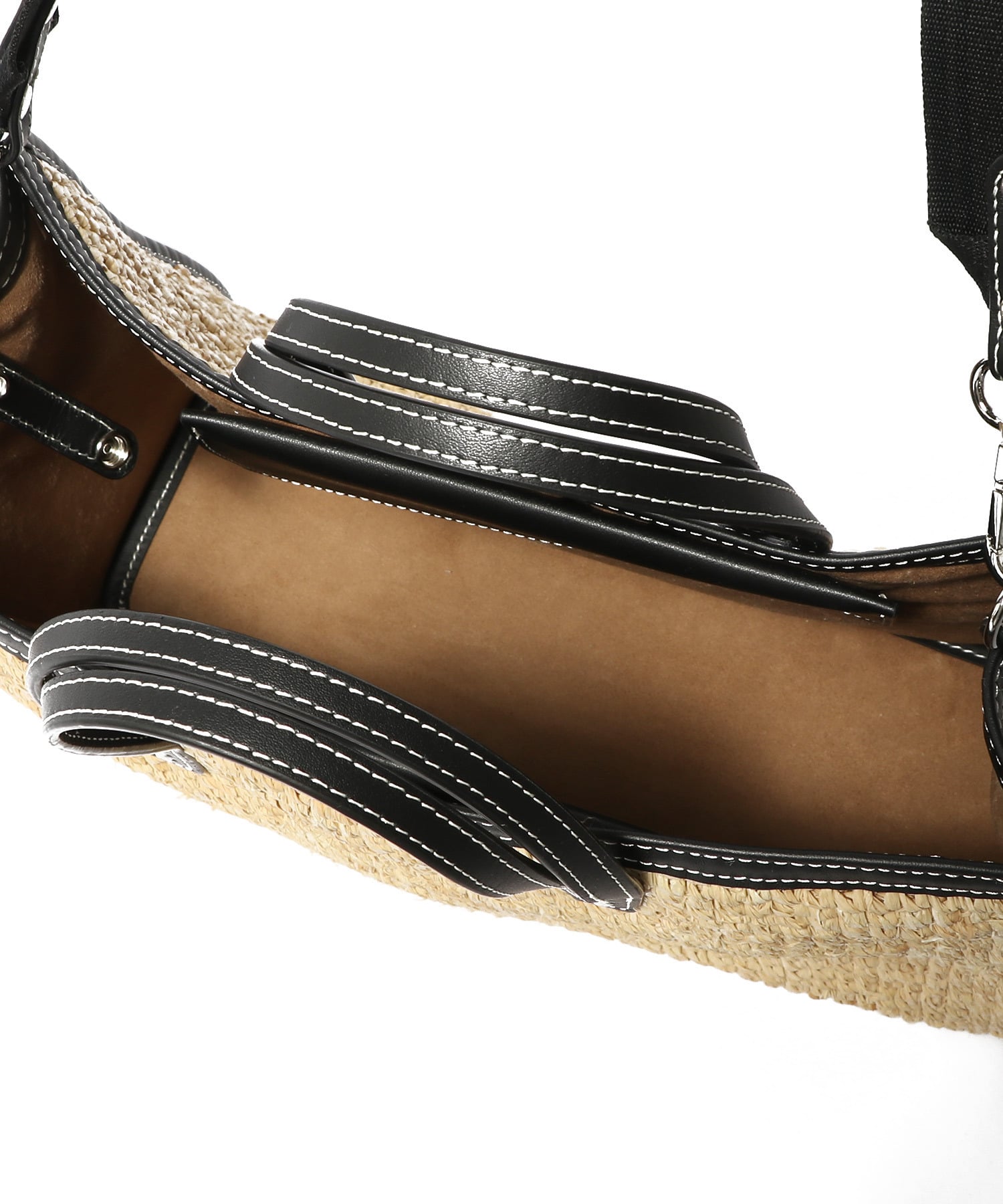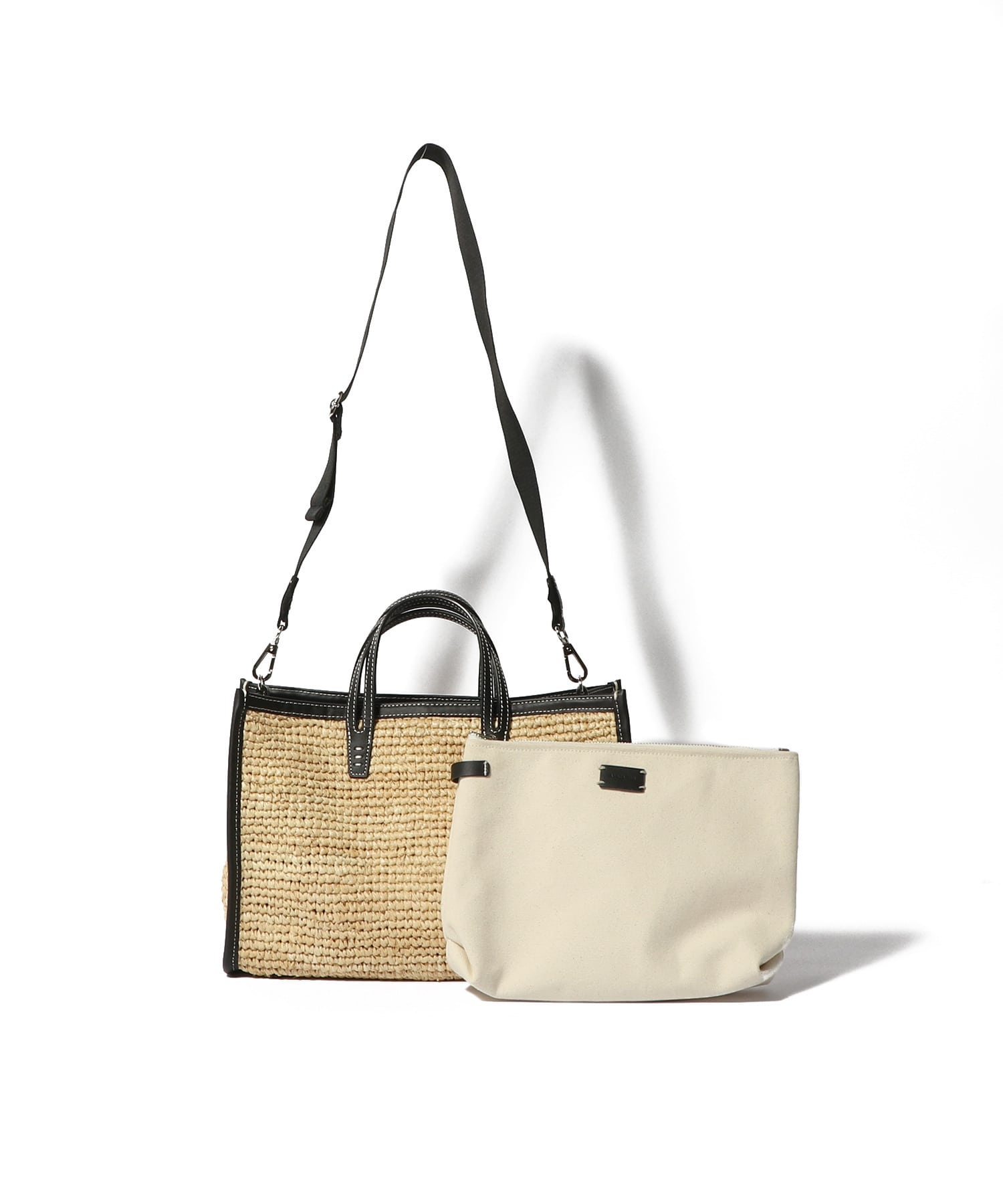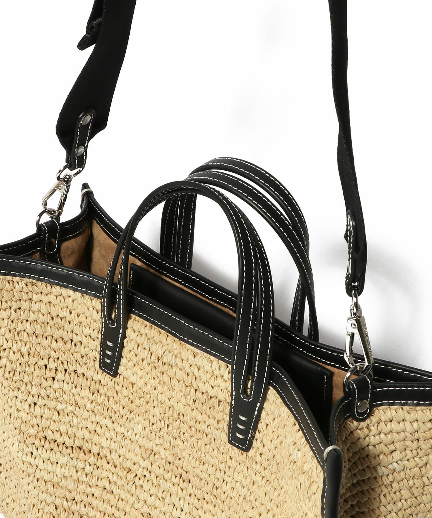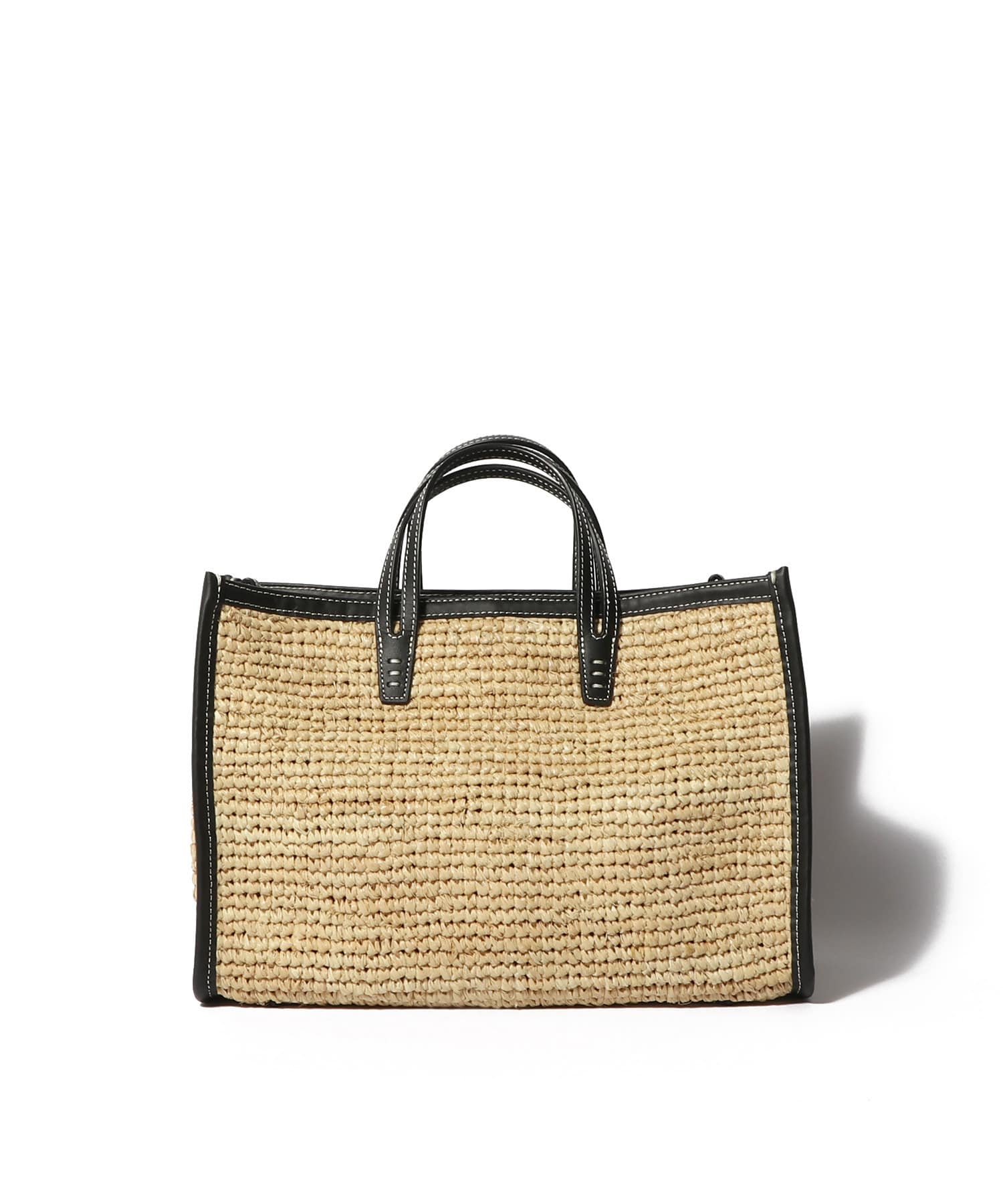ラフィア素材とレザーのバイカラーデザインがモダンなバッグ。