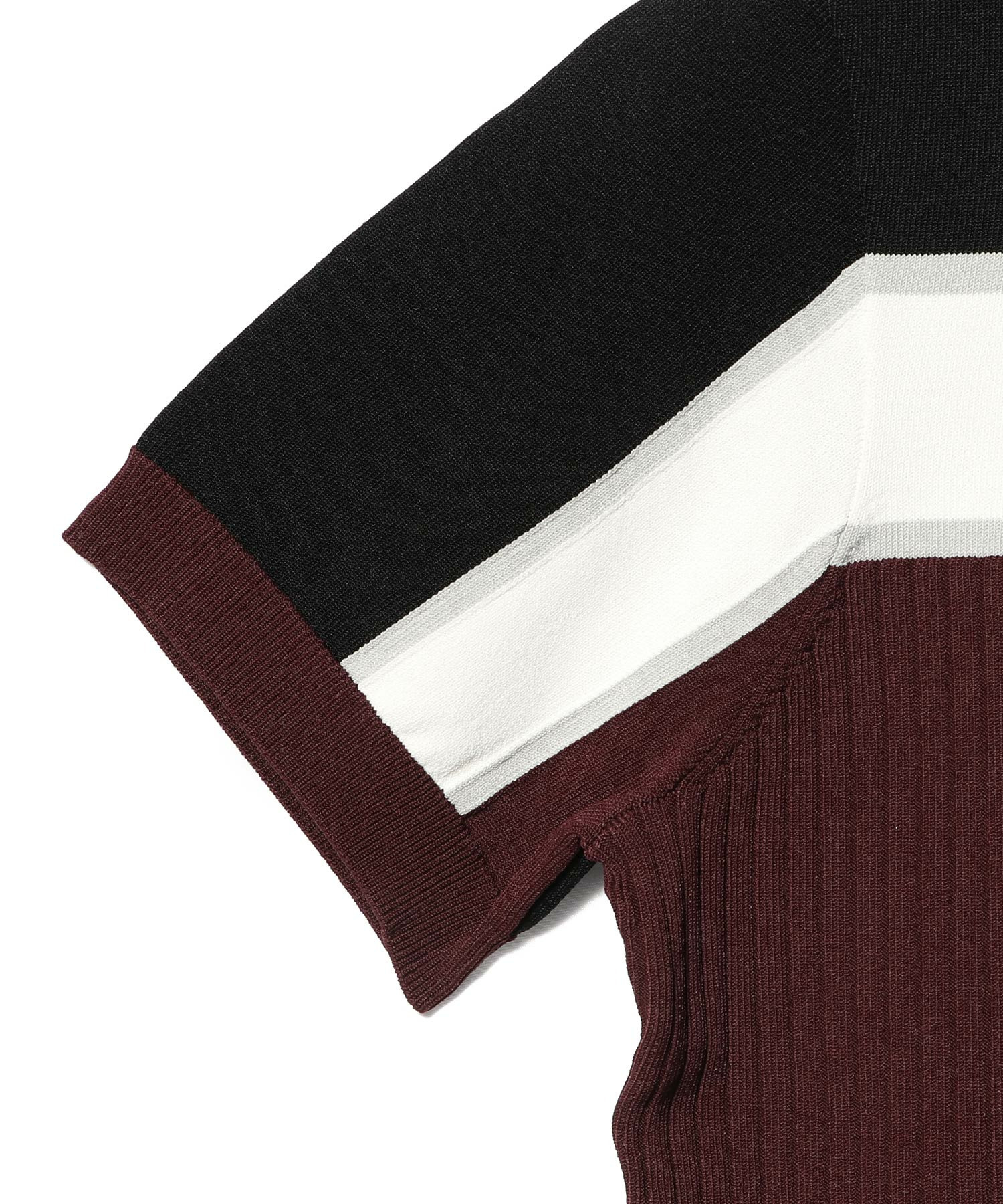 リブ編みのボディに、胸元の配色ラインとメタルボタンがアクセントとなり、レトロかつ洗練されたムードを演出します。