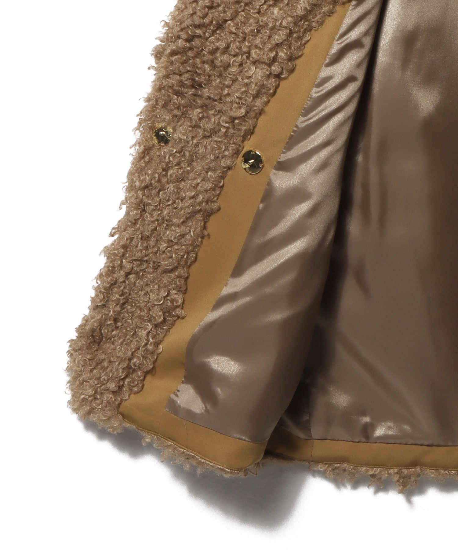 フワフワとしたカーリーラムファーを思わせるフェイクファーを使用。ギリシャのメーカー Doumas Bros S.A. IFANSI(ドゥーマスブラザーズ イファンシ) のインポート素材で仕立てた、襟裏まで贅沢にファーをあしらったラグジュアリーな1着です。