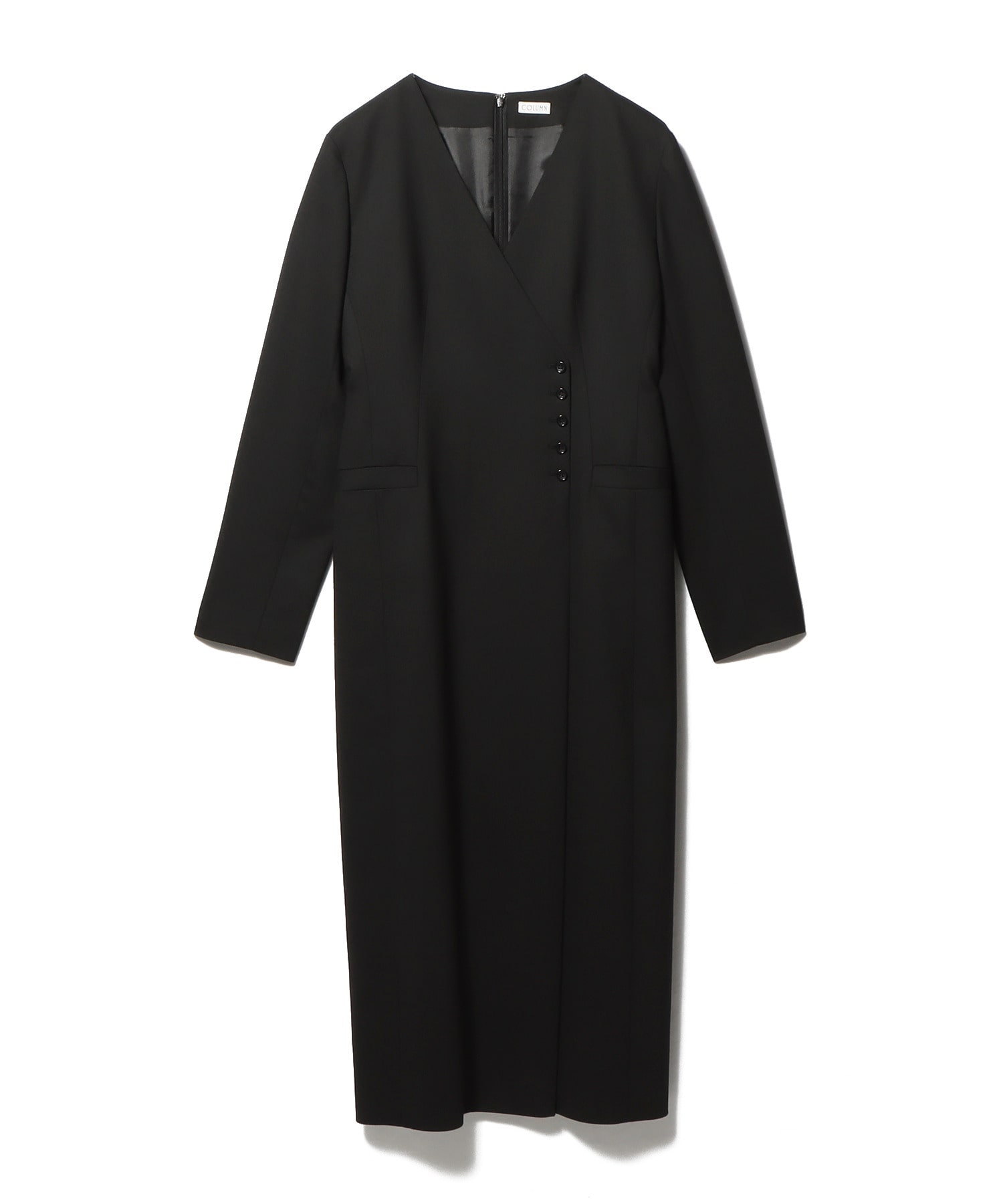 高めのウエスト位置とボタン配列がモードな印象を演出します。立体的なシルエットが女性らしいラインを美しく際立たせ、センターバックのコンシールファスナーで着脱もスムーズ。 一枚で装いが完成する洗練されたドレスです。