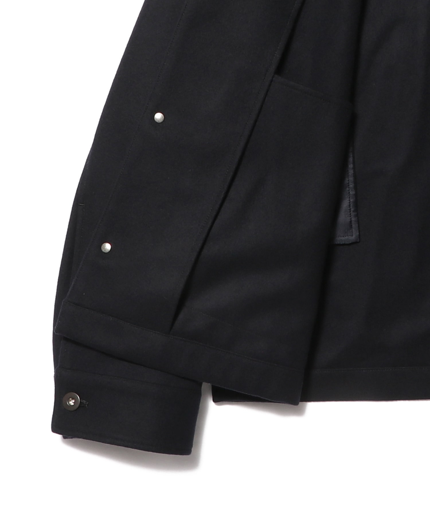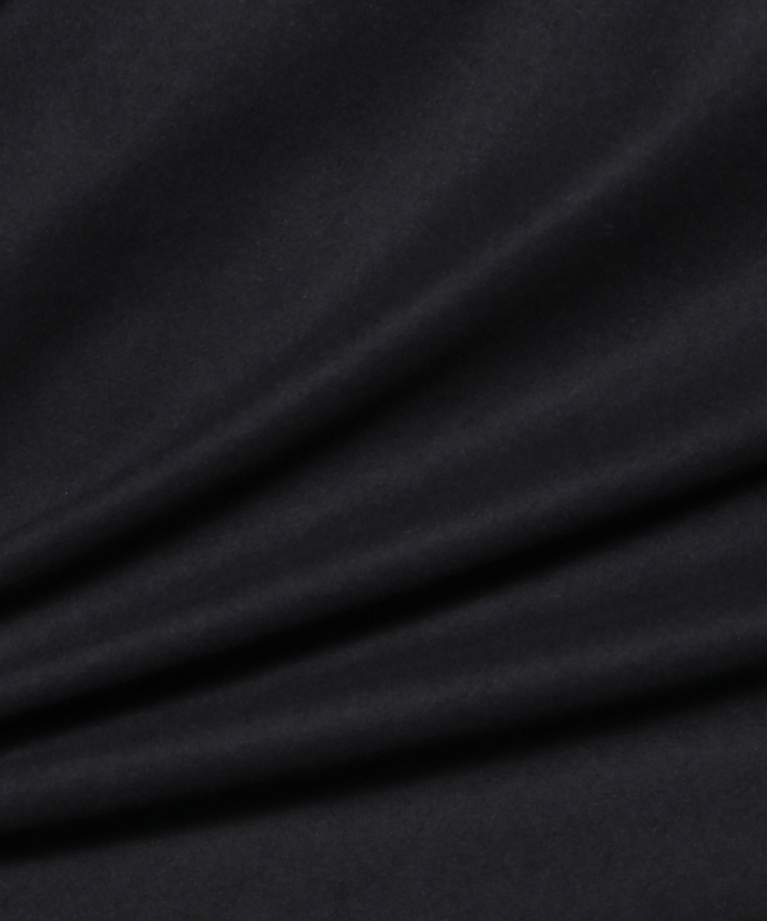カシミヤのフランネル生地に比べて“ウールらしさ”を感じるクラシックながらもフレッシュな素材感が特徴です。フロントはタックボタンでカジュアルな印象を持たせつつ、生地の上質さがモードな雰囲気を演出。サイドに配したユーティリティポケットがコンテンポラリーなアクセントを加えています。裏地をあえて付けずに仕立てることで、この生地ならではの上質なブランケット感を存分に楽しめる一着。