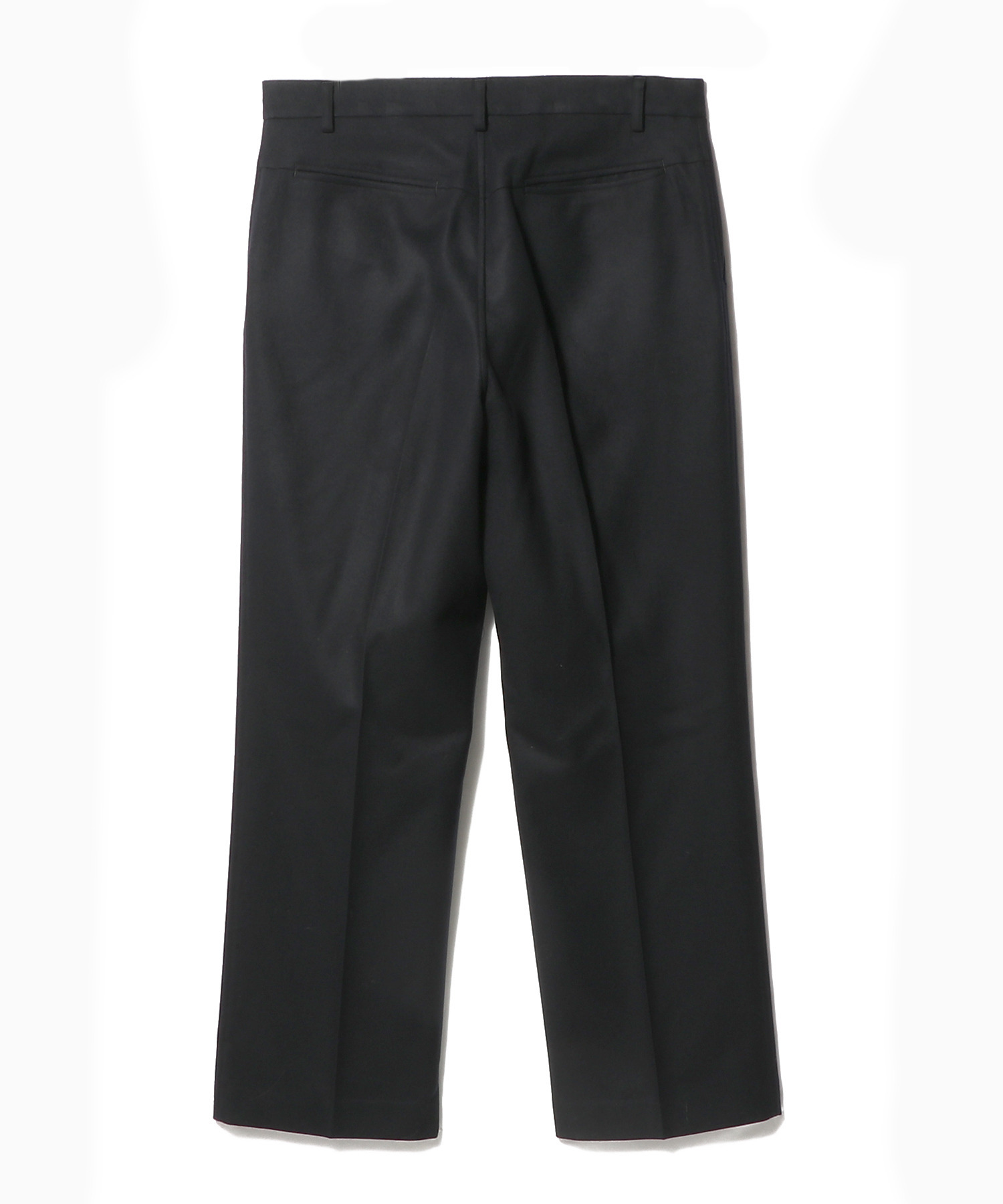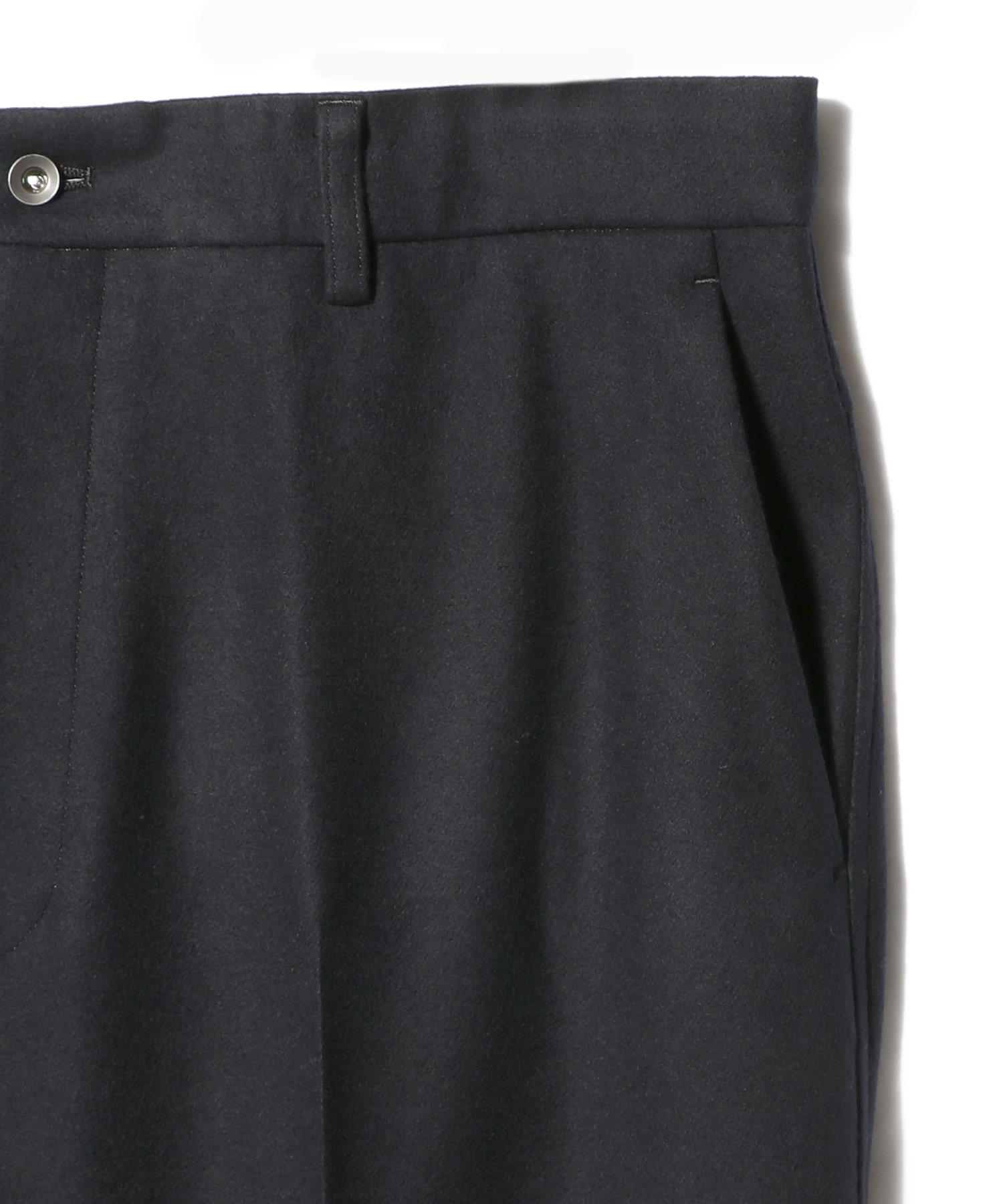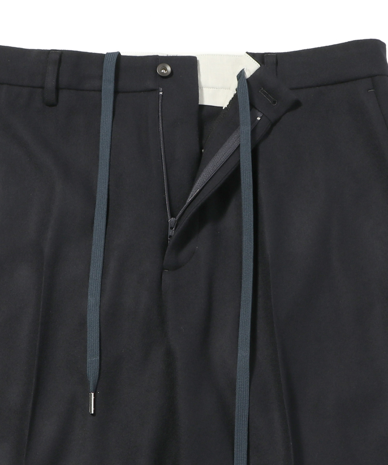 カシミヤのフランネル生地に比べて“ウールらしさ”を感じるクラシックながらもフレッシュな素材感が特徴です。ベルトループに加え、ドローコードもついている為、快適に着用いただけます。裏地をあえて付けずに仕立てることで、この生地ならではの上質な肌触りを存分に楽しめる一本。