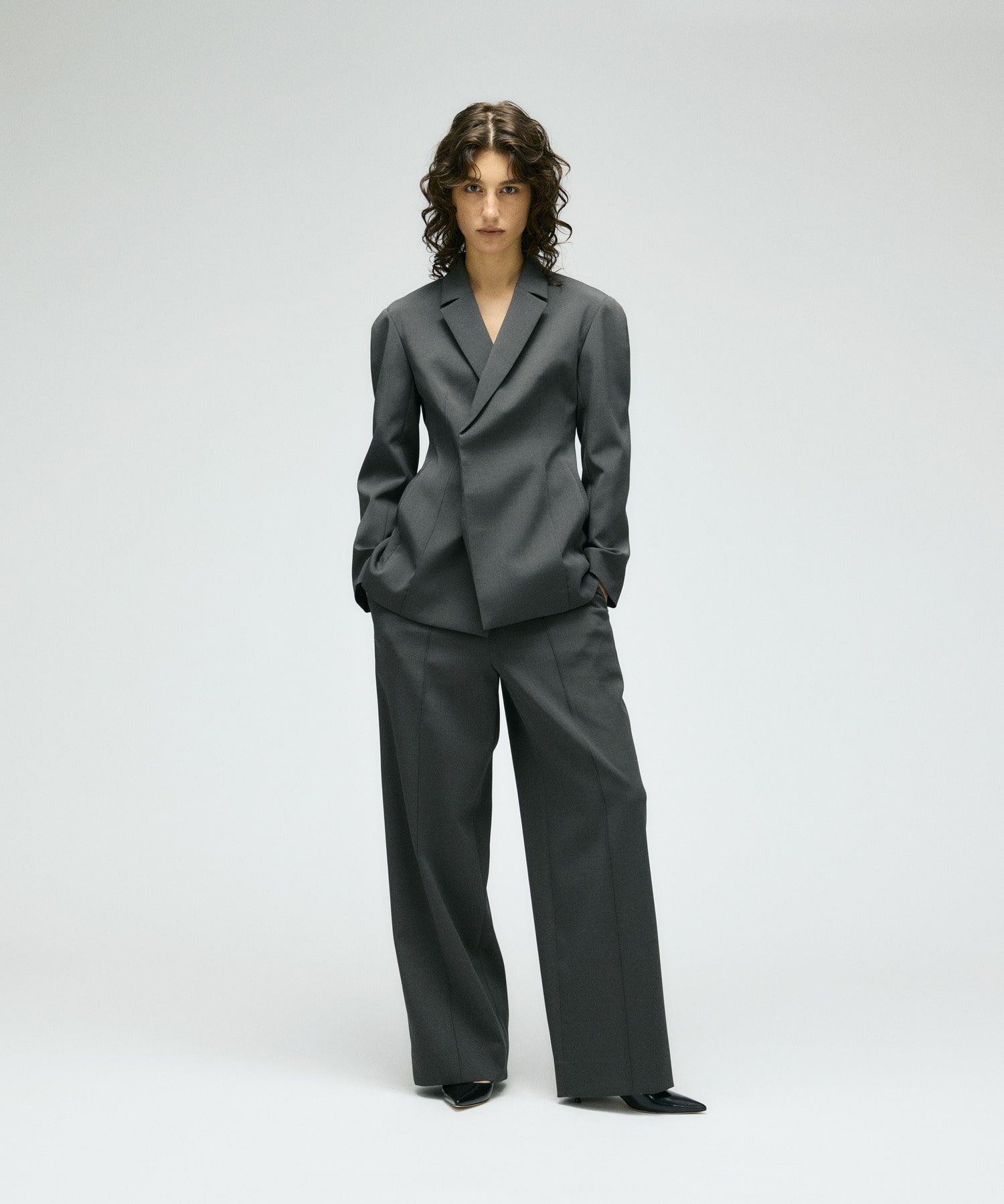 ピンタックでラインディテールのアクセントを付けたマスキュリンなデザイン。