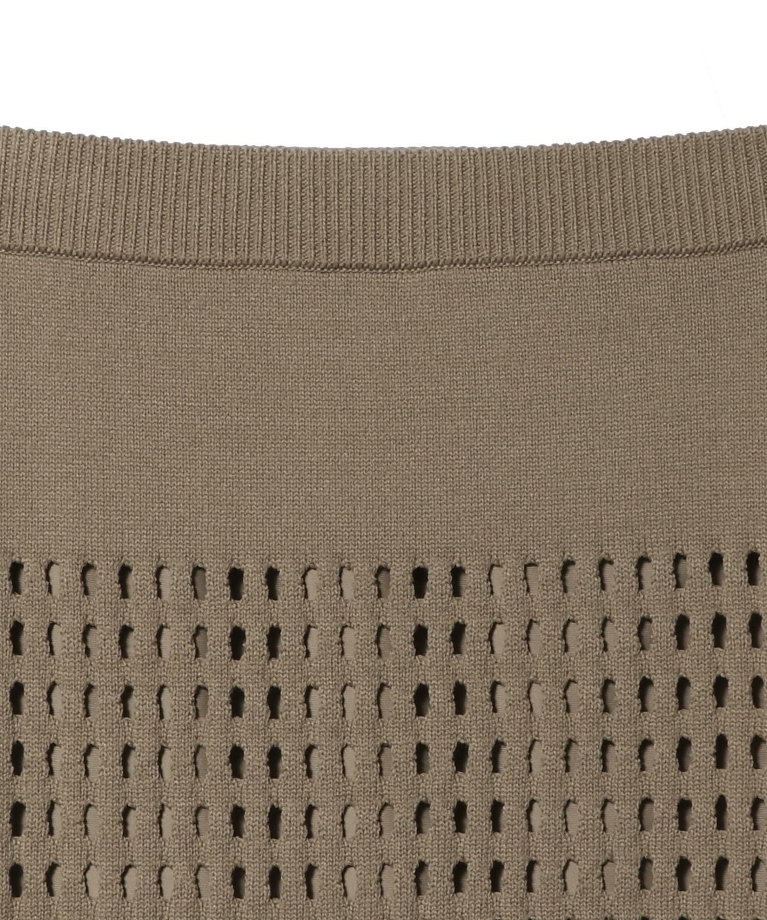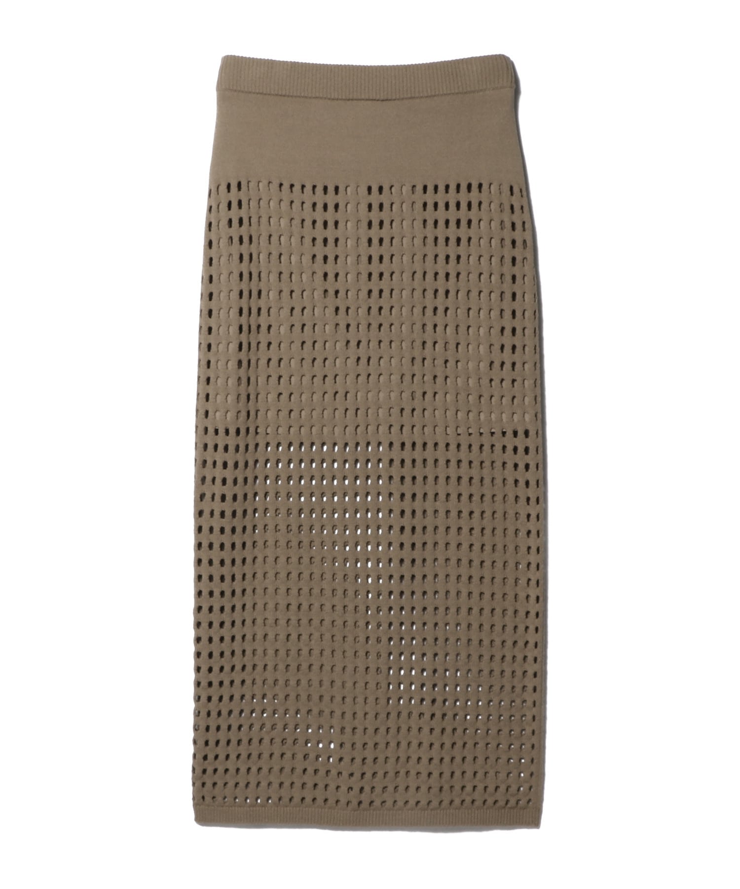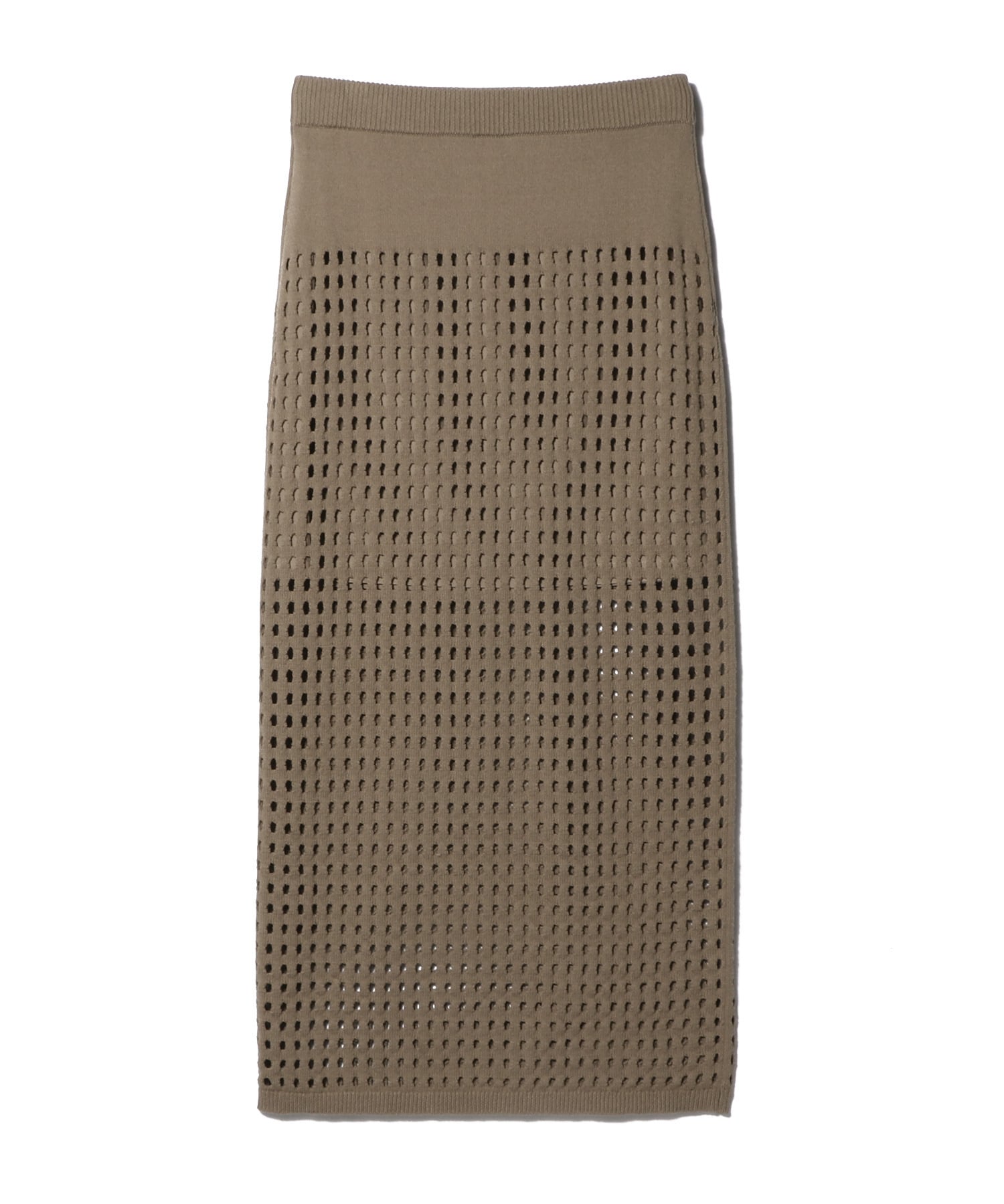 コットン×ポリエステルのふくらみのある糸でアイレット柄に編み立てたニットスカート。