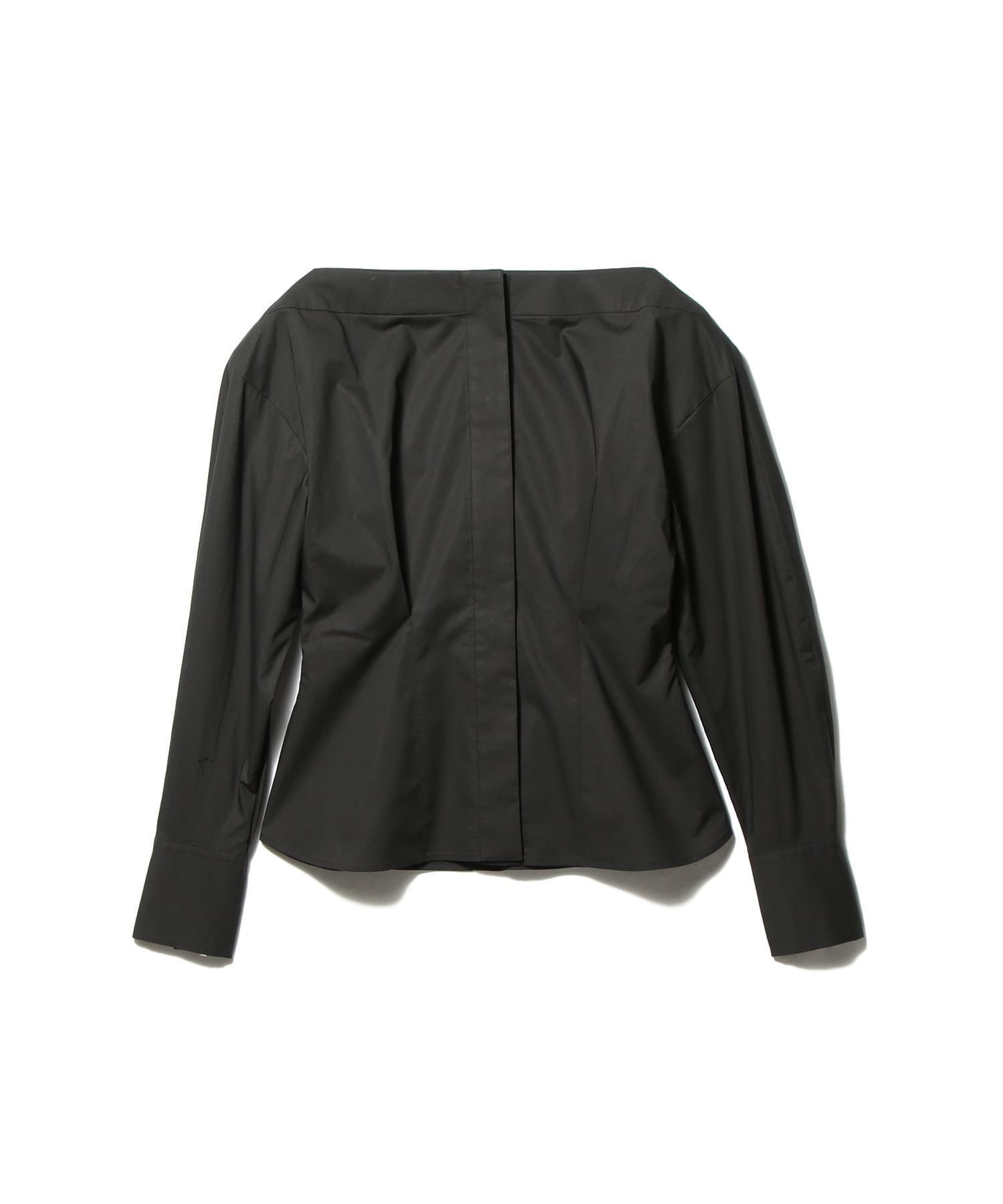 比翼仕立てで上品なペプラムフレアのボートネックシャツ。