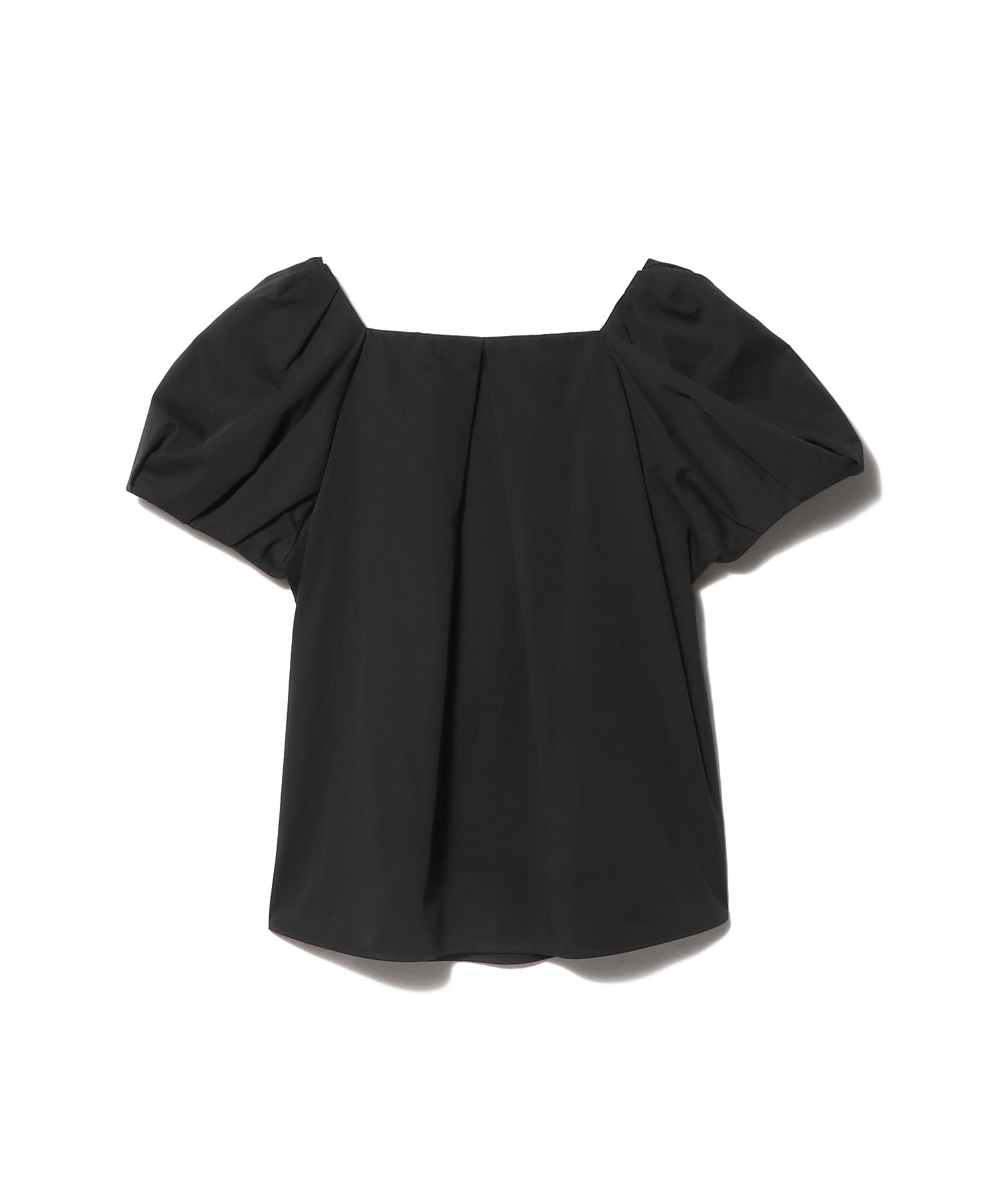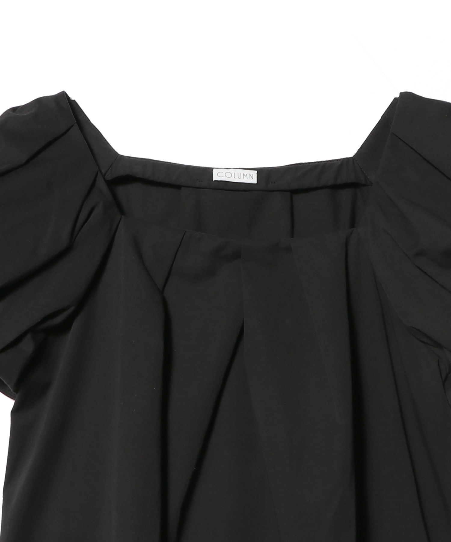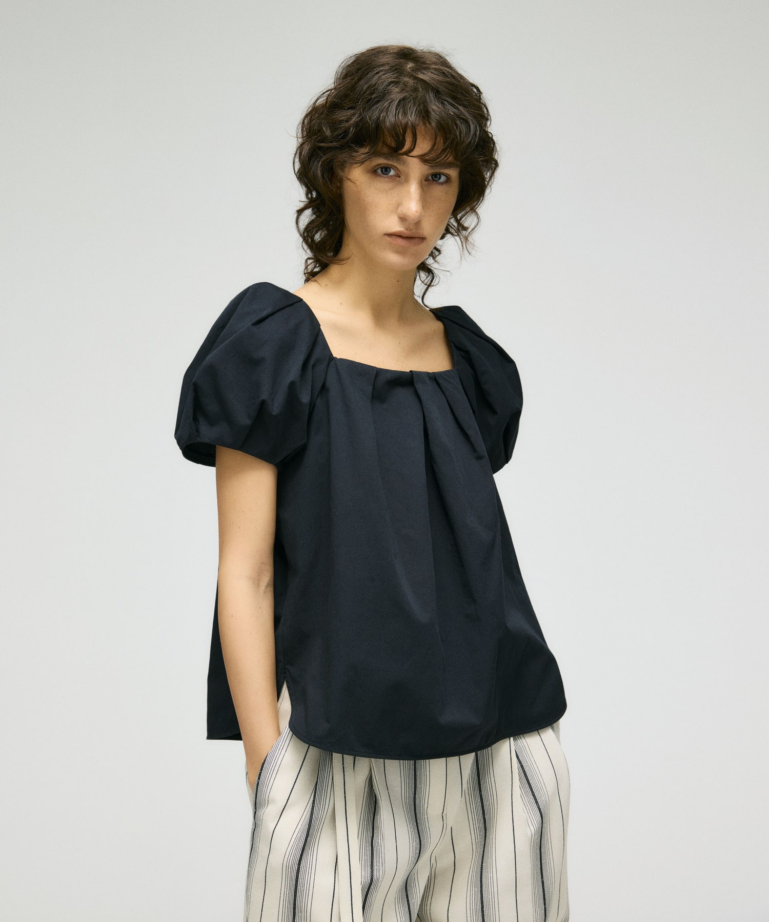 デコルテを美しく見せるスクエアネックに、二の腕カバーが叶うボリュームスリーブのデザイン。