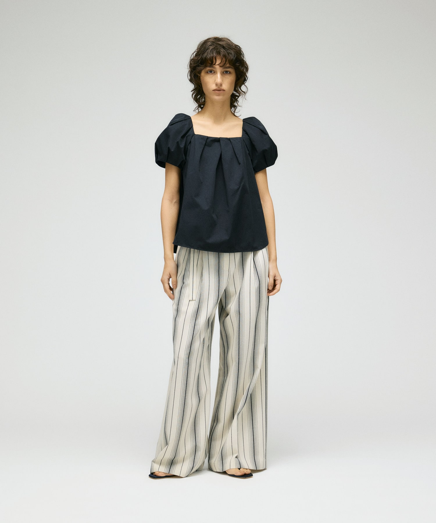 袖とネックラインに入れたイレギュラータックがニュアンス感を添えるブラウス。