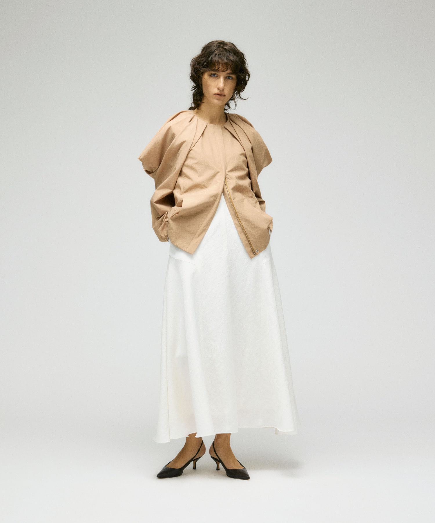 光沢感と自然なシボ感を施した素材を使用。適度なハリとエアリーな風合いに仕上げました。