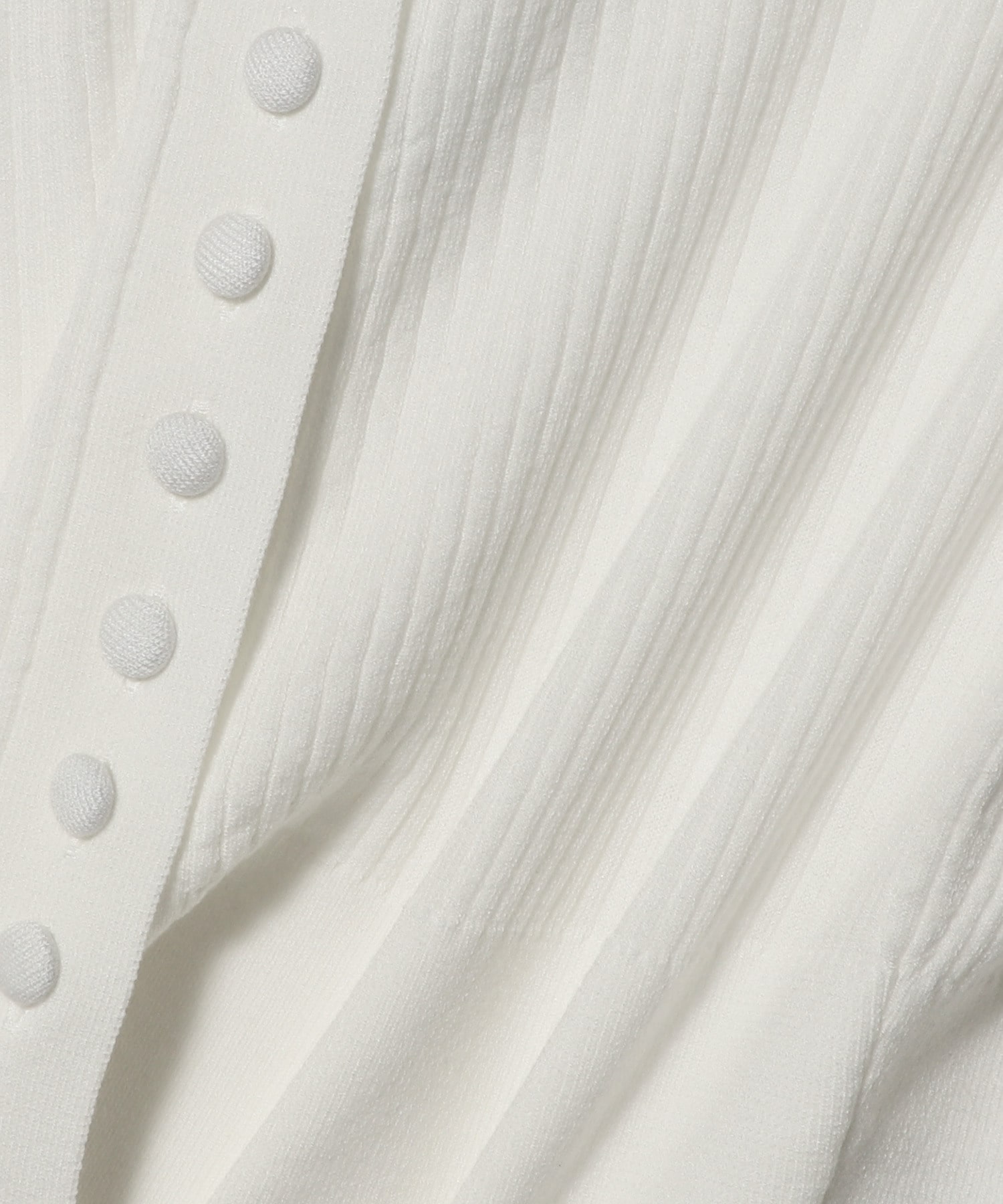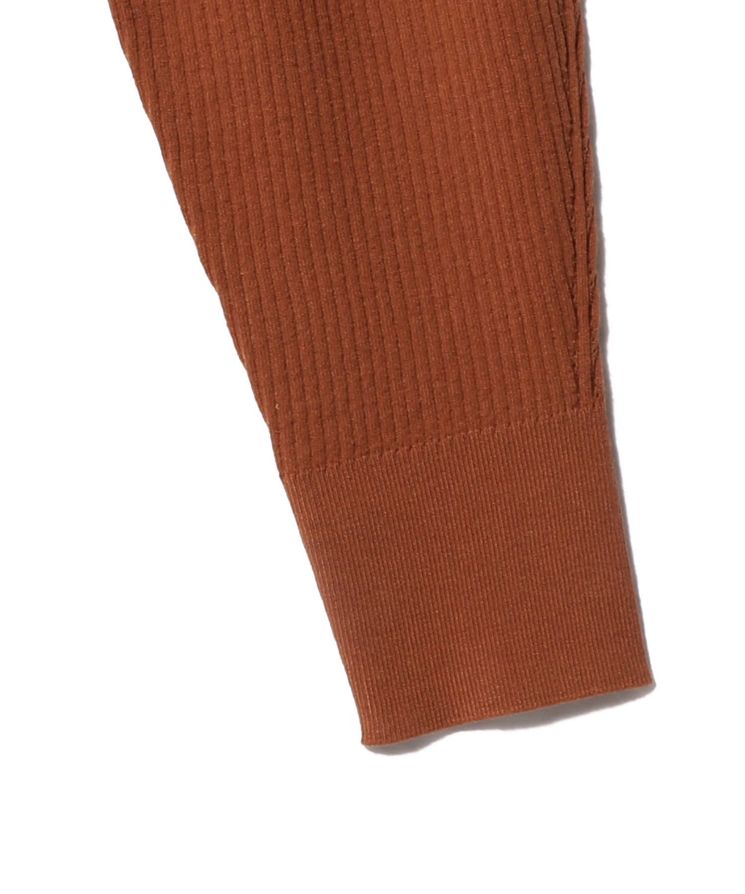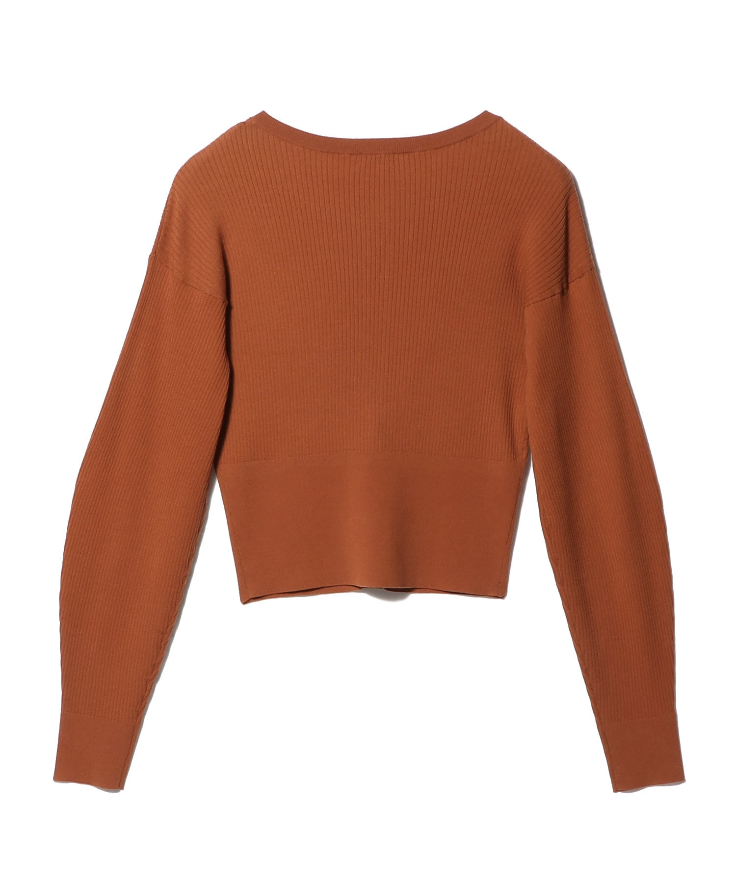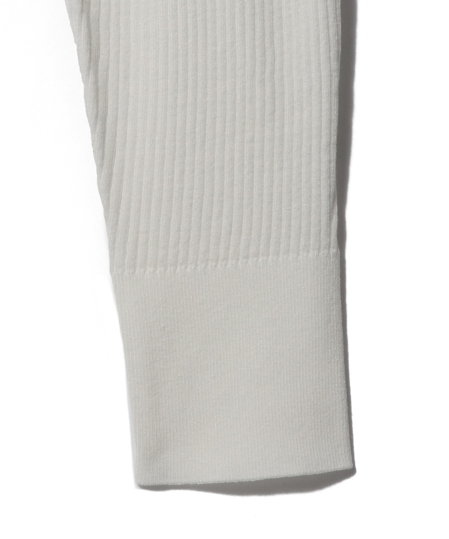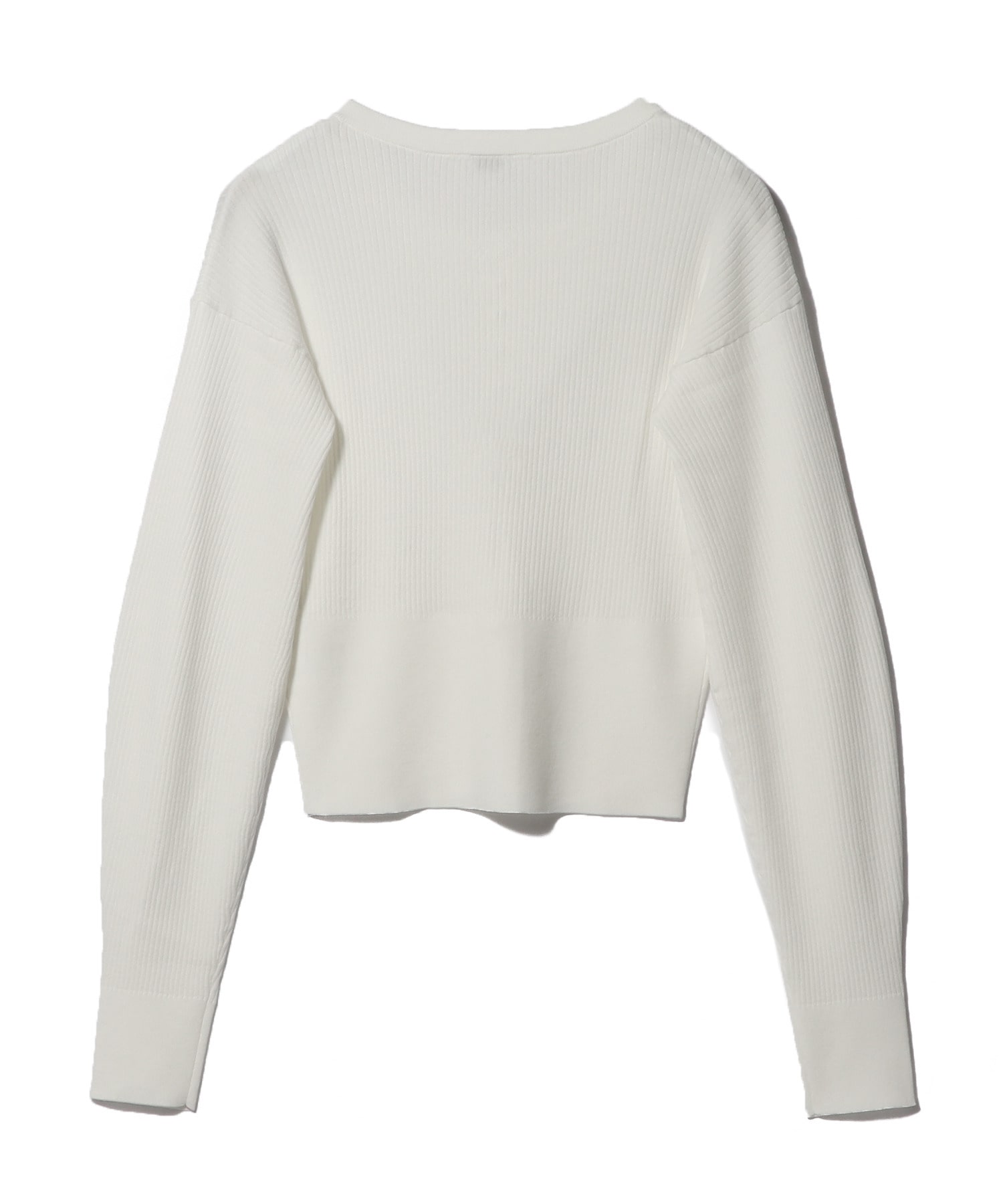 ウエストで編地を切り替えたデザインで、ボディは細リブにクルーネックでスポーティな見え方に。着用した時にハの字に開くよう、ウエスト下は釦を付けず、タイトなシルエットで女性らしいデザインにしています。