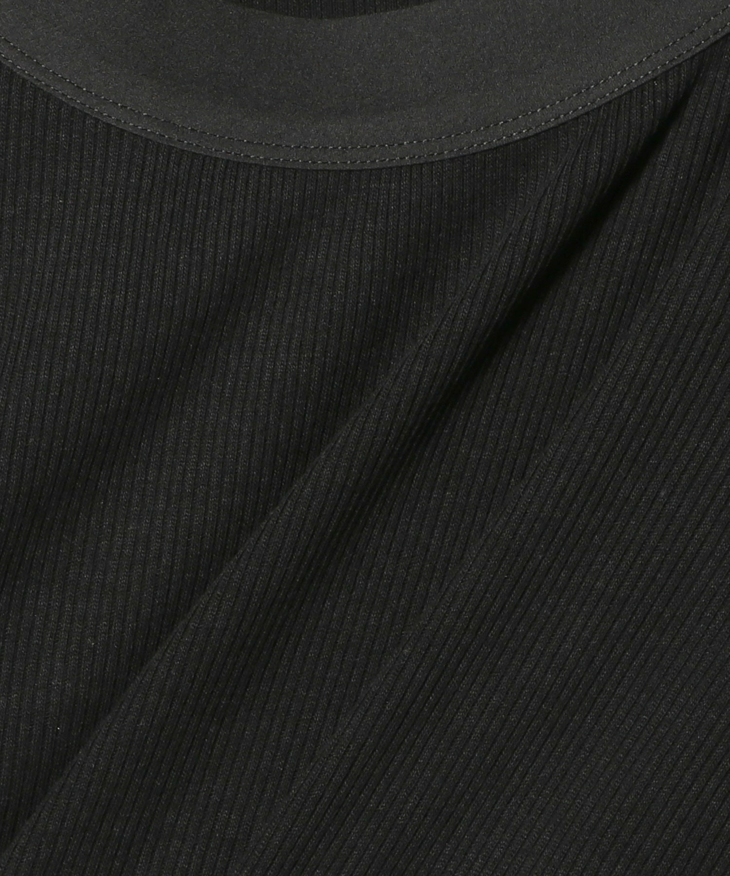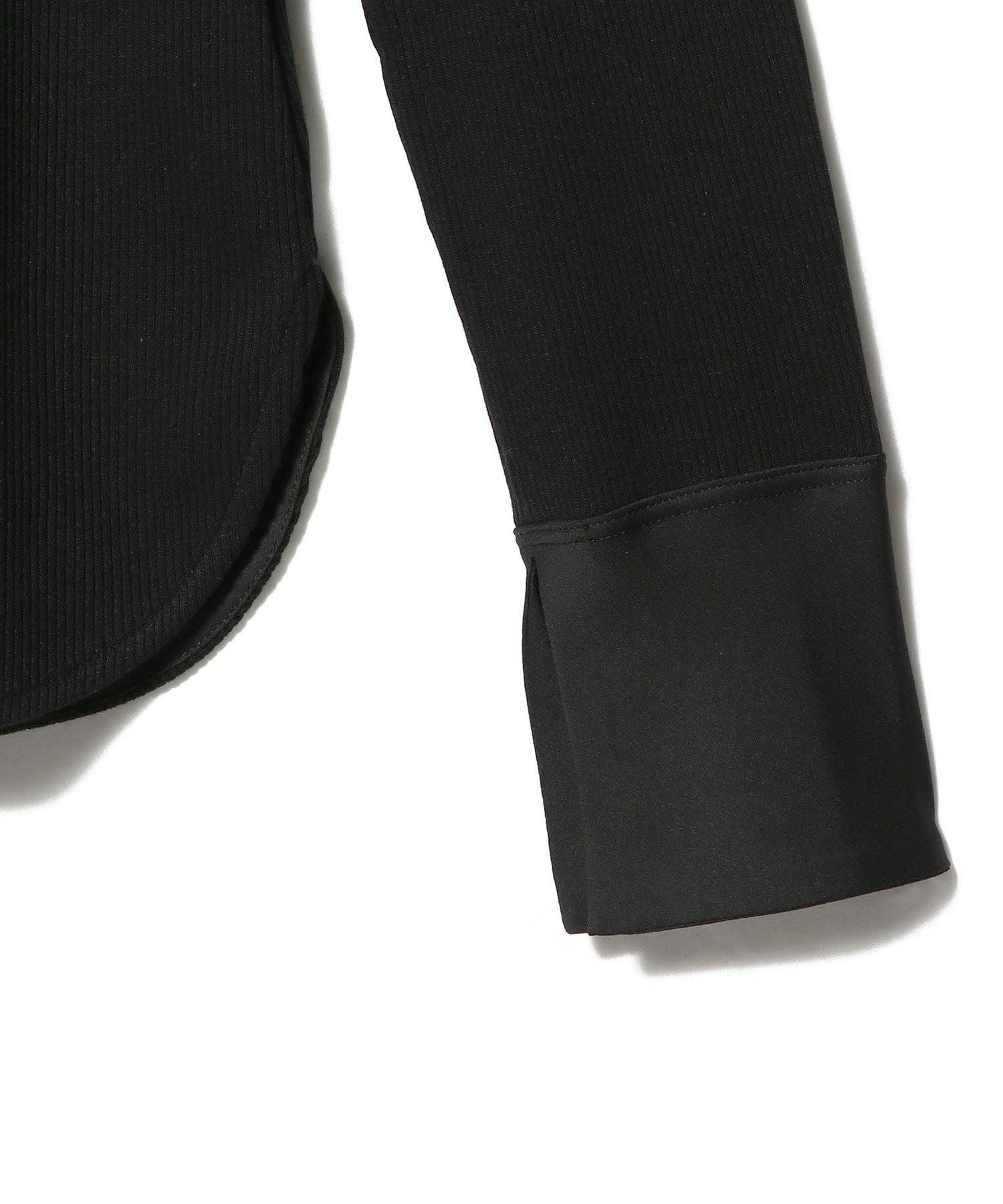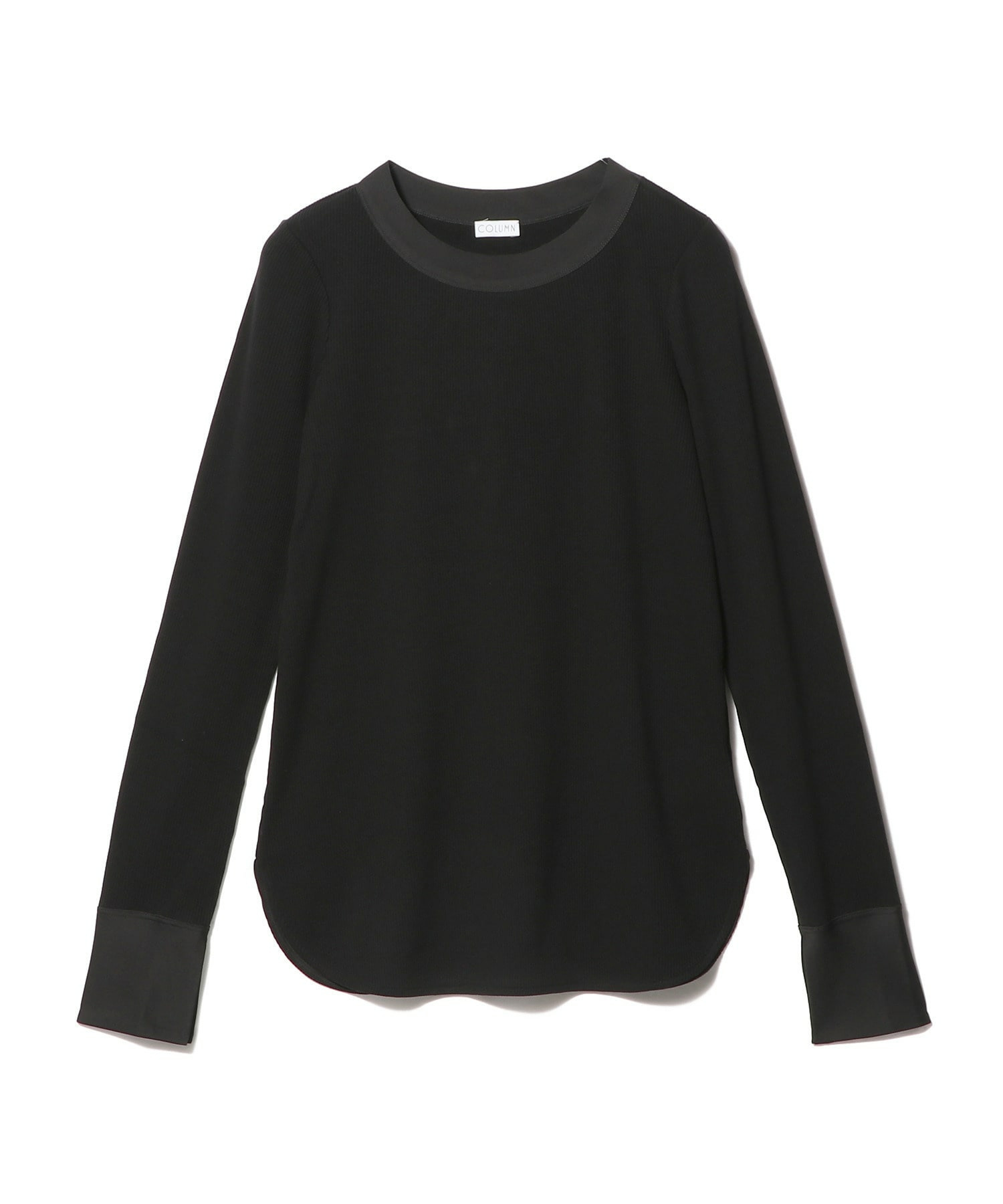 ナチュラルフィットなシルエットで、裾はインもアウトも様になるラウンドデザインが特徴。襟ぐり、袖口カフスに布帛の異素材を施したデザイントップスです。