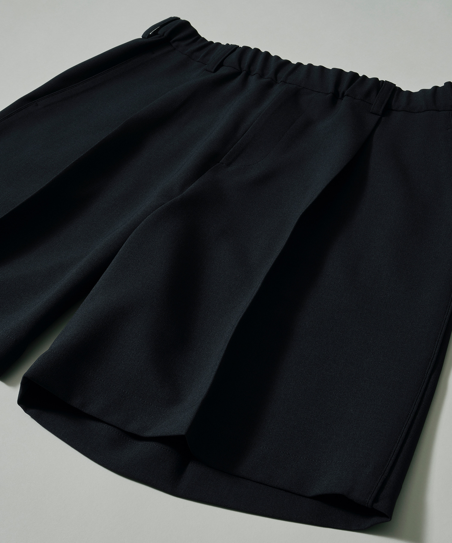 梳毛ウールで作られるトロピカル生地の風合いをポリエステルで再現した素材を使用したショーツ。