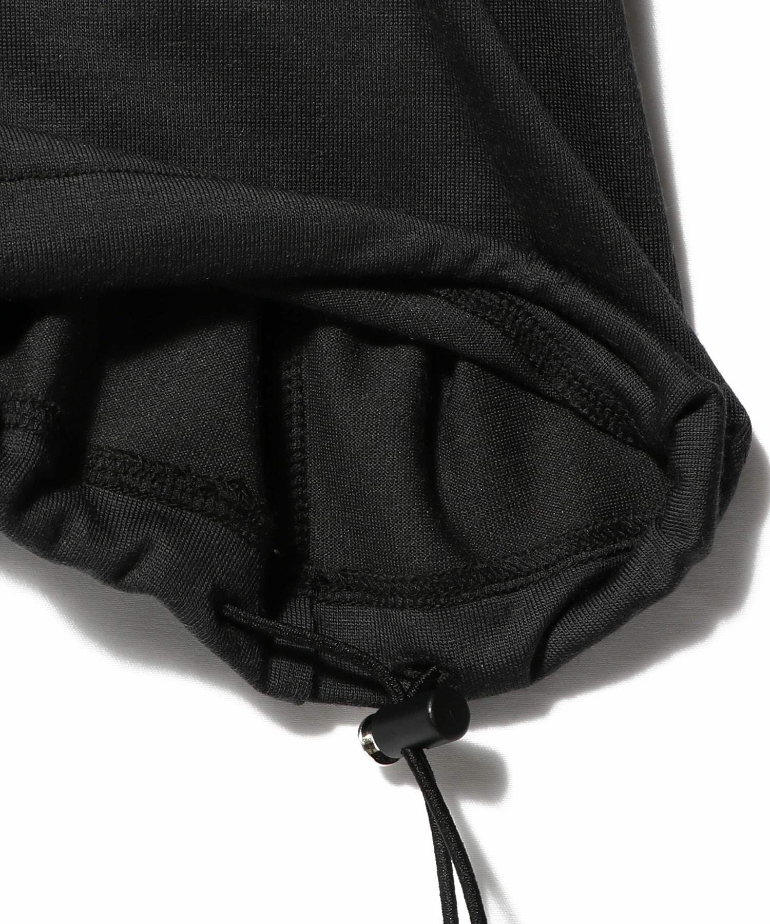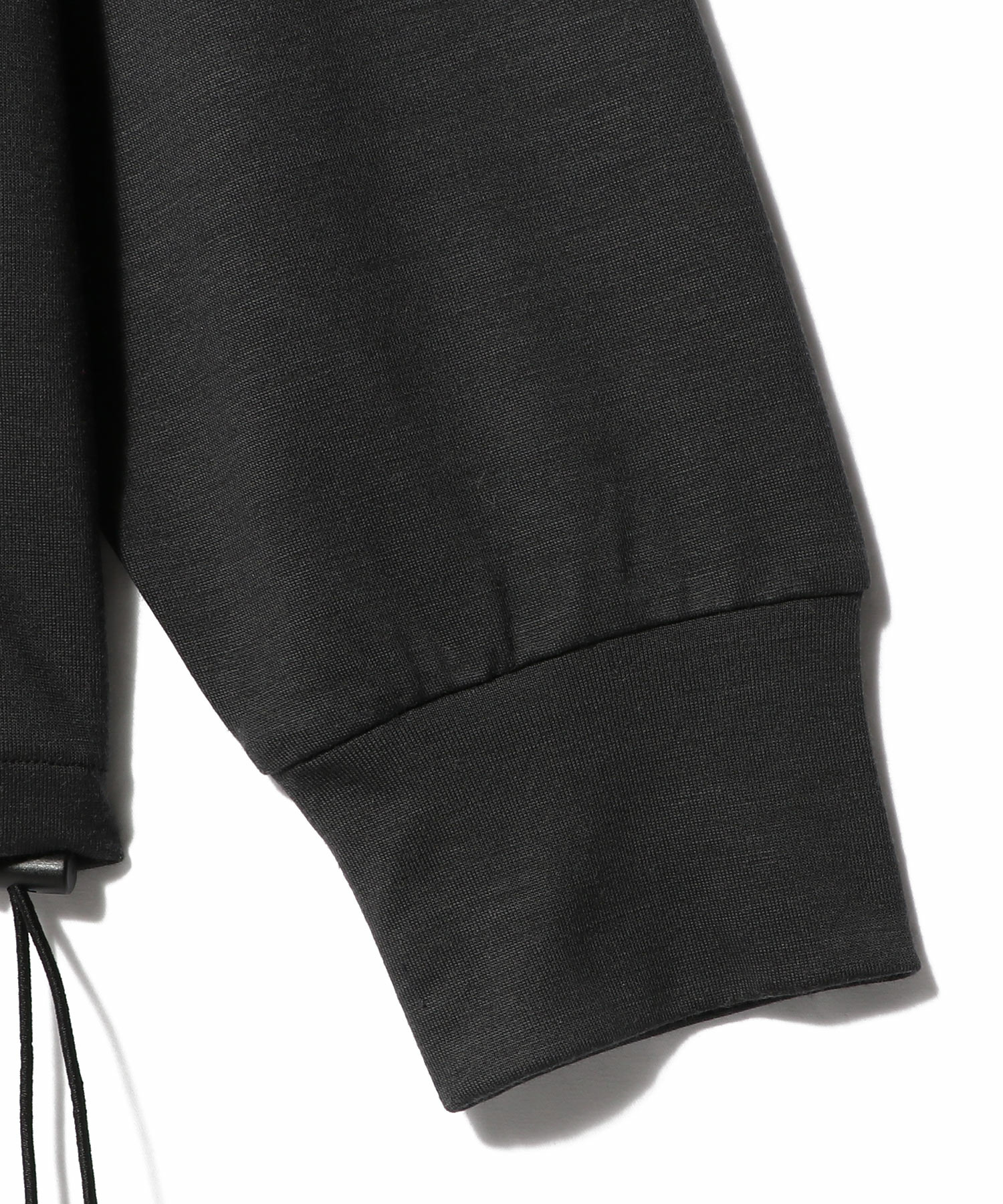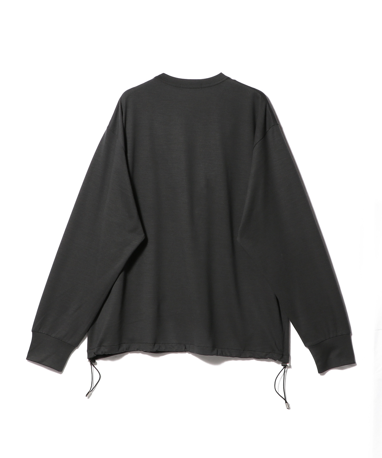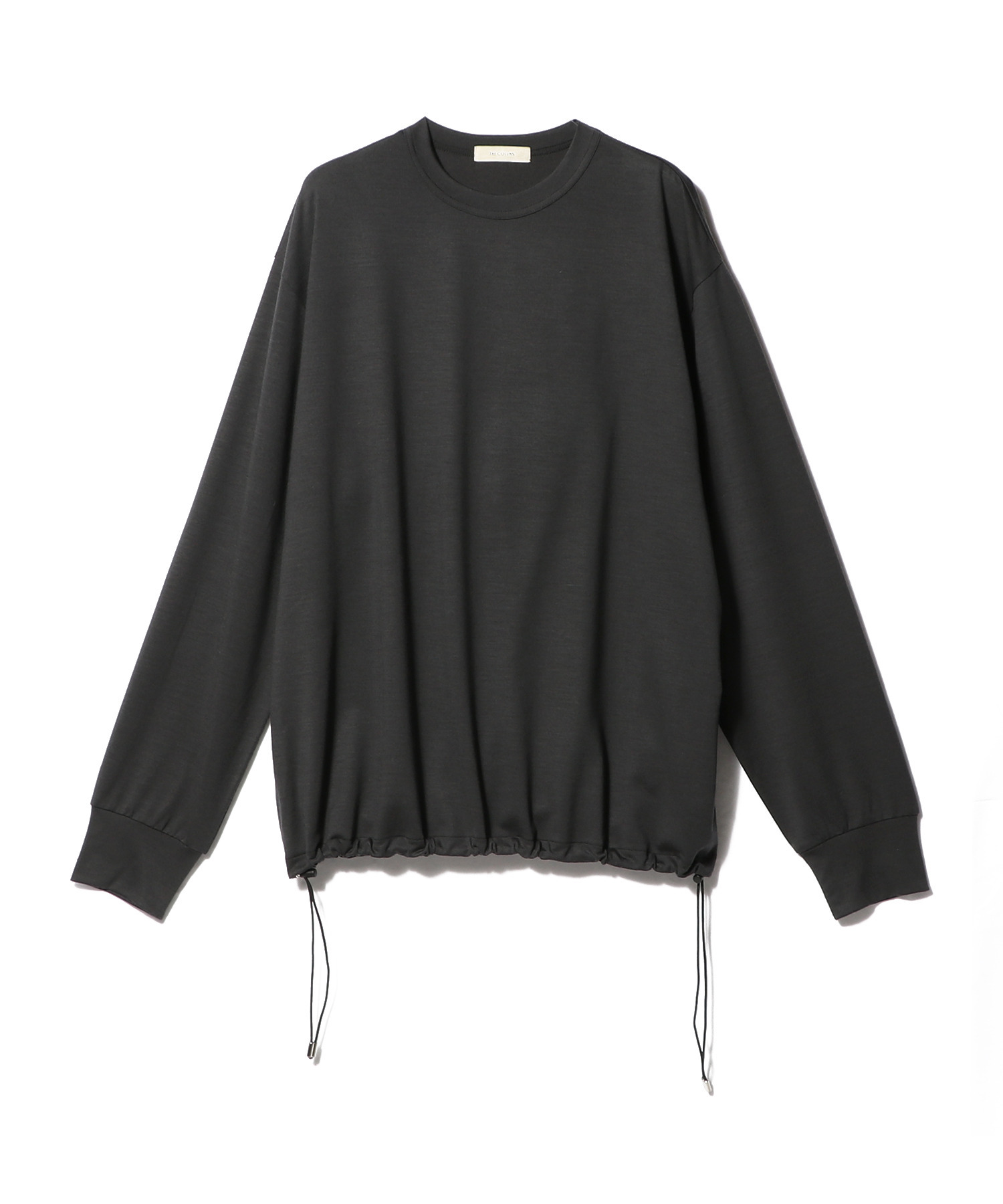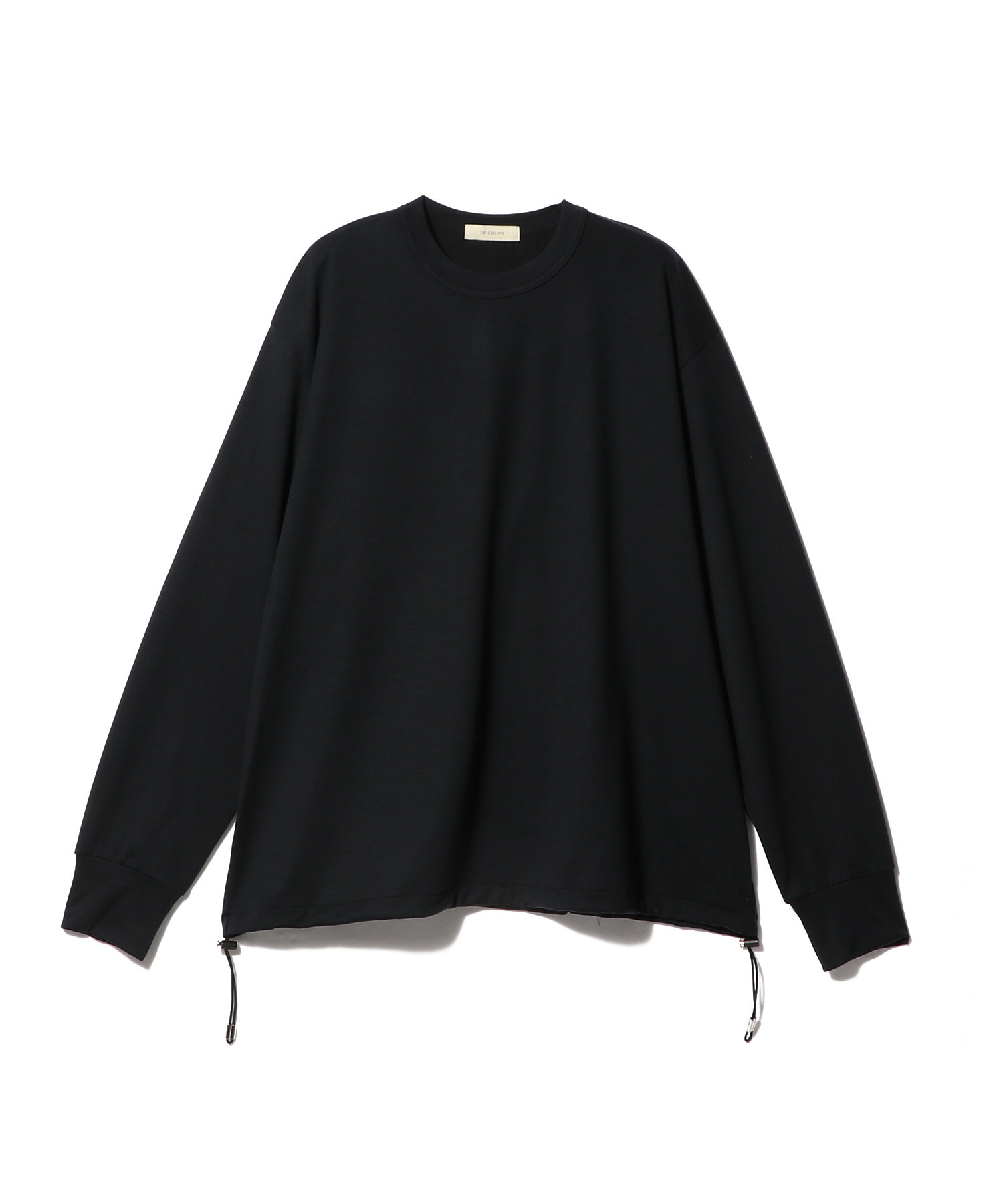 ウールの上質な光沢感と優しいタッチがコットンのそれとは一線を画す素材。マシンウォッシャブルというのも嬉しい機能です。一見ベーシックな印象ですが、裾にドローコードを組み込み、シルエットに可変性を持たせた一枚。コードを引けばタックインしたかのようなバランスに変化し、脇から垂れるシルバーの引手がテックライクなムードを添えます。高級感もありながら、イージーケア性も高く1年中ご愛用頂けるアイテムです。