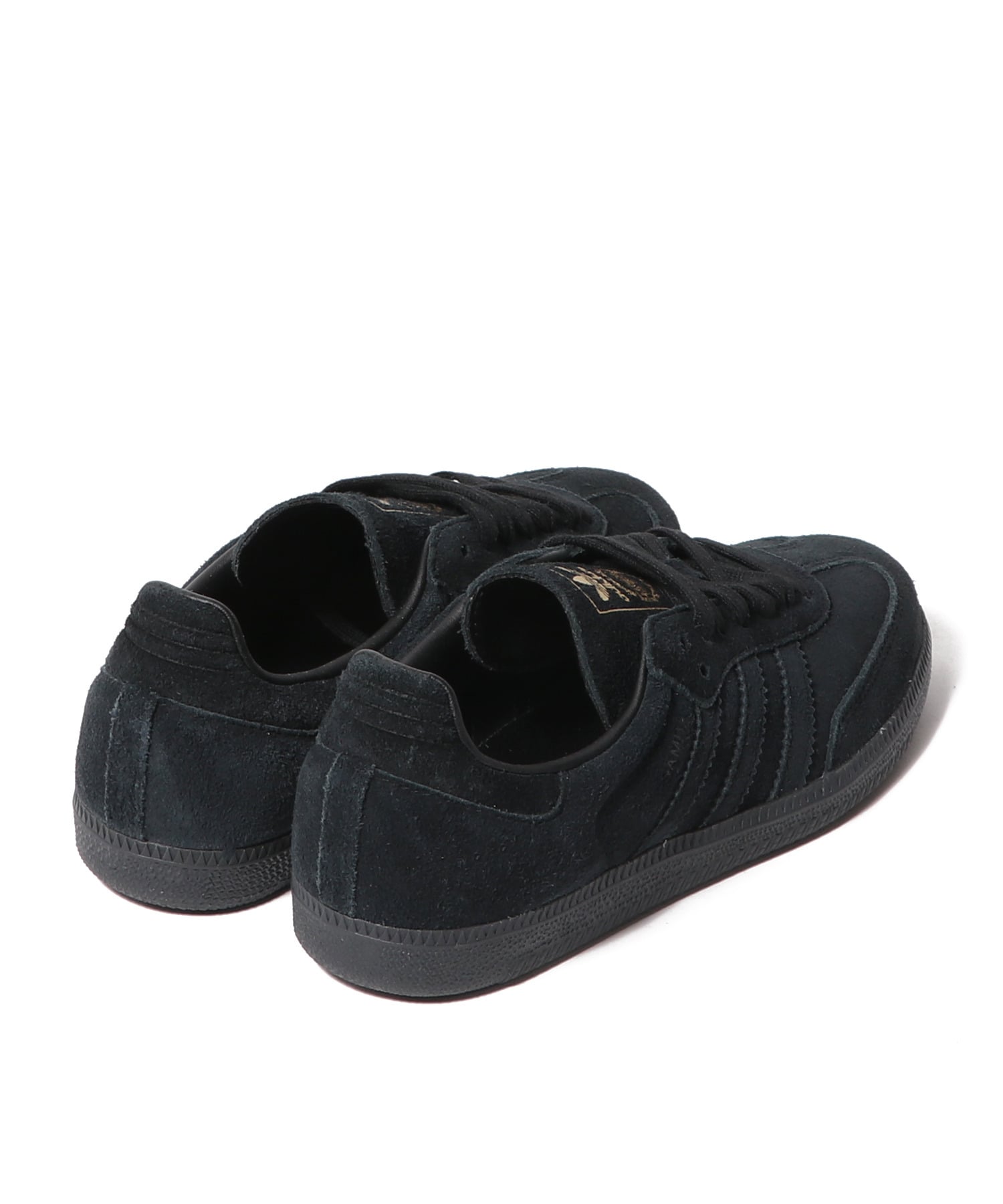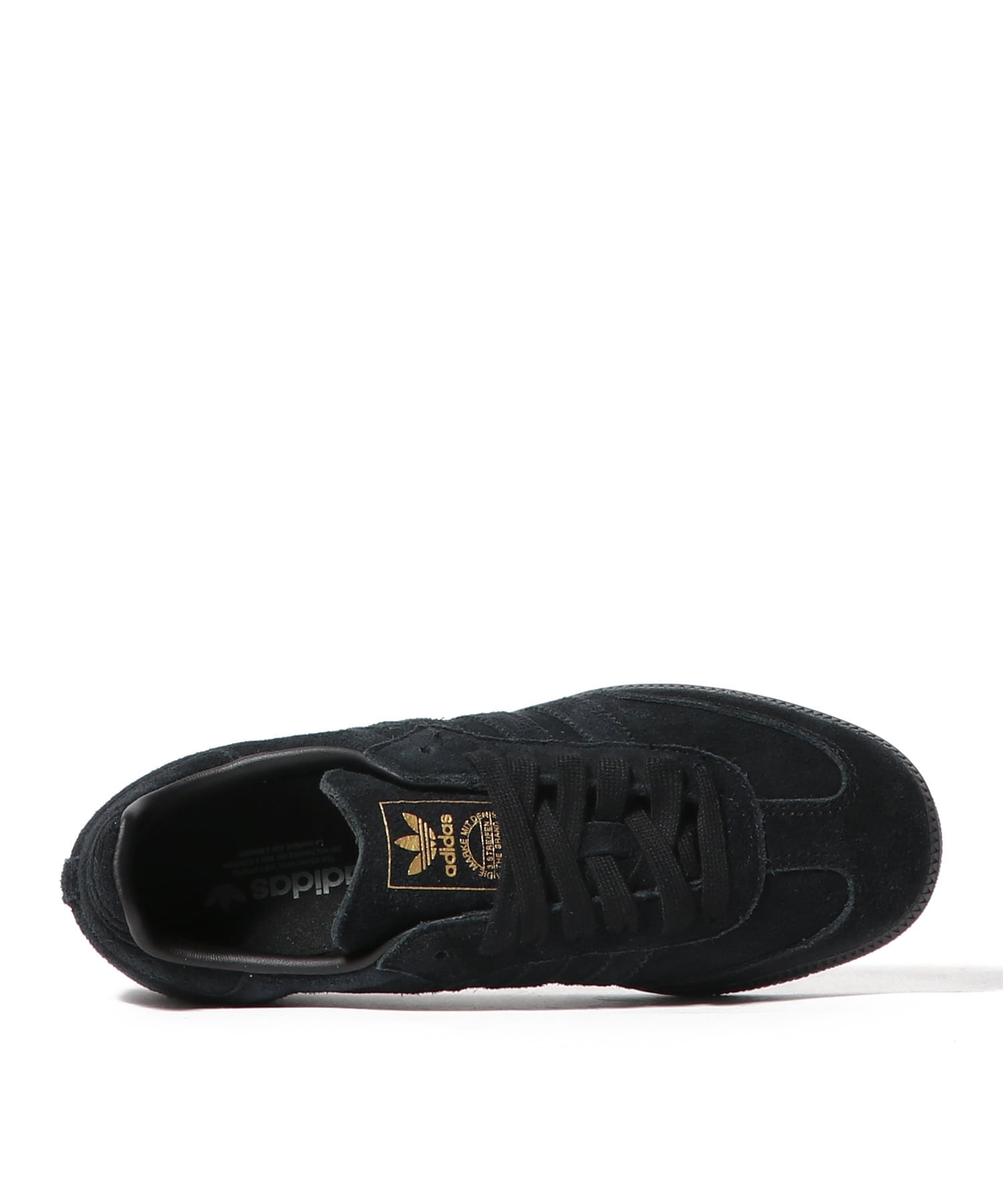 フルスエードアッパーにゴールドのシュータンのブランドとオイルプリントのSambaラテラルブランディング。