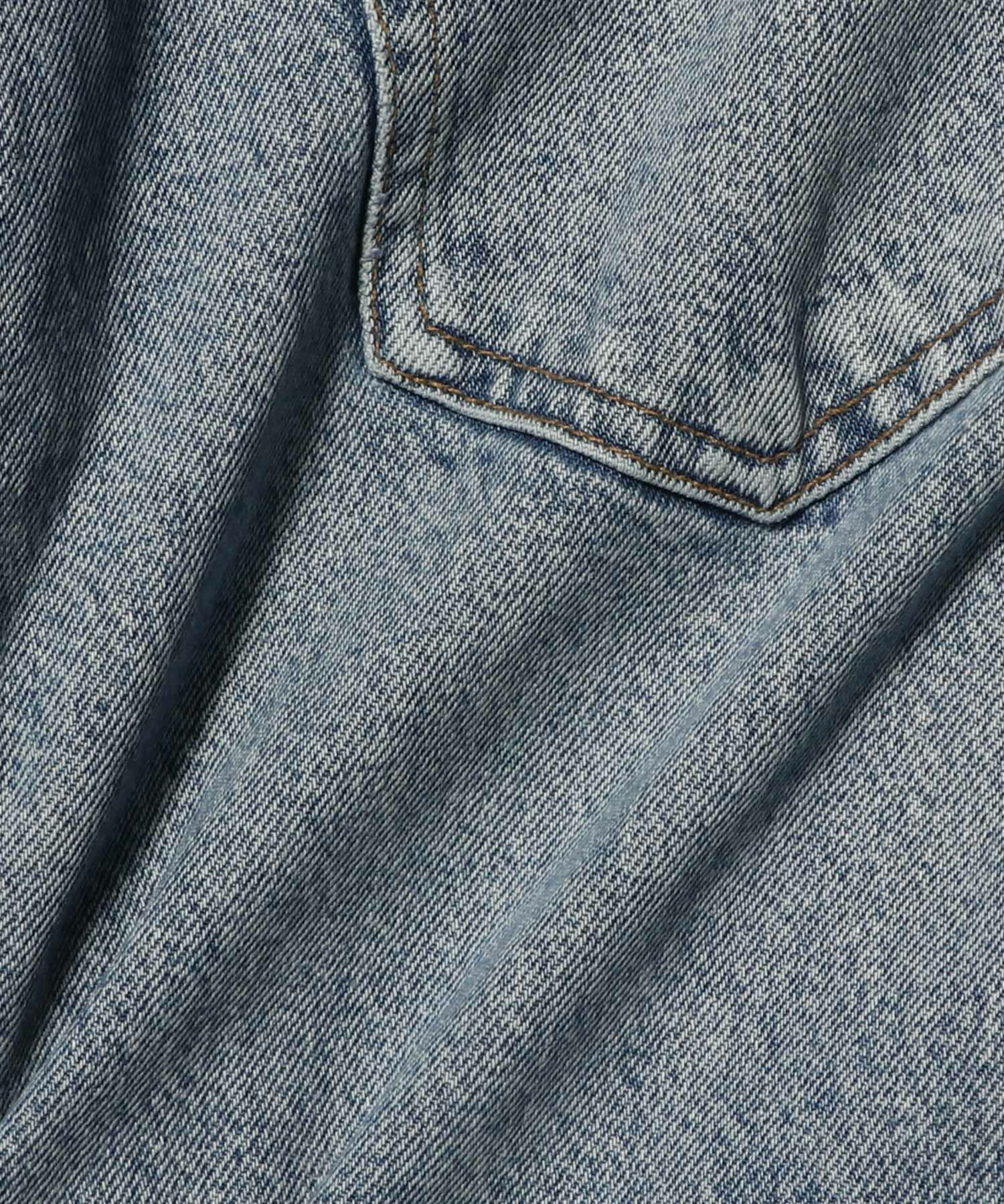 再生コットンを使用し、ミディアムヴィンテージインディゴウォッシュで仕上げました。ウィスカー加工、フェード加工、マーブル加工が施され、着古したような風合いが魅力。フィット感のあるタンクトップとヒールを合わせてコントラストを効かせたり、オーバーサイズのシャツと合わせてリラックスしたモダンなスタイルに仕上げたりと、様々なスタイルに活躍します。