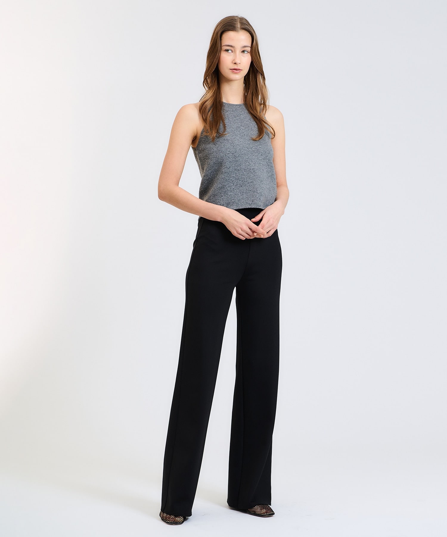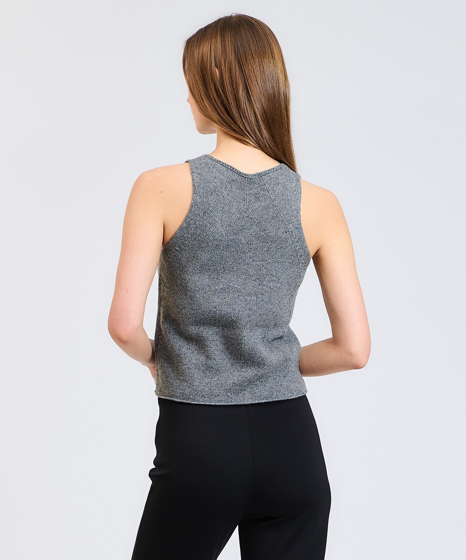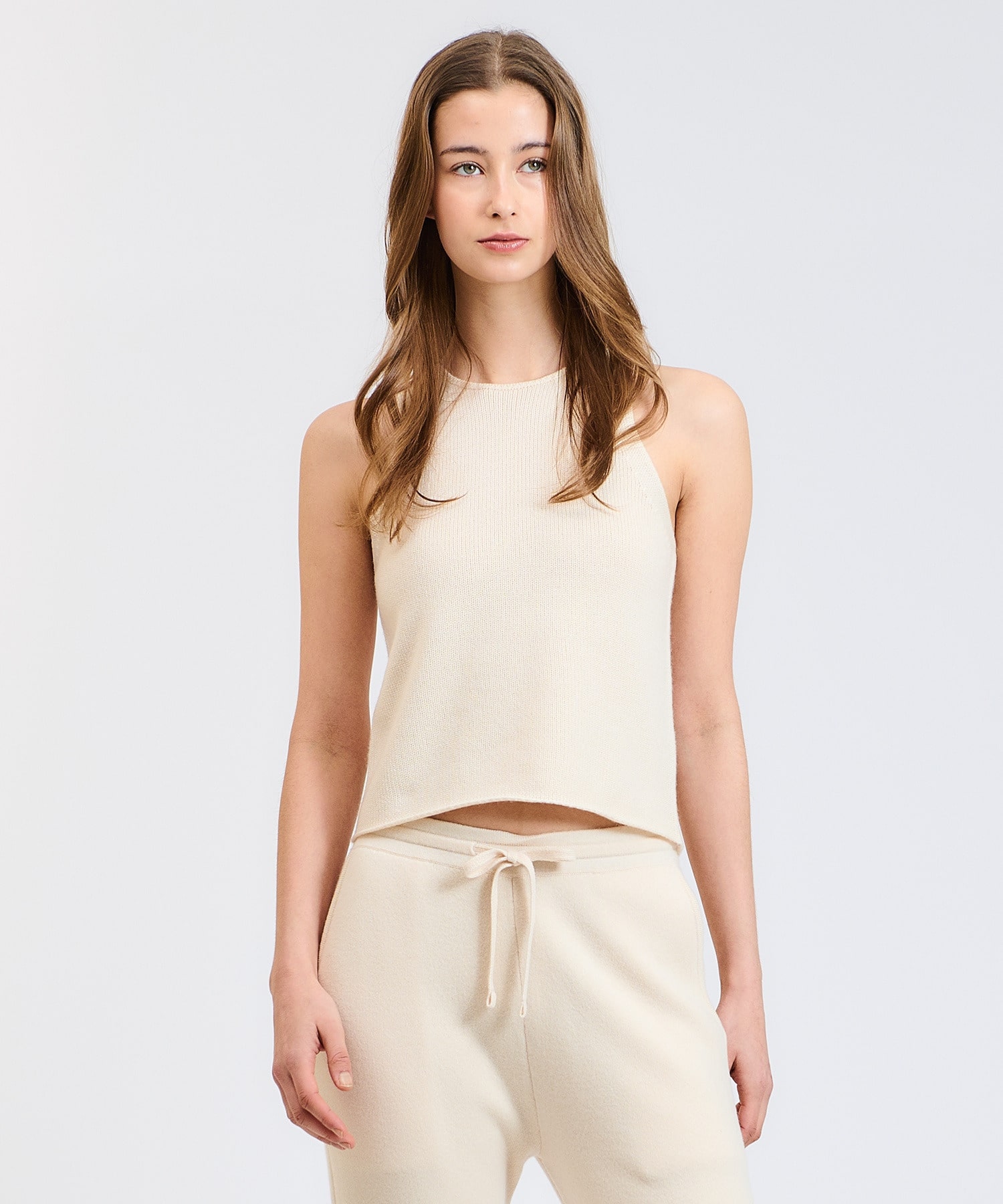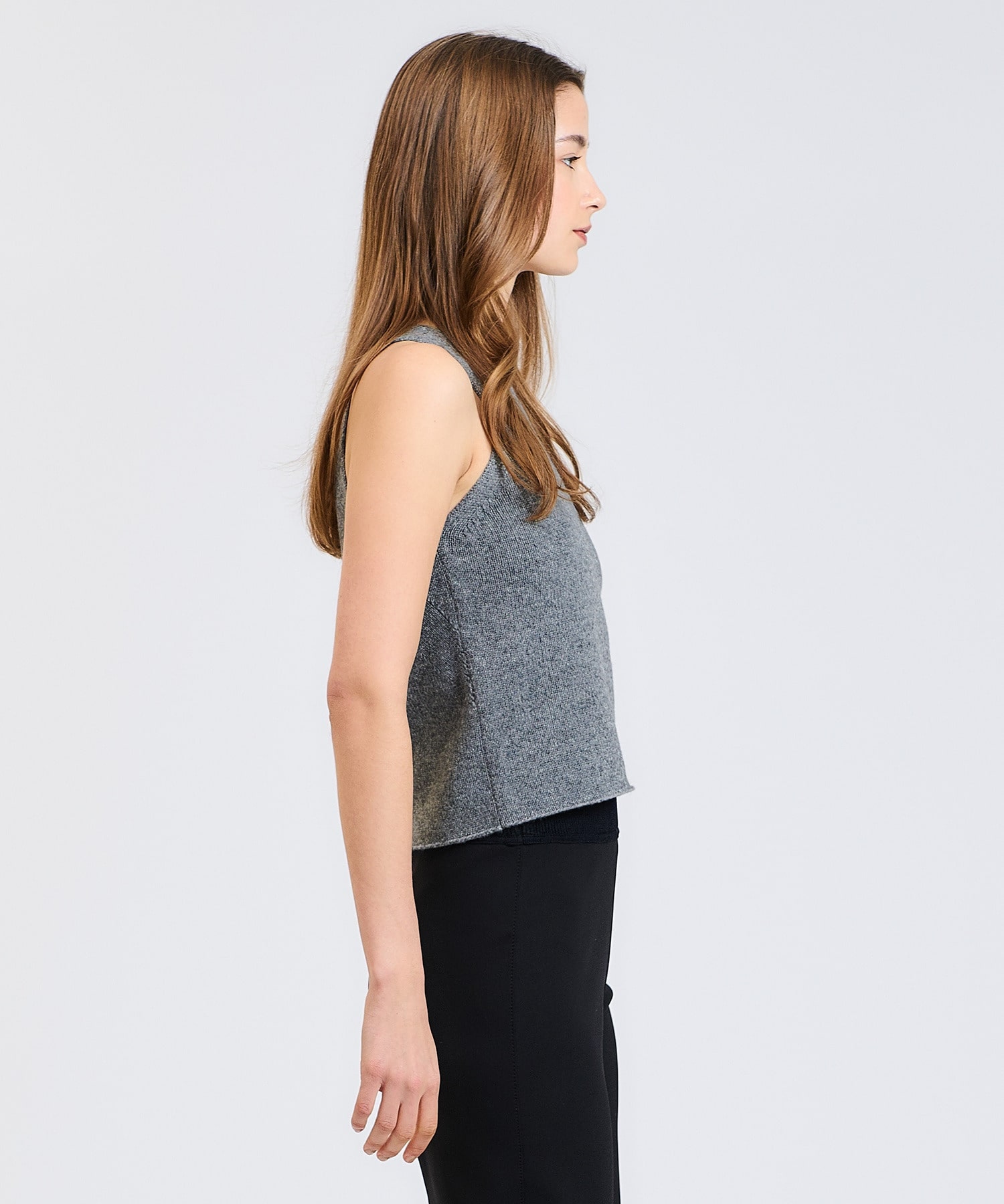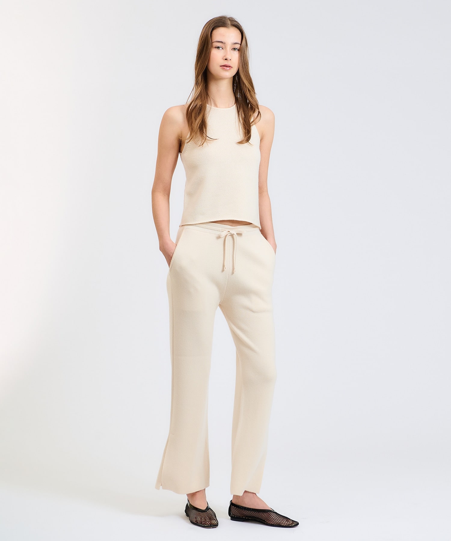 通常軽やかに仕上げるカシミアの糸を3本取りにして、ニットらしい目面とカシミヤらしい落ち感を出したラグジュアリー風合いに。