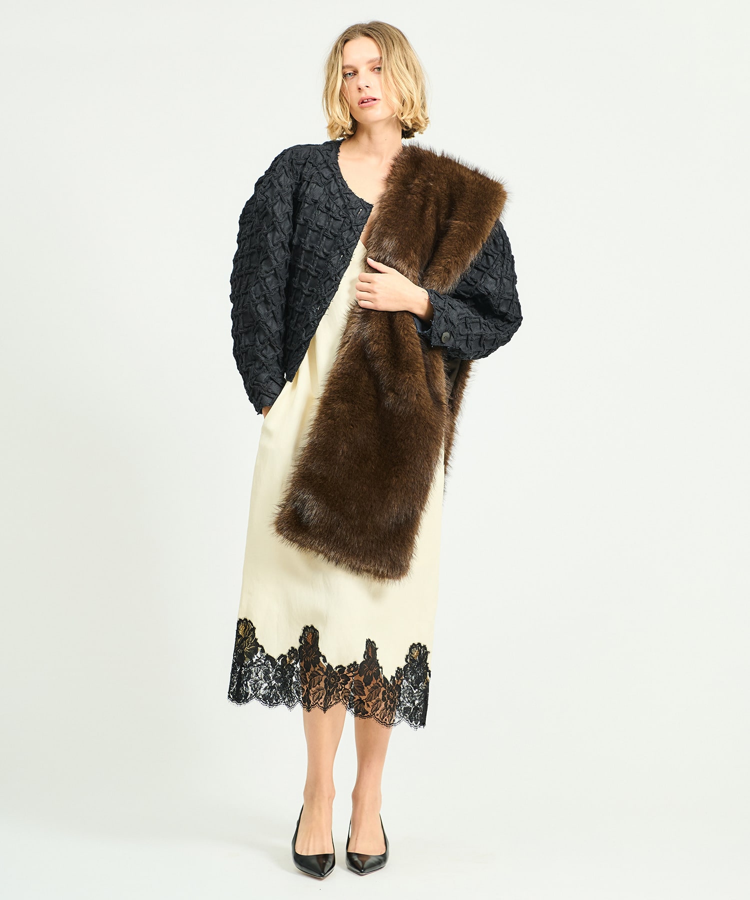 トレンドのエコファー素材を使用した、フェミニティ、女性らしさを象徴するストール。