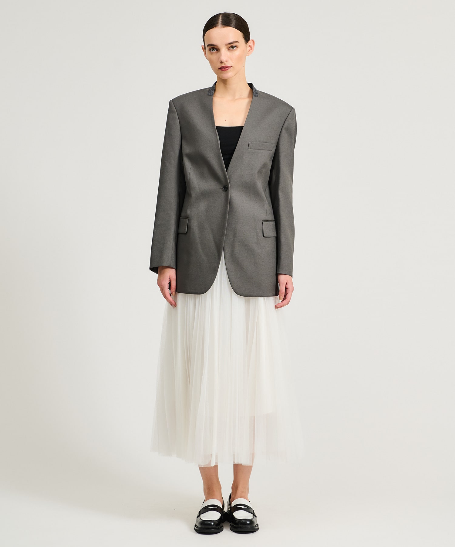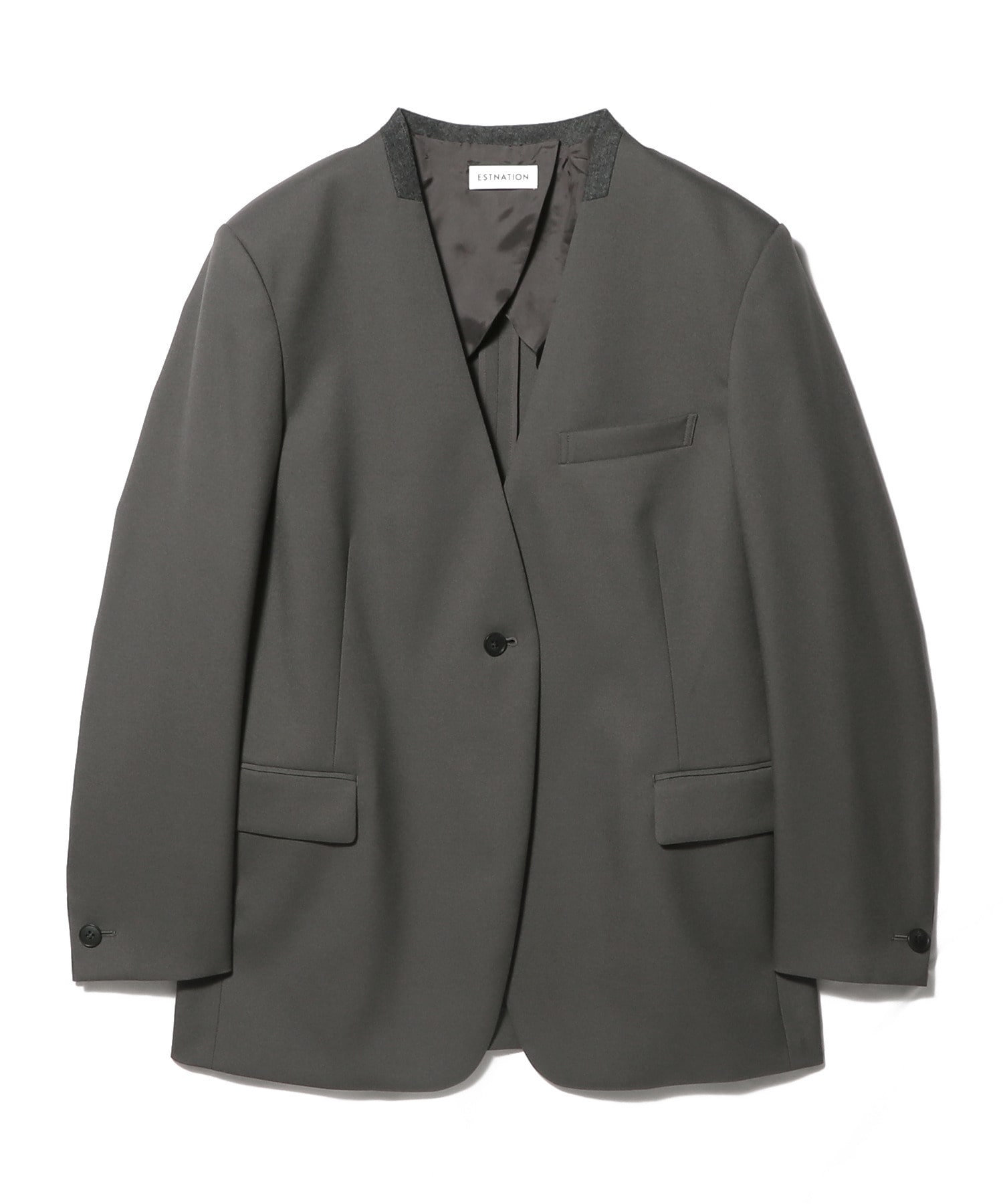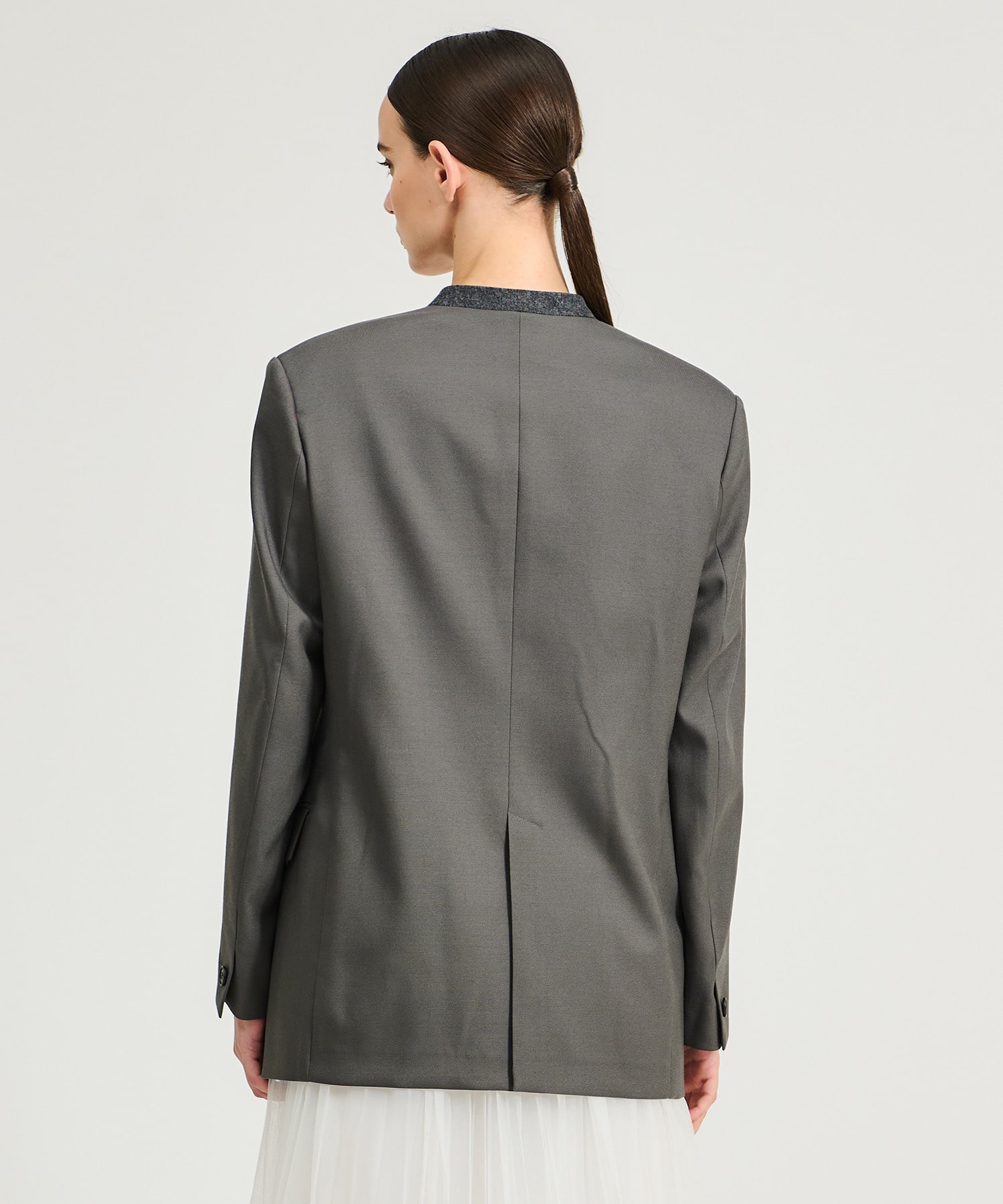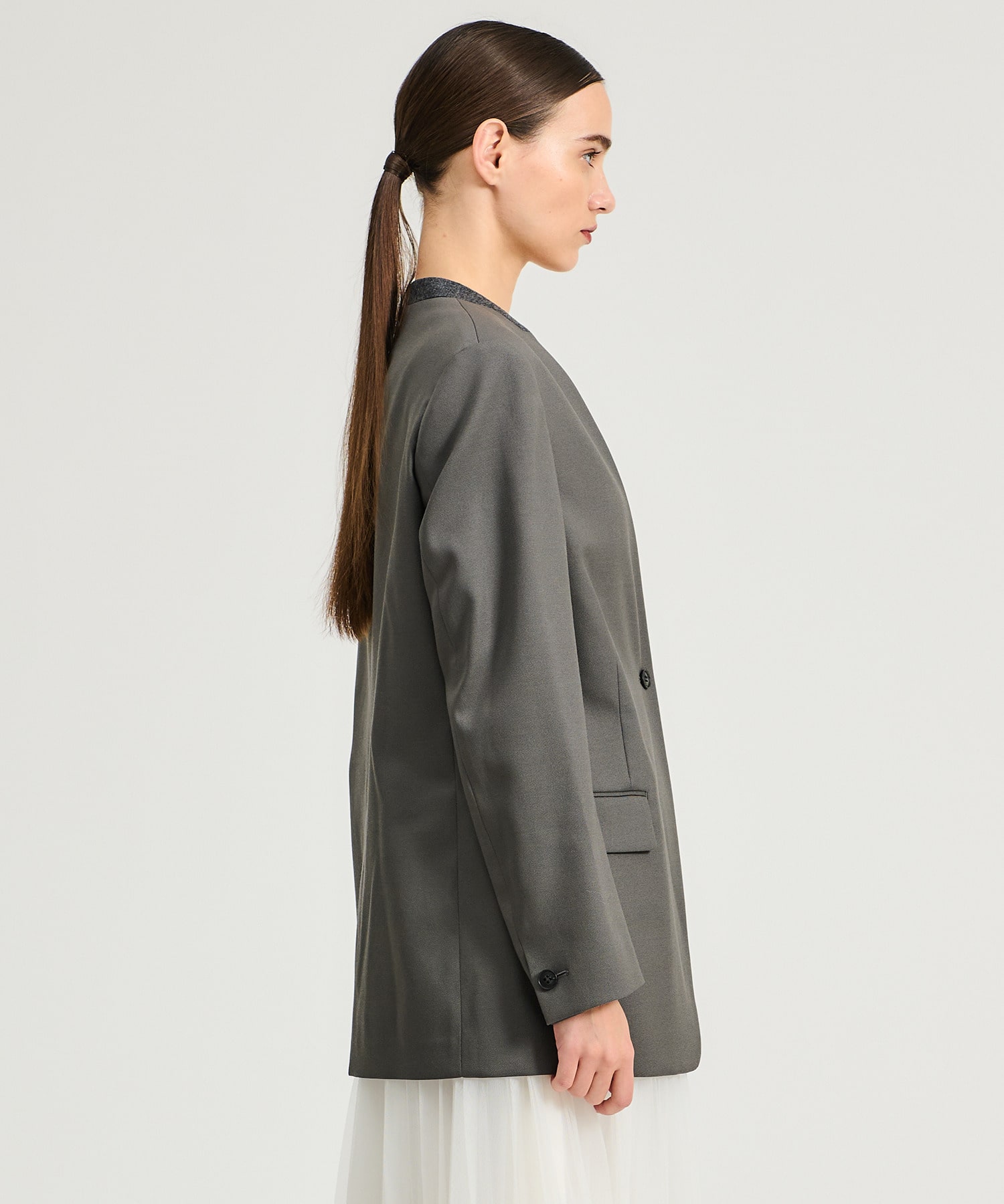 肩をやや大きめに仕立てたリラクシーなシルエットと、ノーカラーのシャープさがマスキュリンな印象のジャケット。