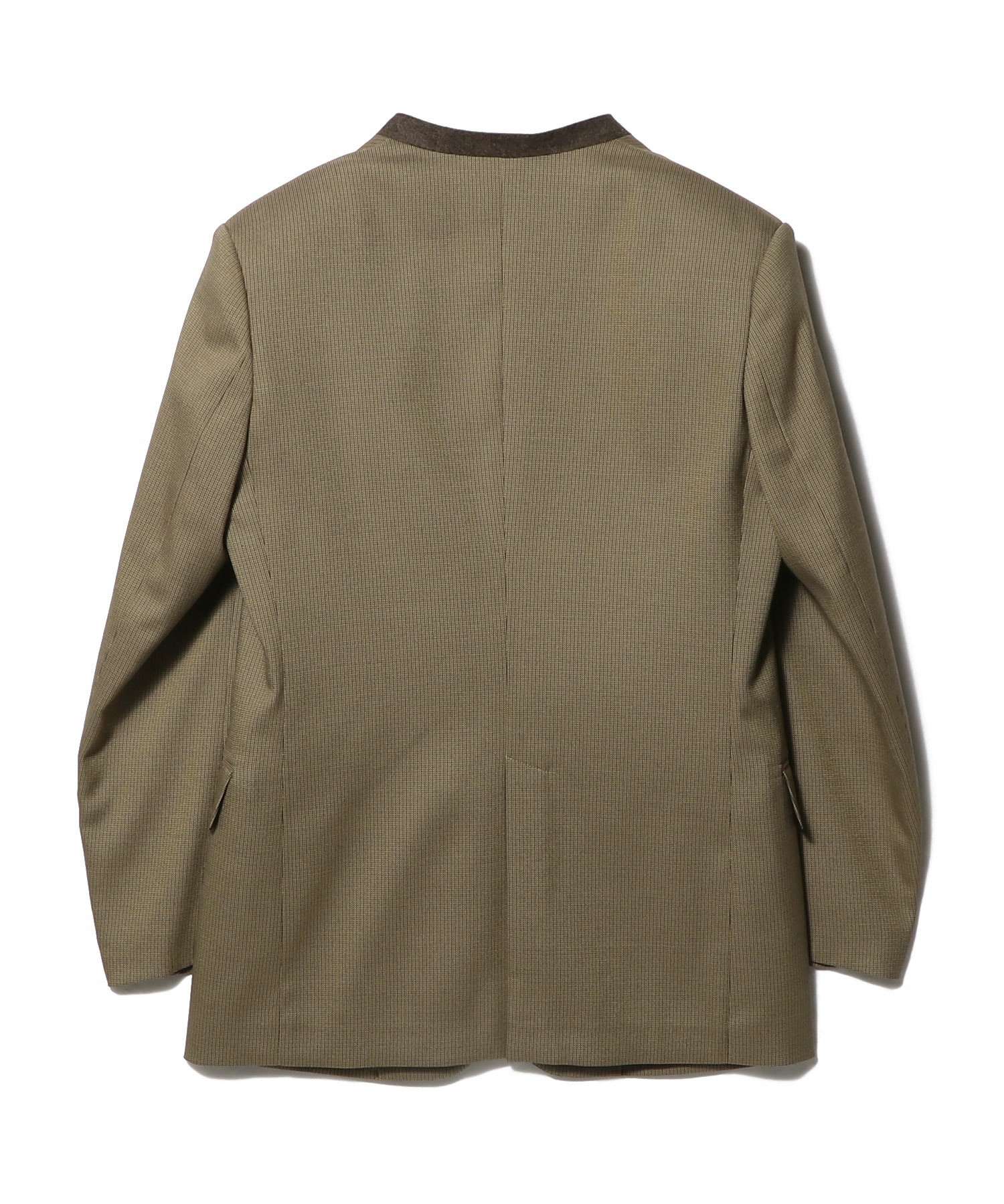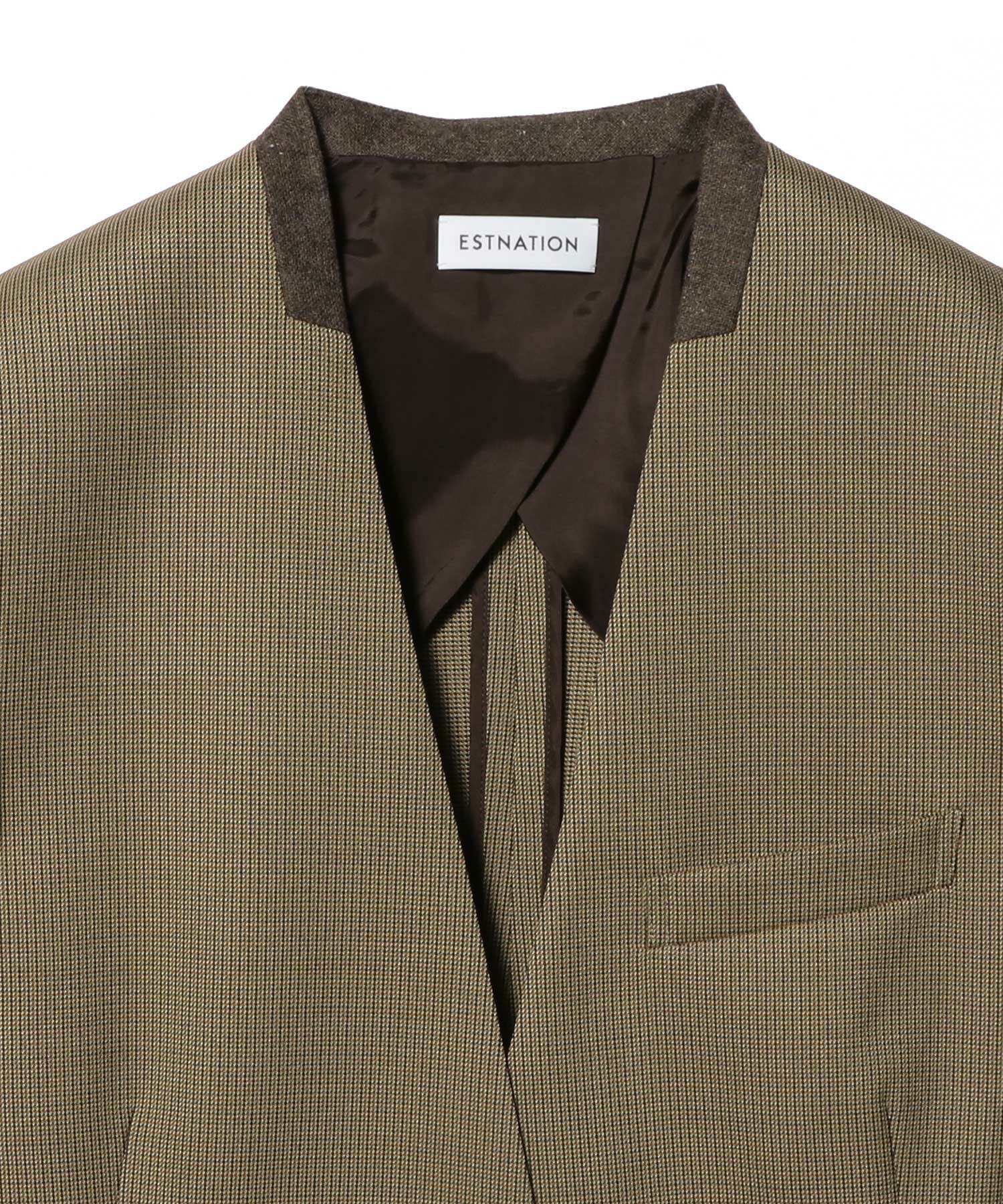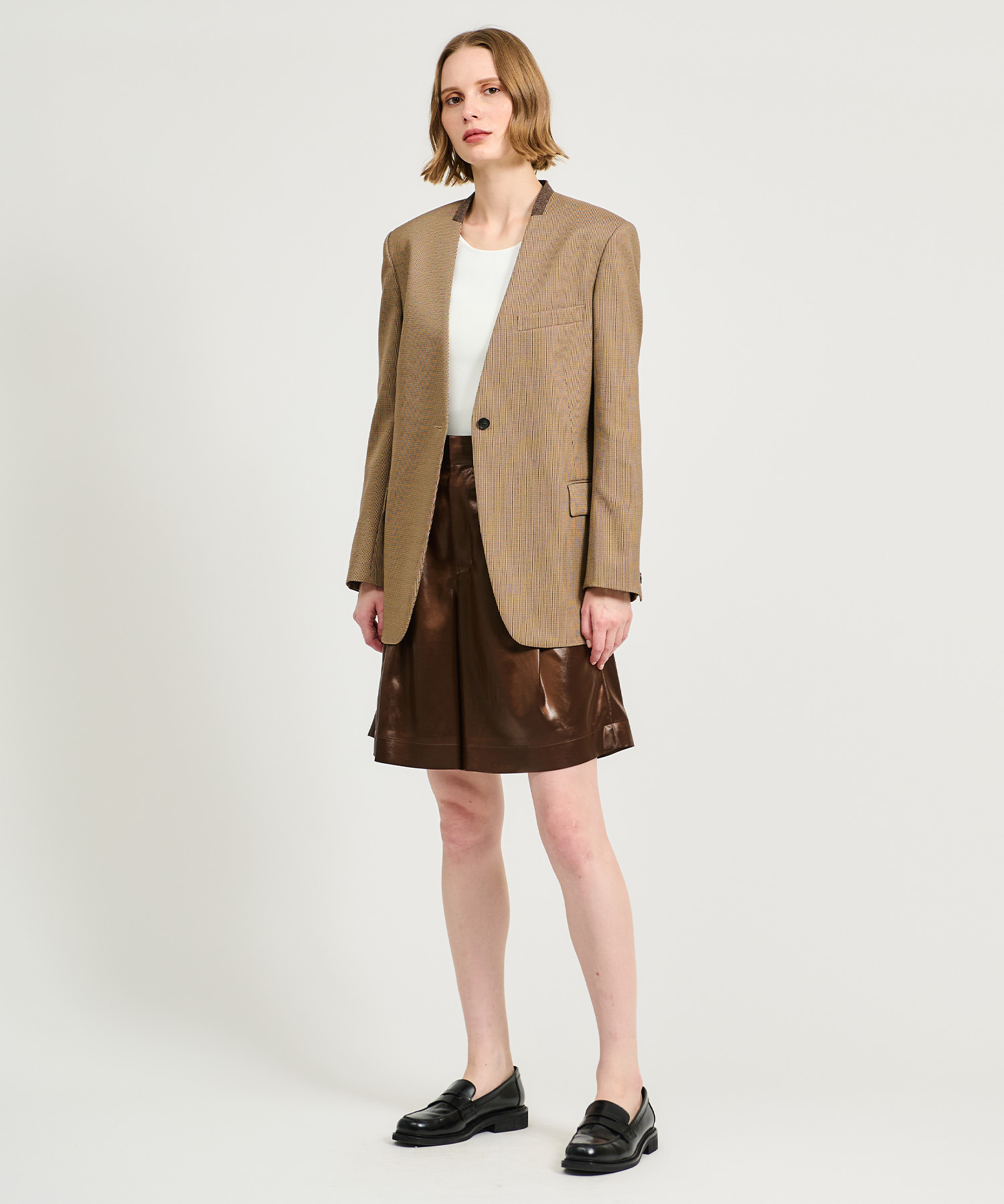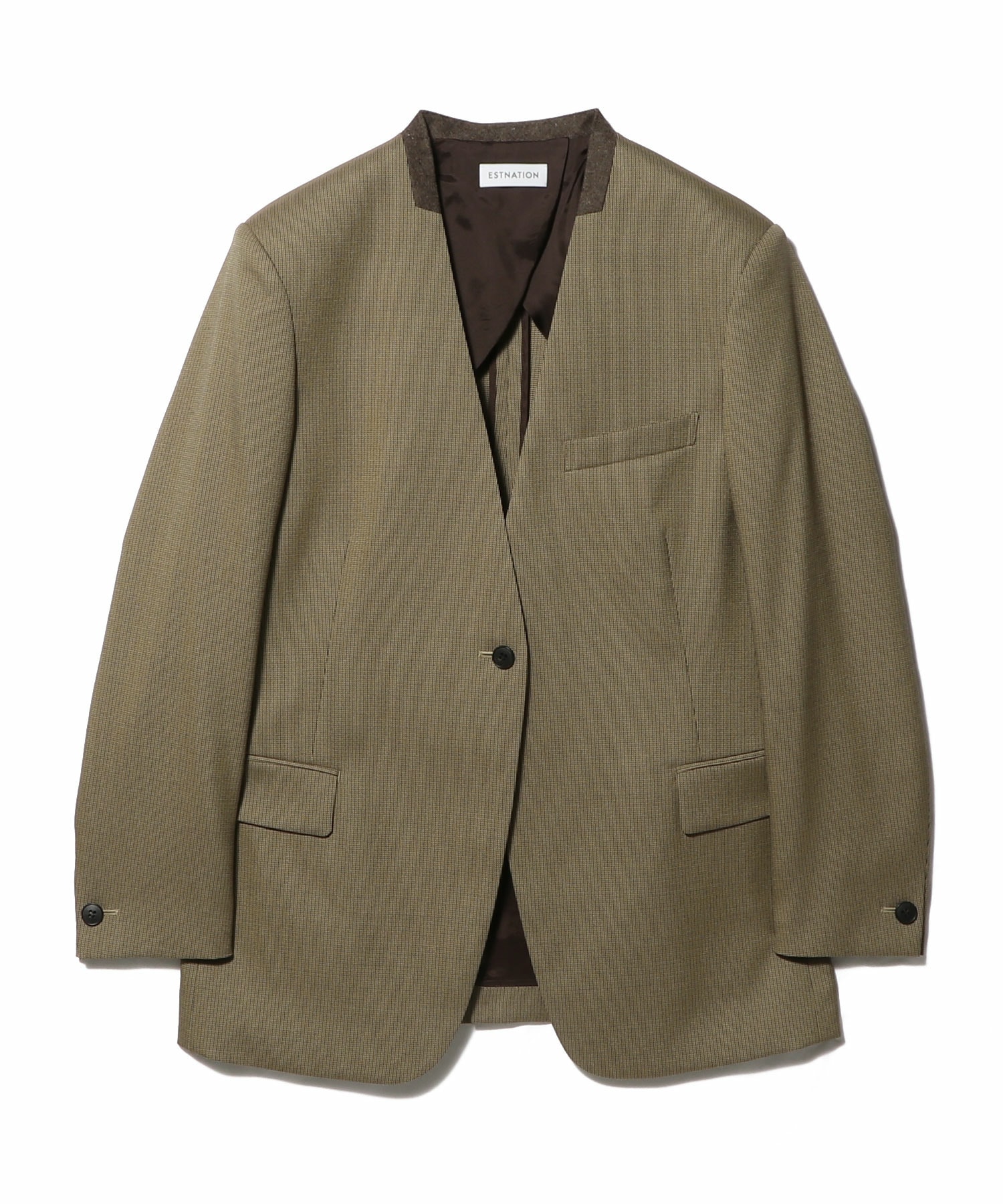 肩をやや大きめに仕立てたリラクシーなシルエットと、ノーカラーのシャープさがマスキュリンな印象のジャケット。