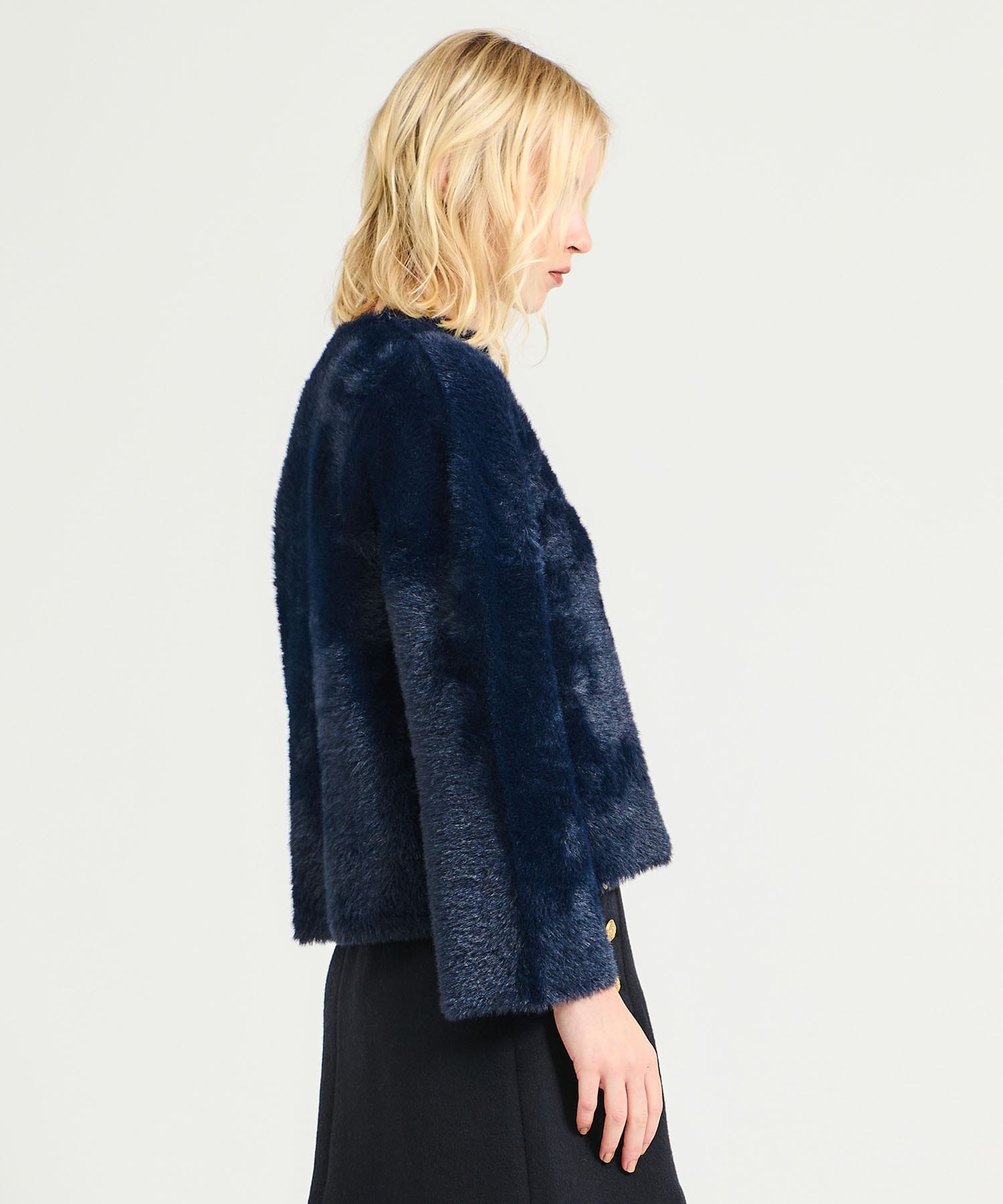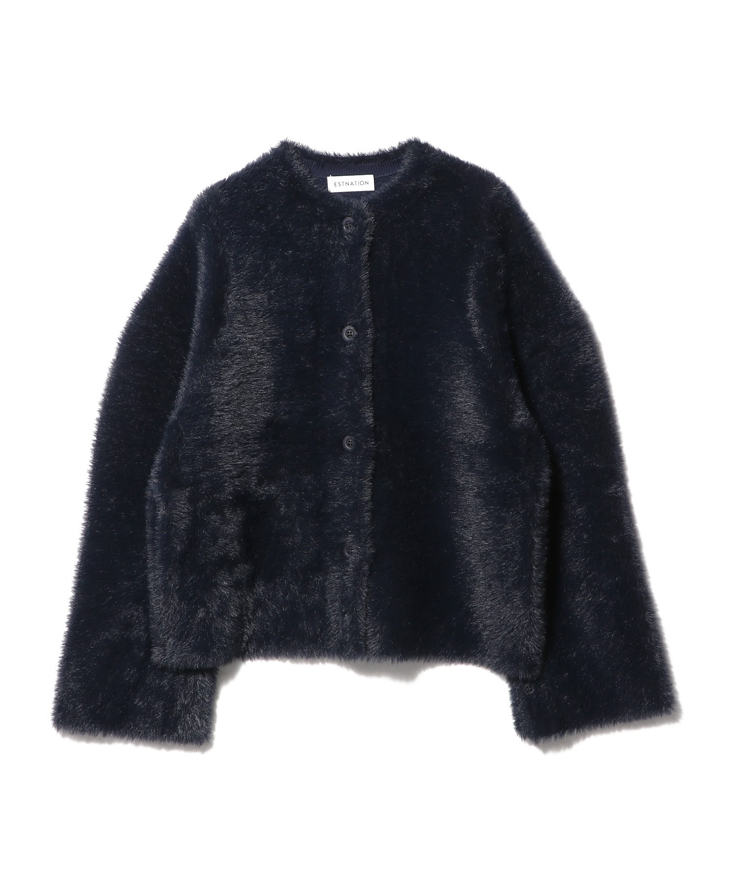 ナイロンファーを表面に、ポリエステルを裏面にしたダブルフェイスの編地を使用。程よく落ち感のある編地で、カーディガンのように羽織りやすい1枚。