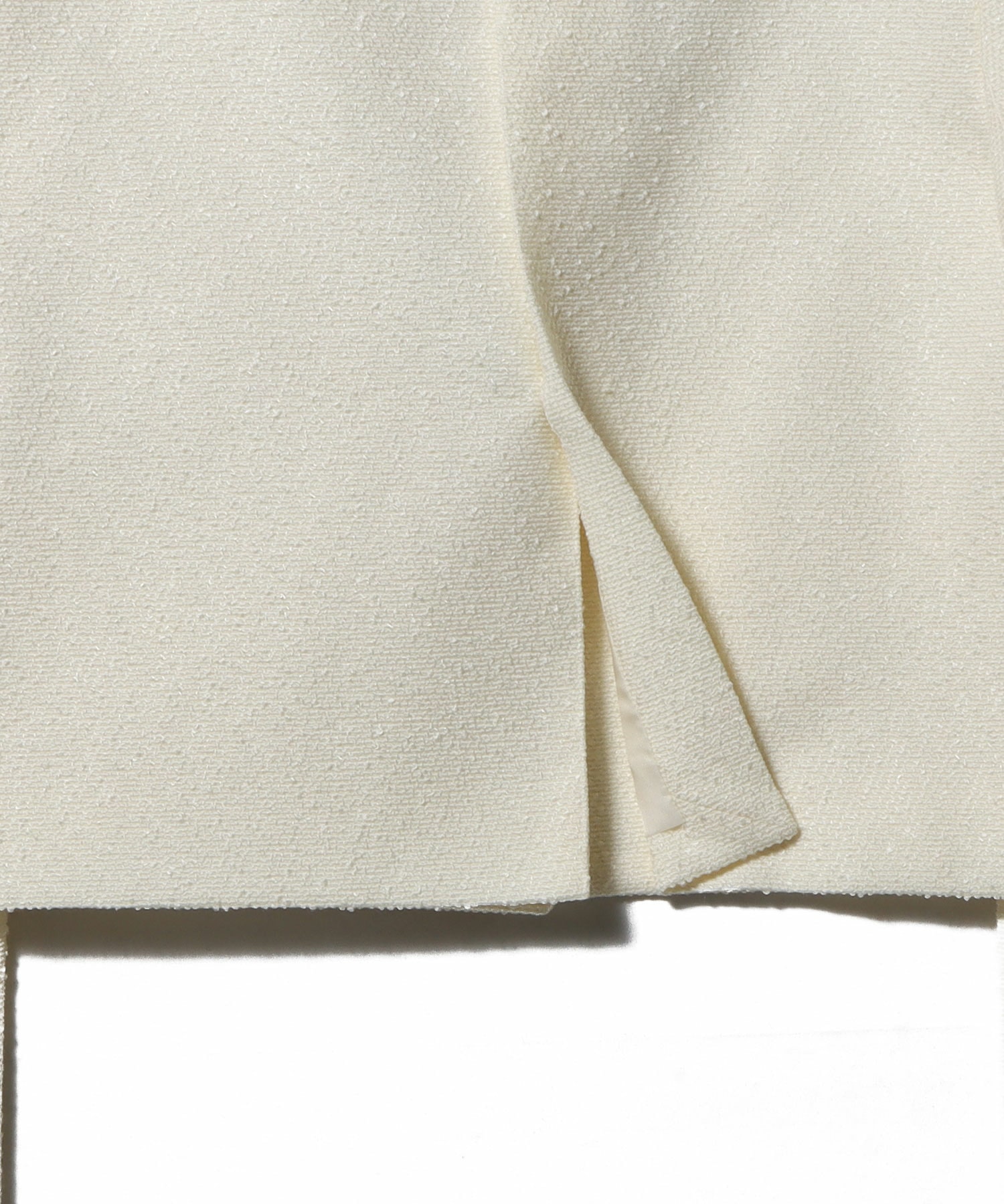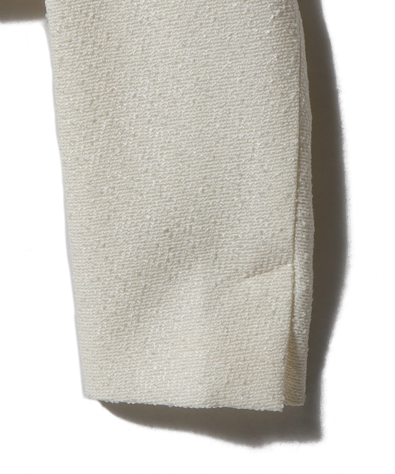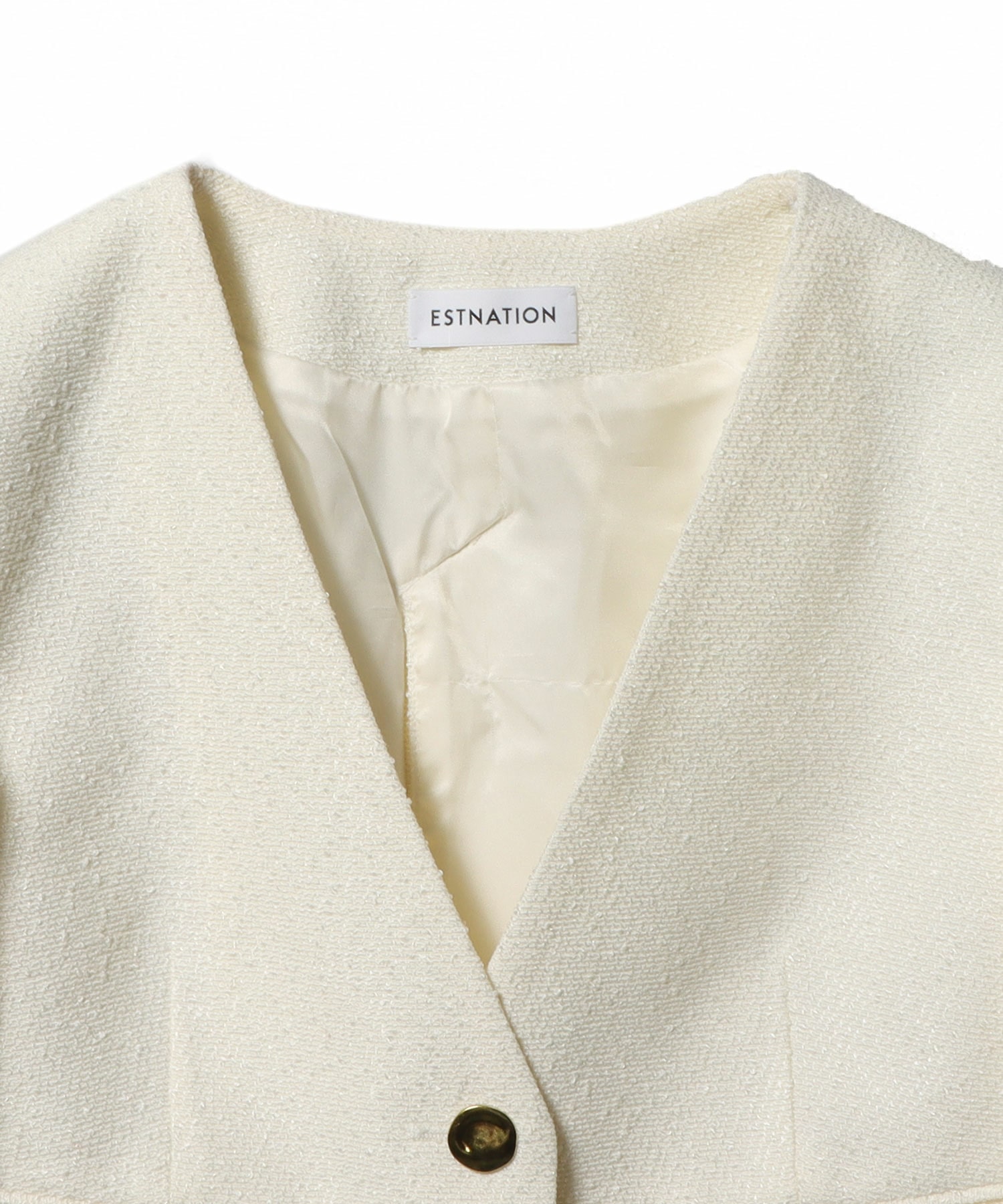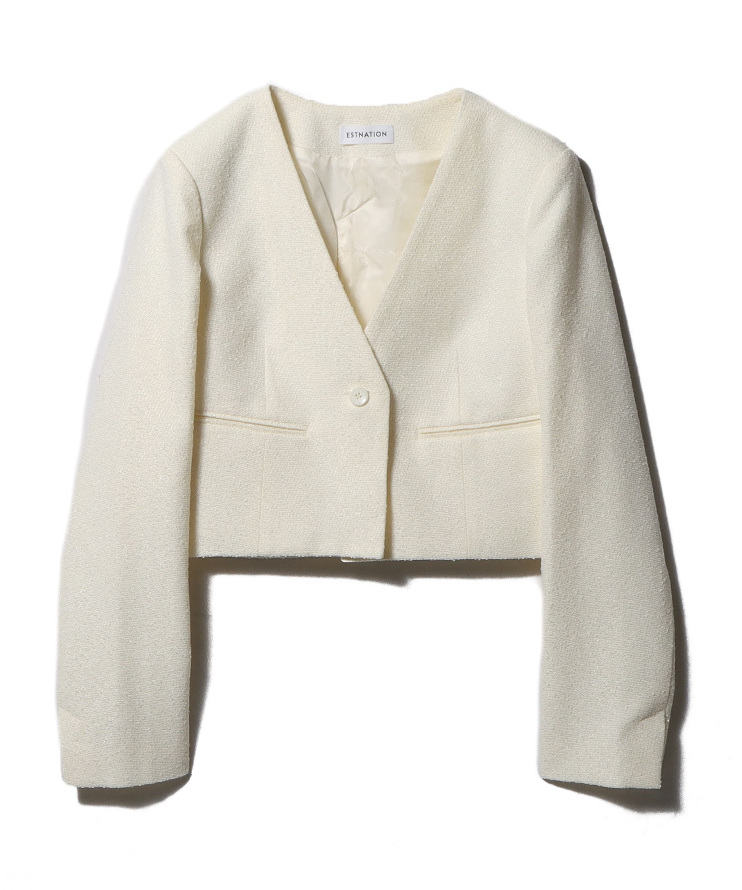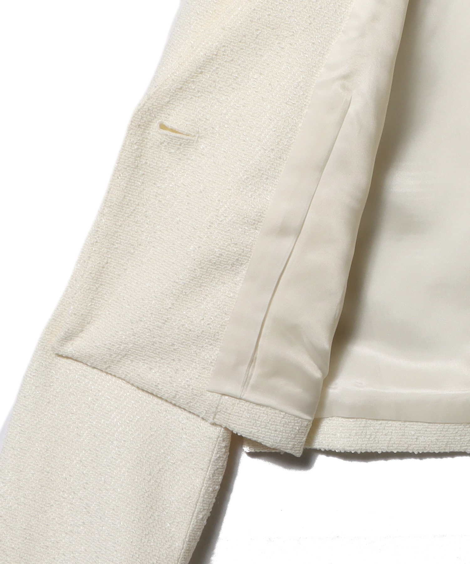 レーヨンチング糸の光沢感が特徴的なリングツイードのノーカラージャケット。