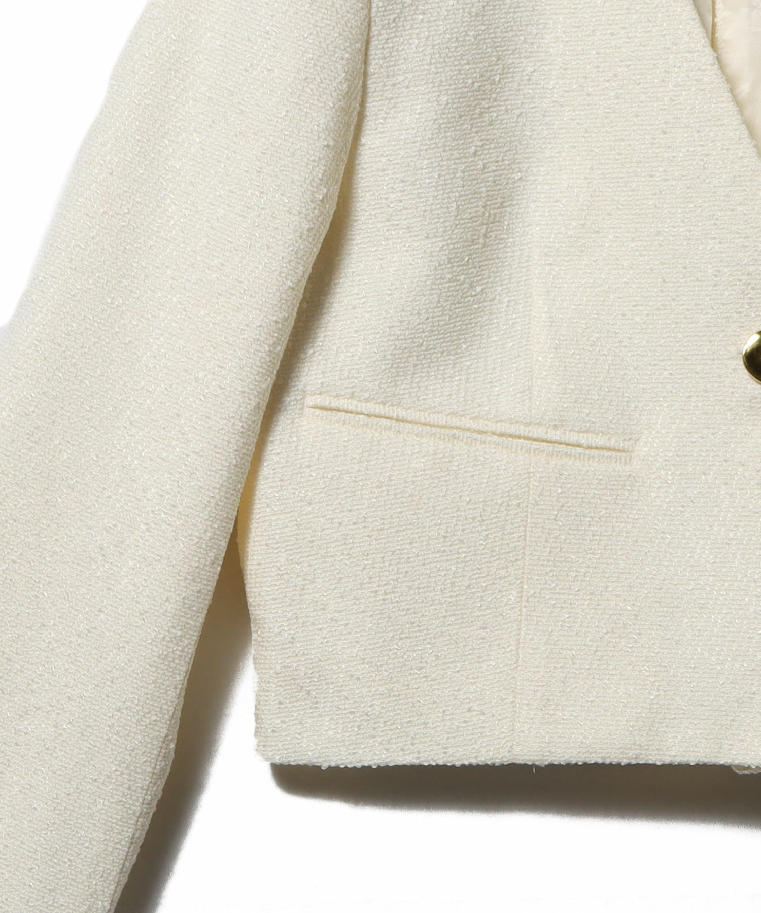深めのVネックがポイントで、ショート丈にすることで軽さを出したデザイン。フロントのボタンはメタルボタンと生地同色のボタンを鼓ボタンにしており、シーンや気分に合わせてボタンを変化することができる2WAY仕様にしています。センターバックには深めのベンツを入れてポイントに。