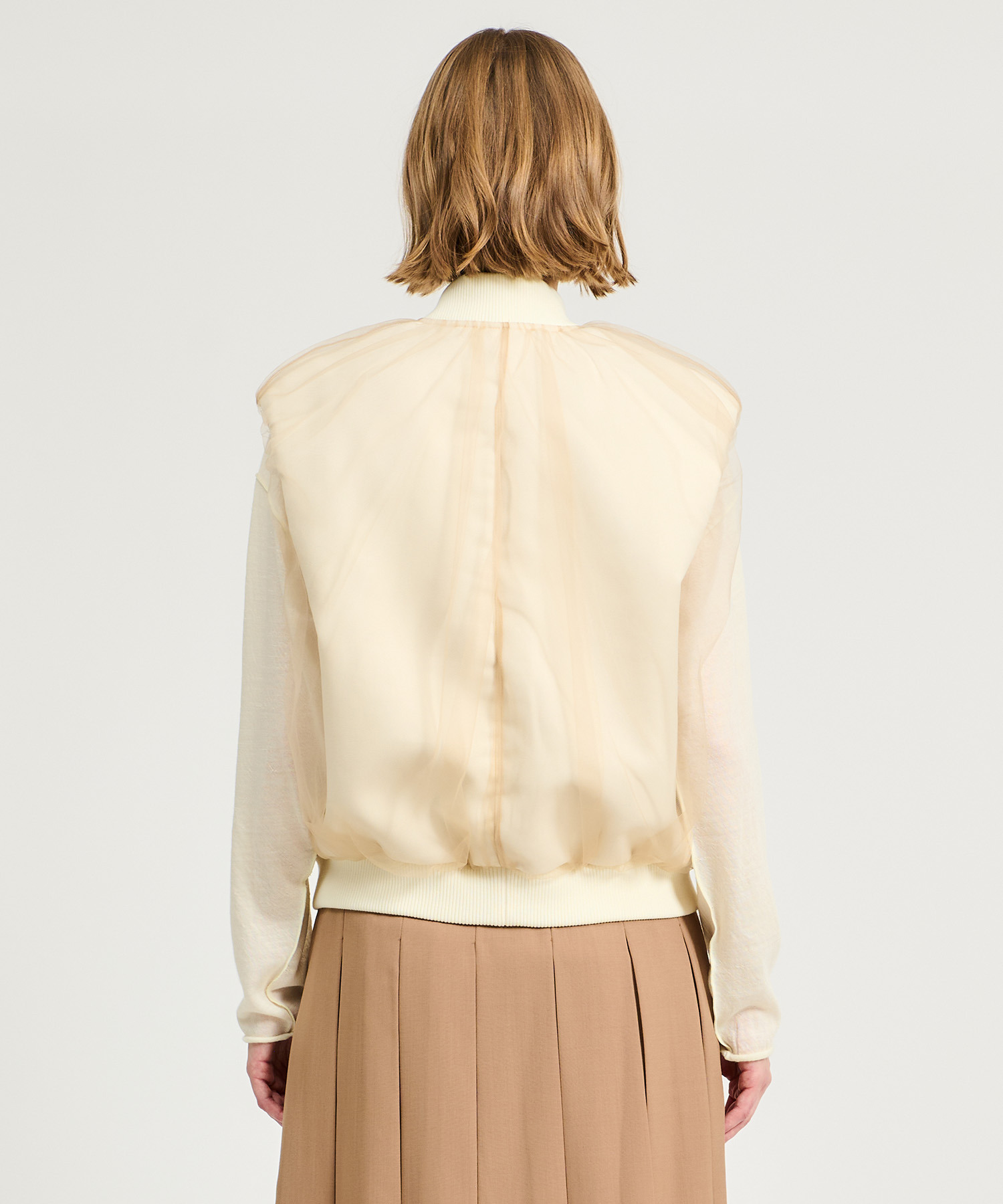 肩先まで隠れたサイズ感で、襟ぐりと裾はリブを使用。ダブルファスナー仕様なので、着こなしに合わせて調整いただけます。