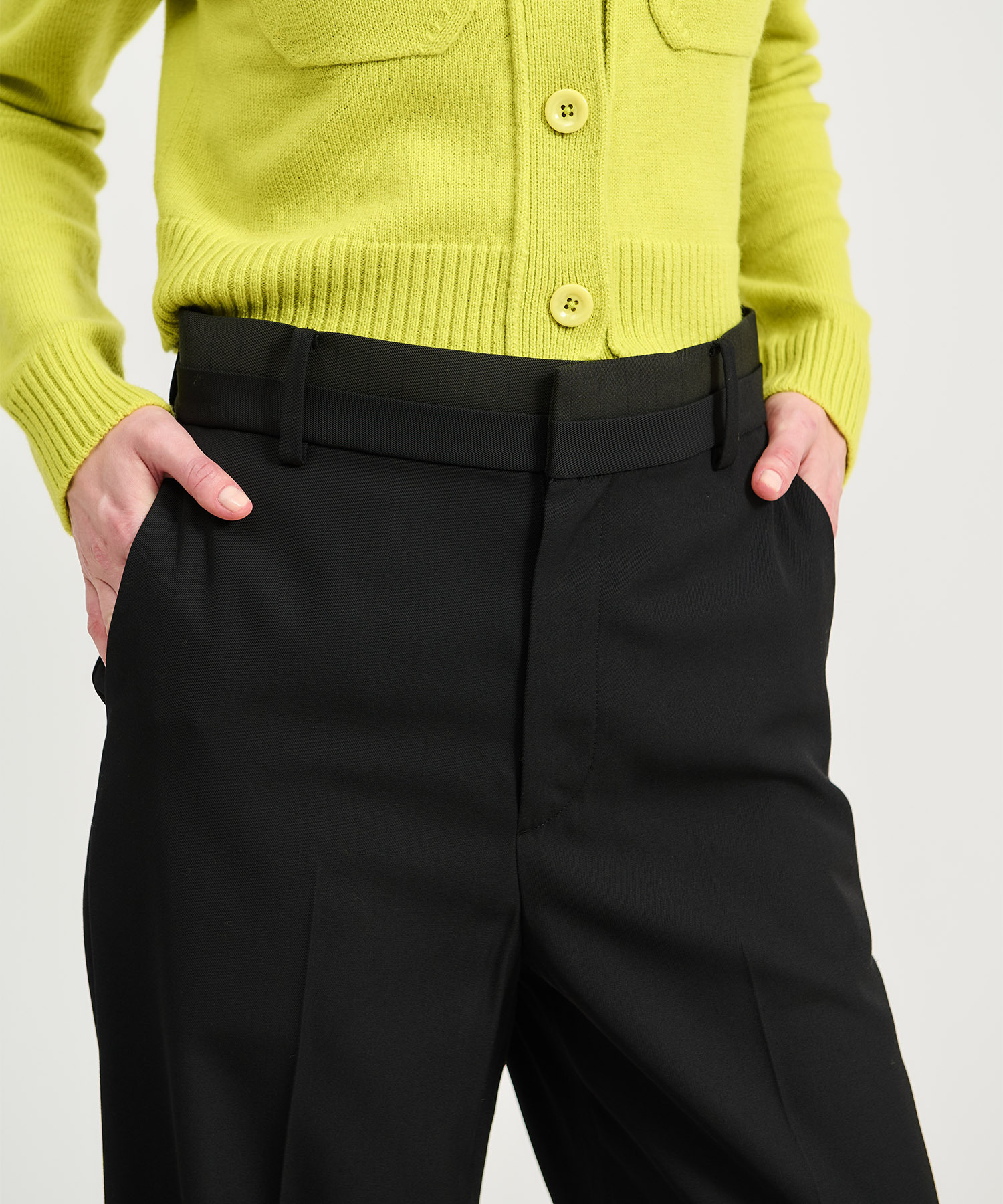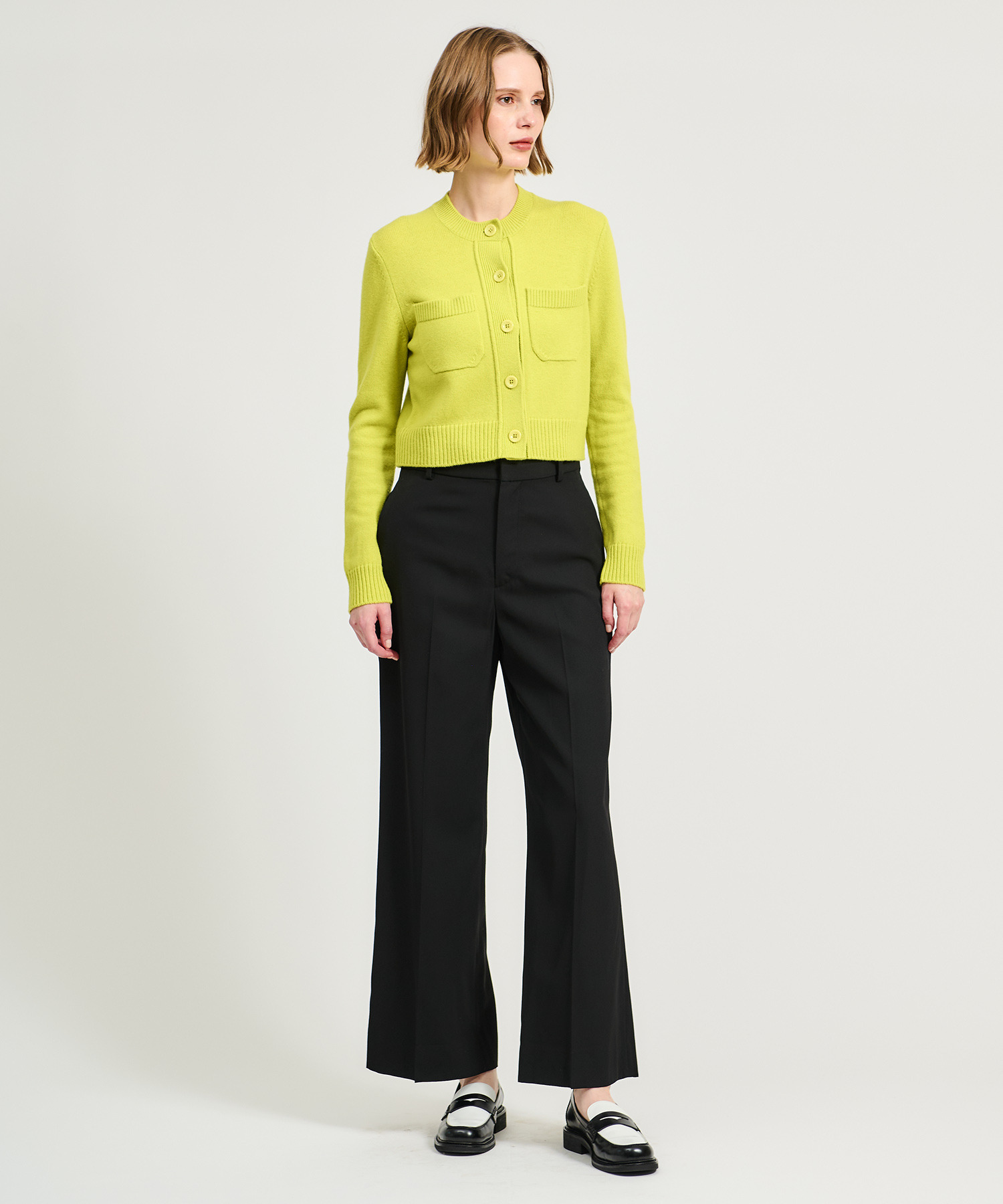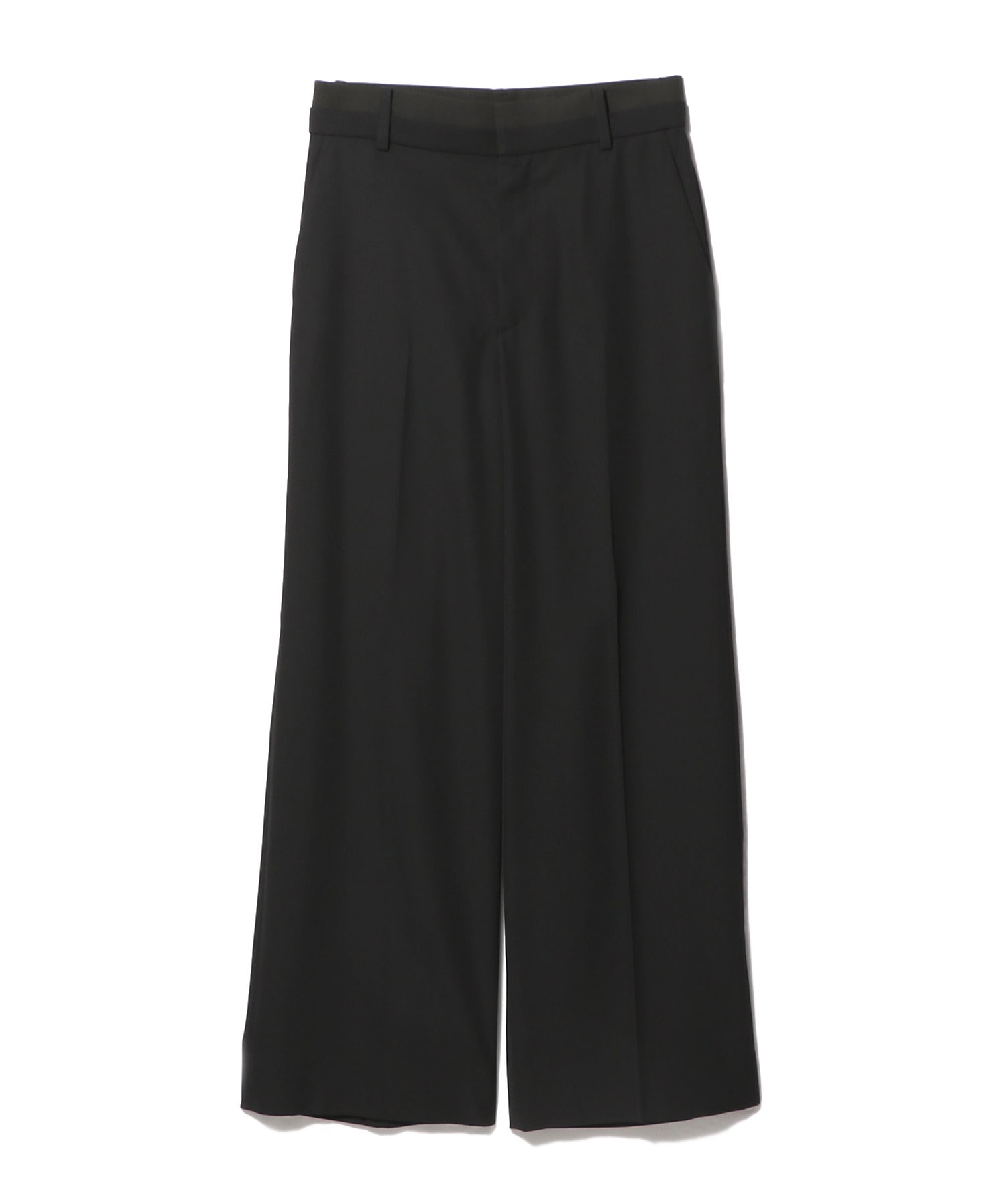 ウールにレーヨンをブレンドし、上品な落ち感とドライタッチな風合いを両立させた素材を使用したストレートワイドパンツ。