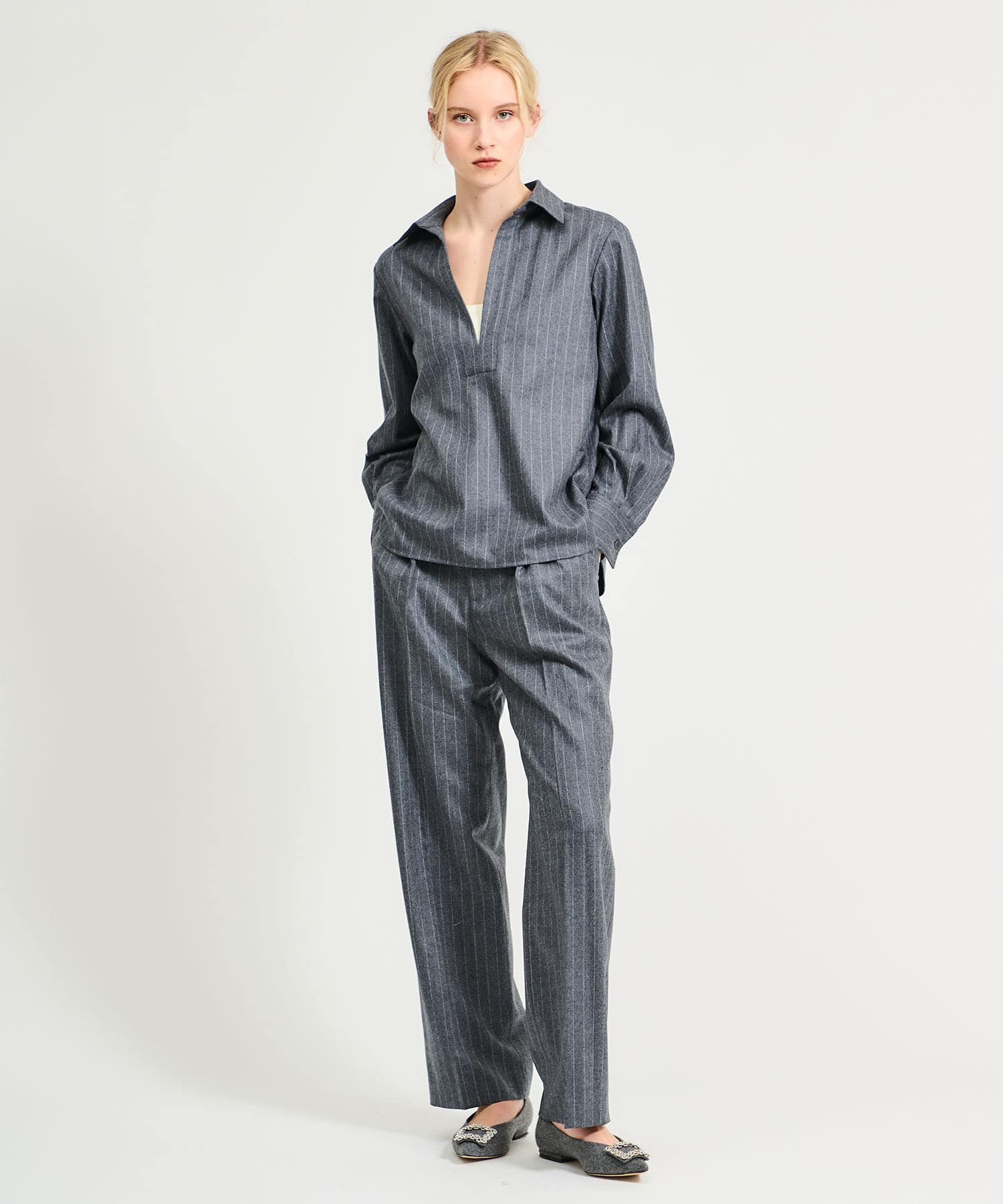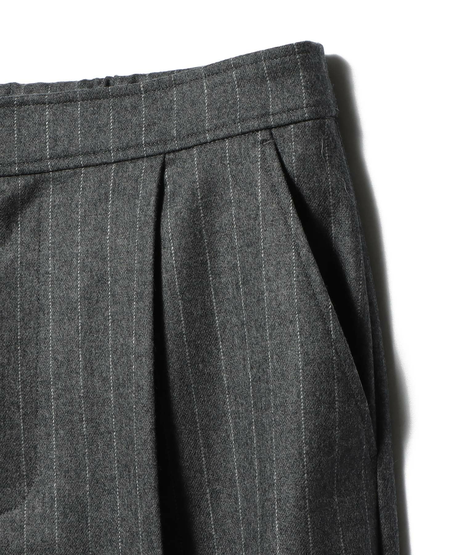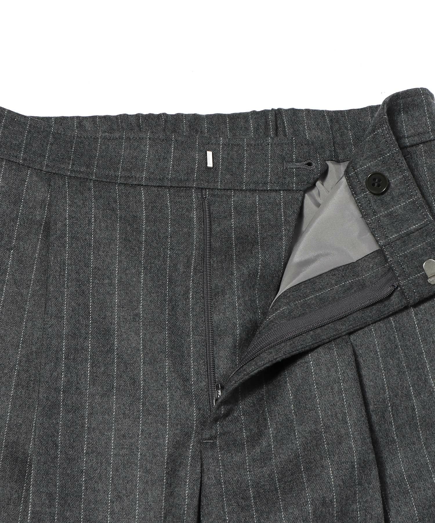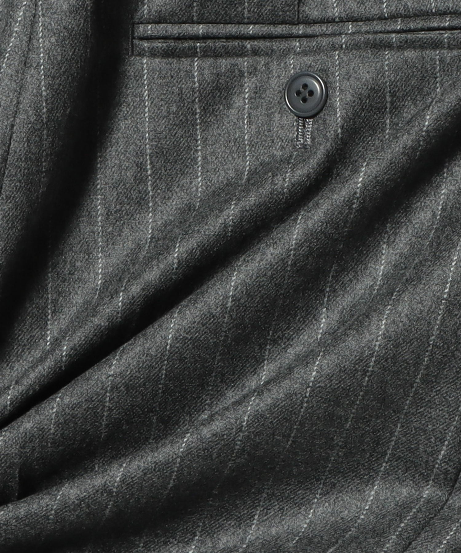 マスキュリンテイストのチョークストライプ柄のウールストレッチサキソニー素材。