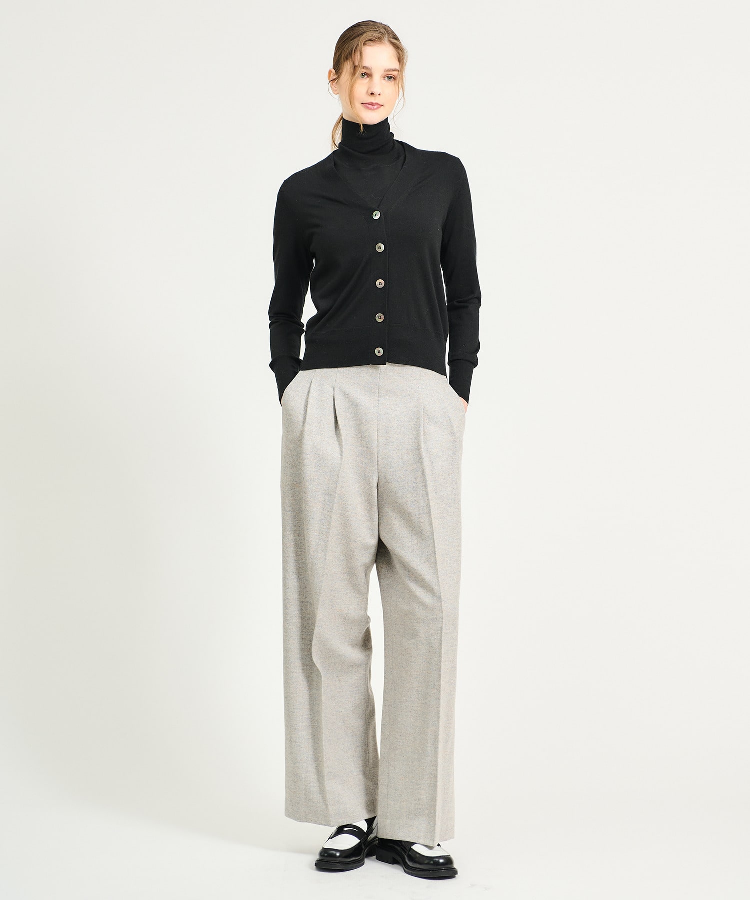 | 素材 | 表地:毛45%、ポリエステル26%、レーヨン15%、ナイロン11%、ポリウレタン3%、裏地:キュプラ100% |