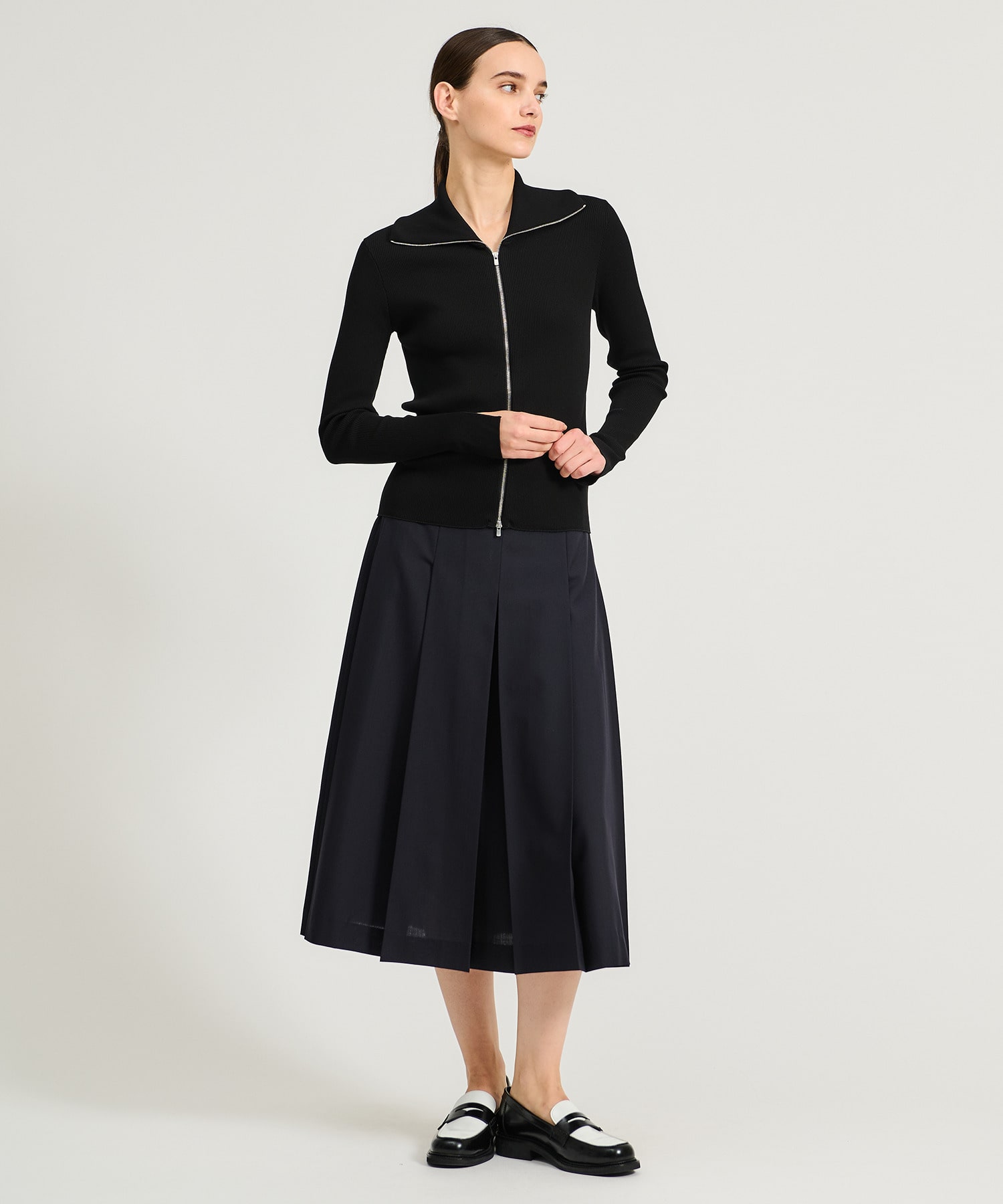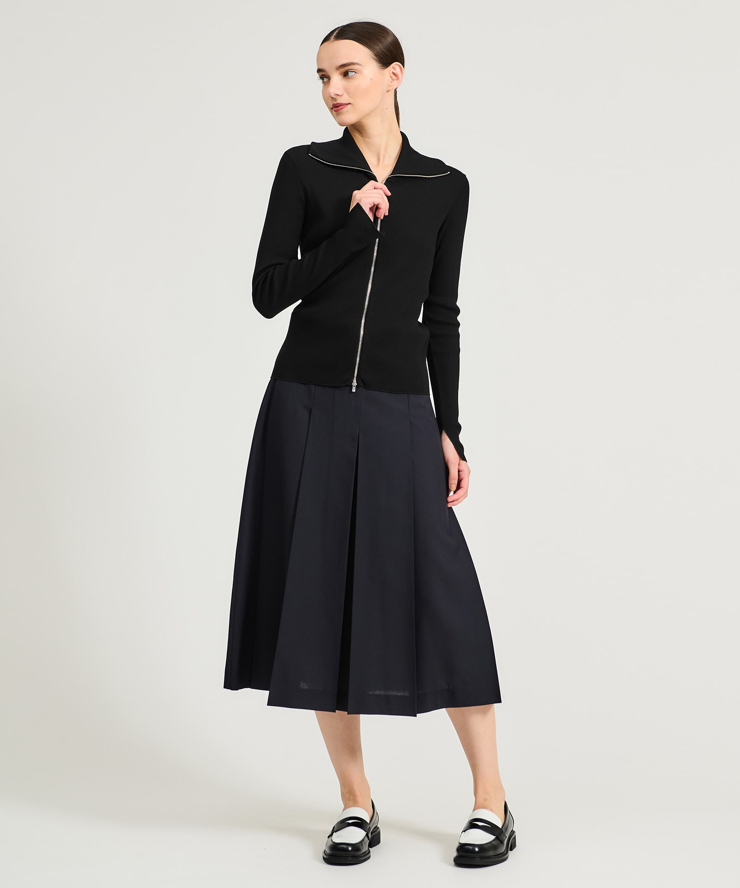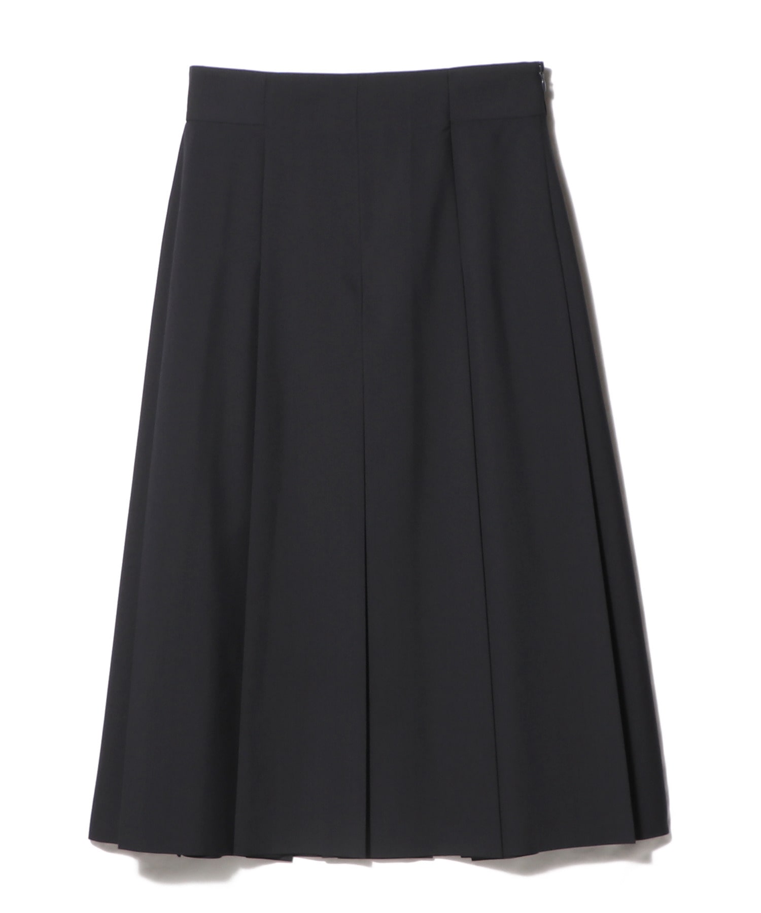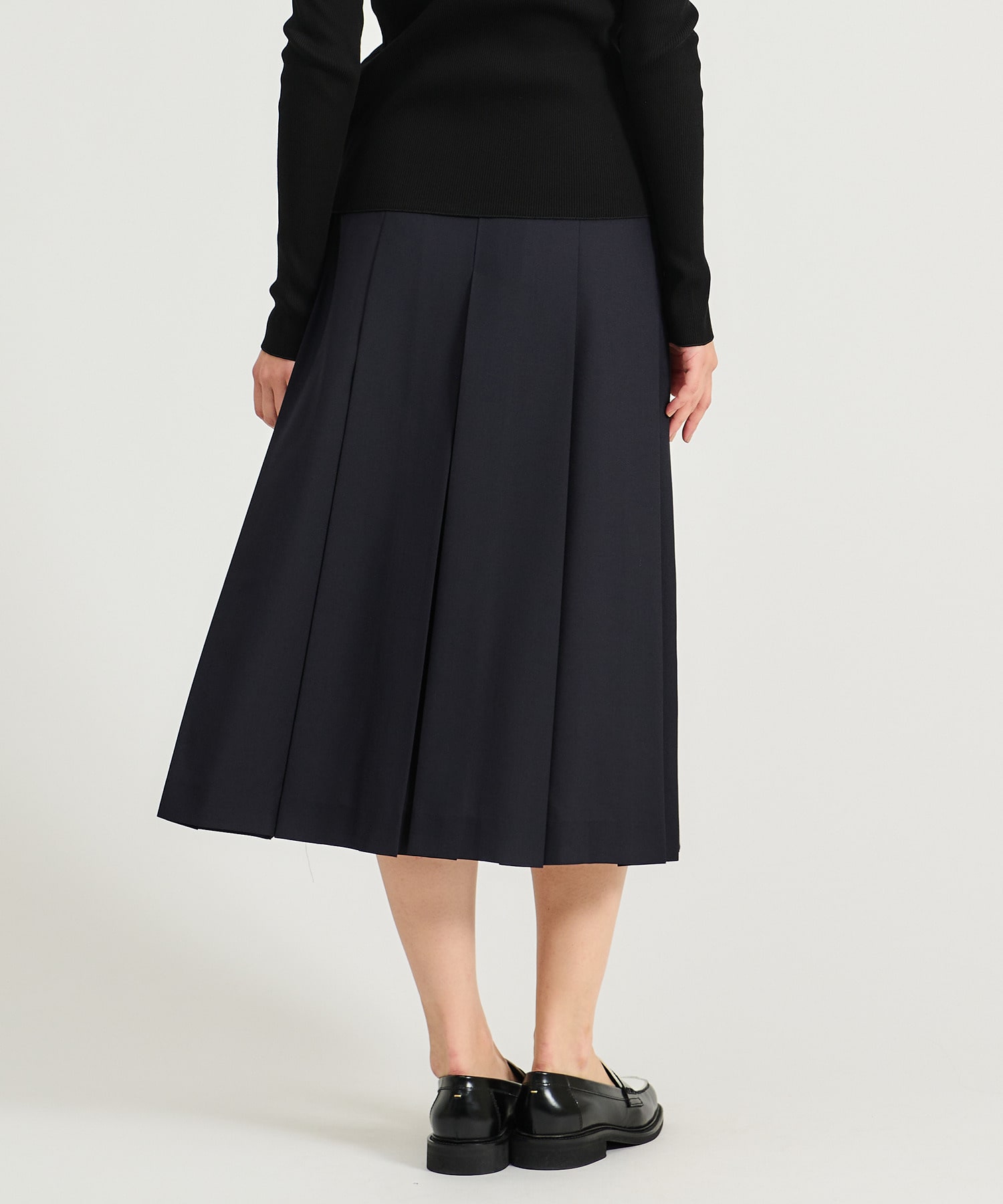 ウエスト位置を高めに設定し、ボックスプリーツを施したプリーツスカート。