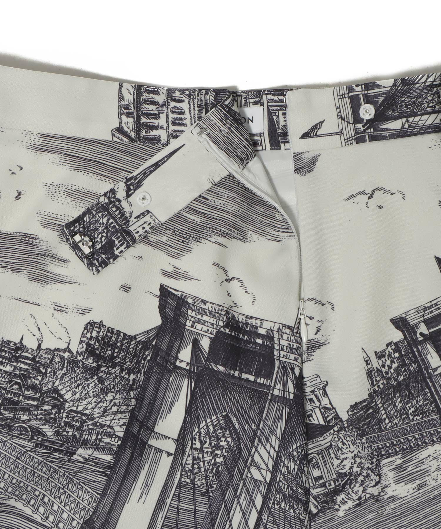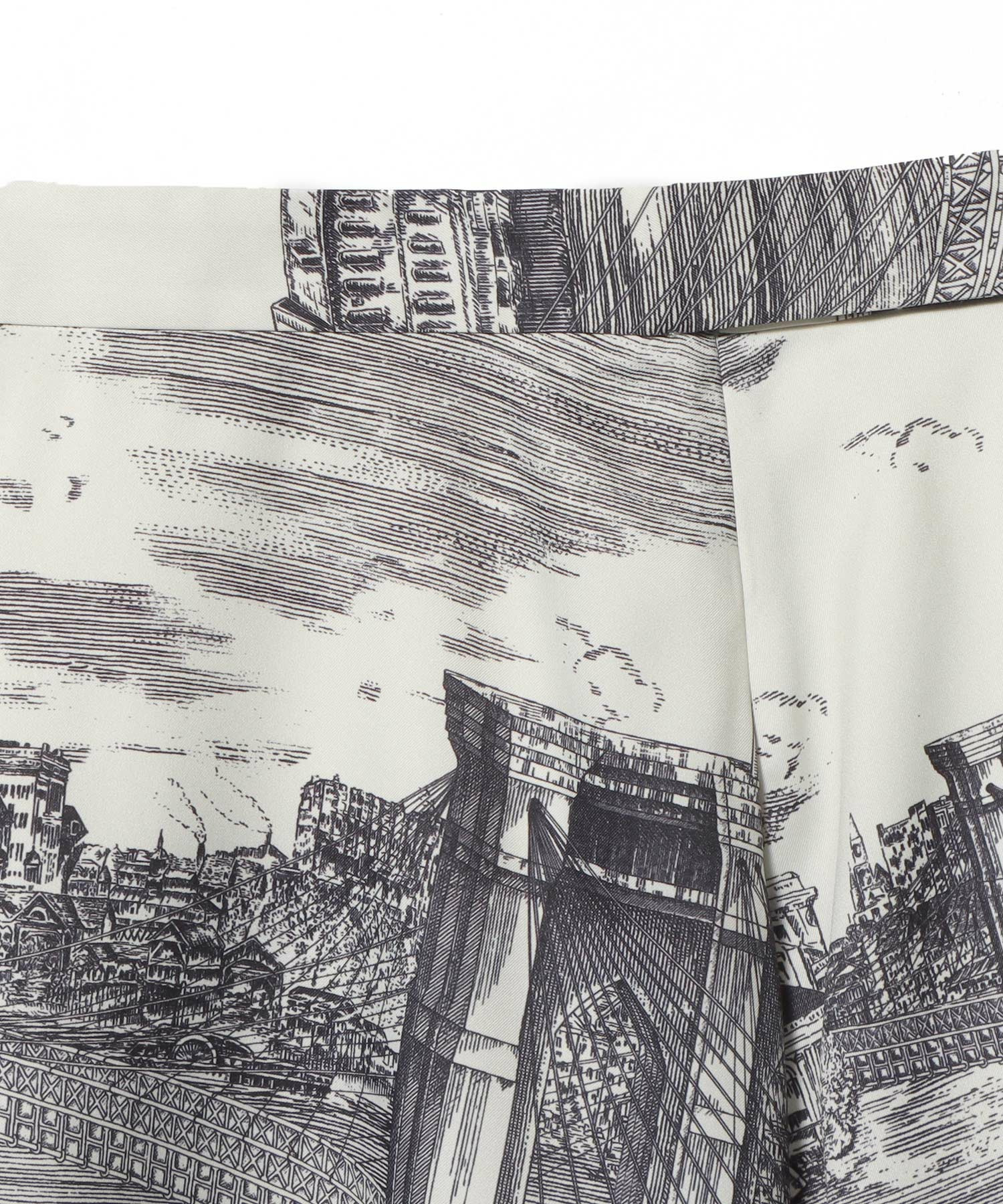 パネル柄を活かしたイレギュラーヘム、バイアスカットのフレアーなので、女性らしいシルエットが印象的。